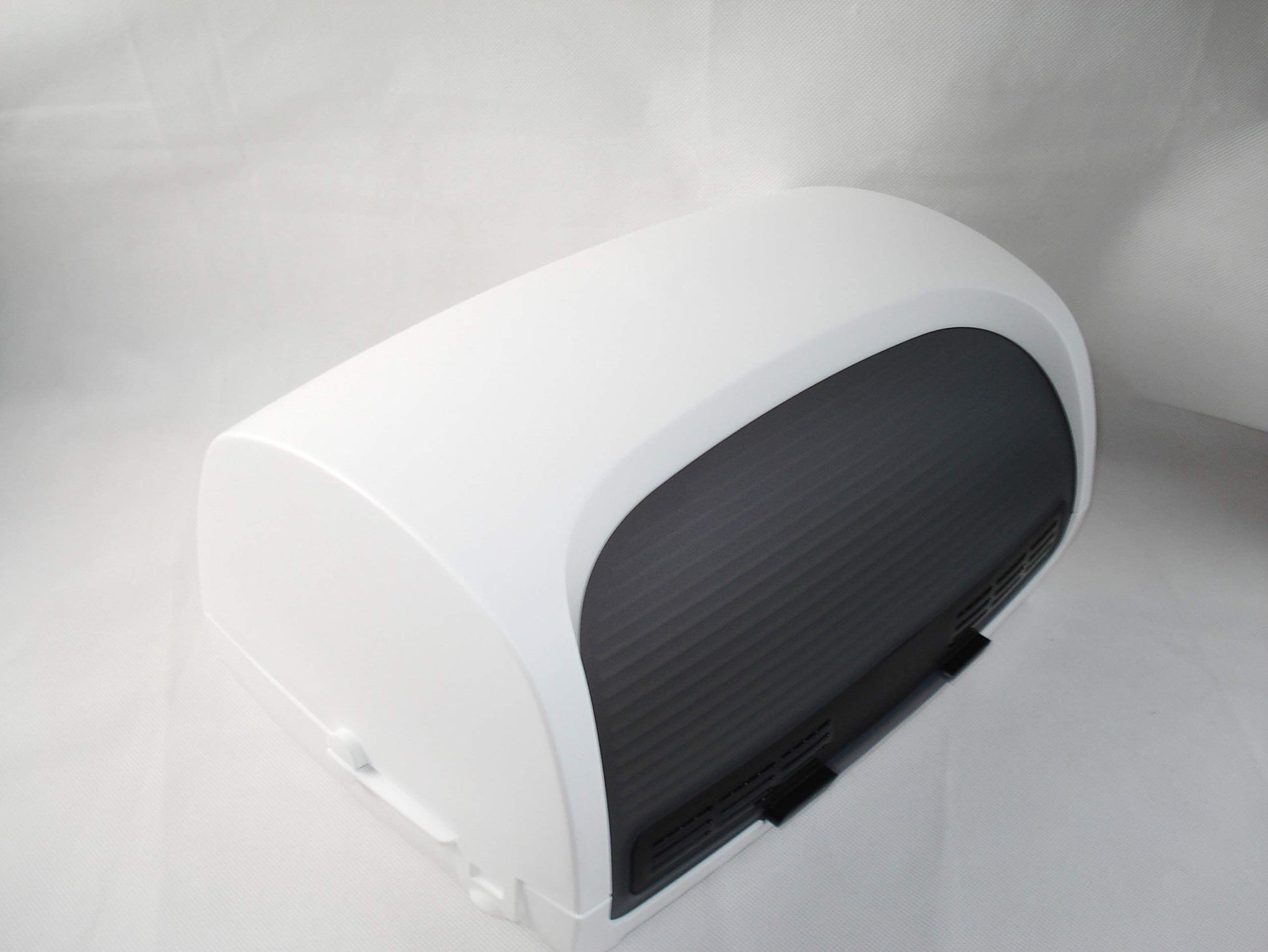 Tupperware bread box, lunch box, rectangular, white, black, 39.8 x 27.5 x 19.6 cm, 19,237.2 cubic centimeters, bread, bread box, food storage container.