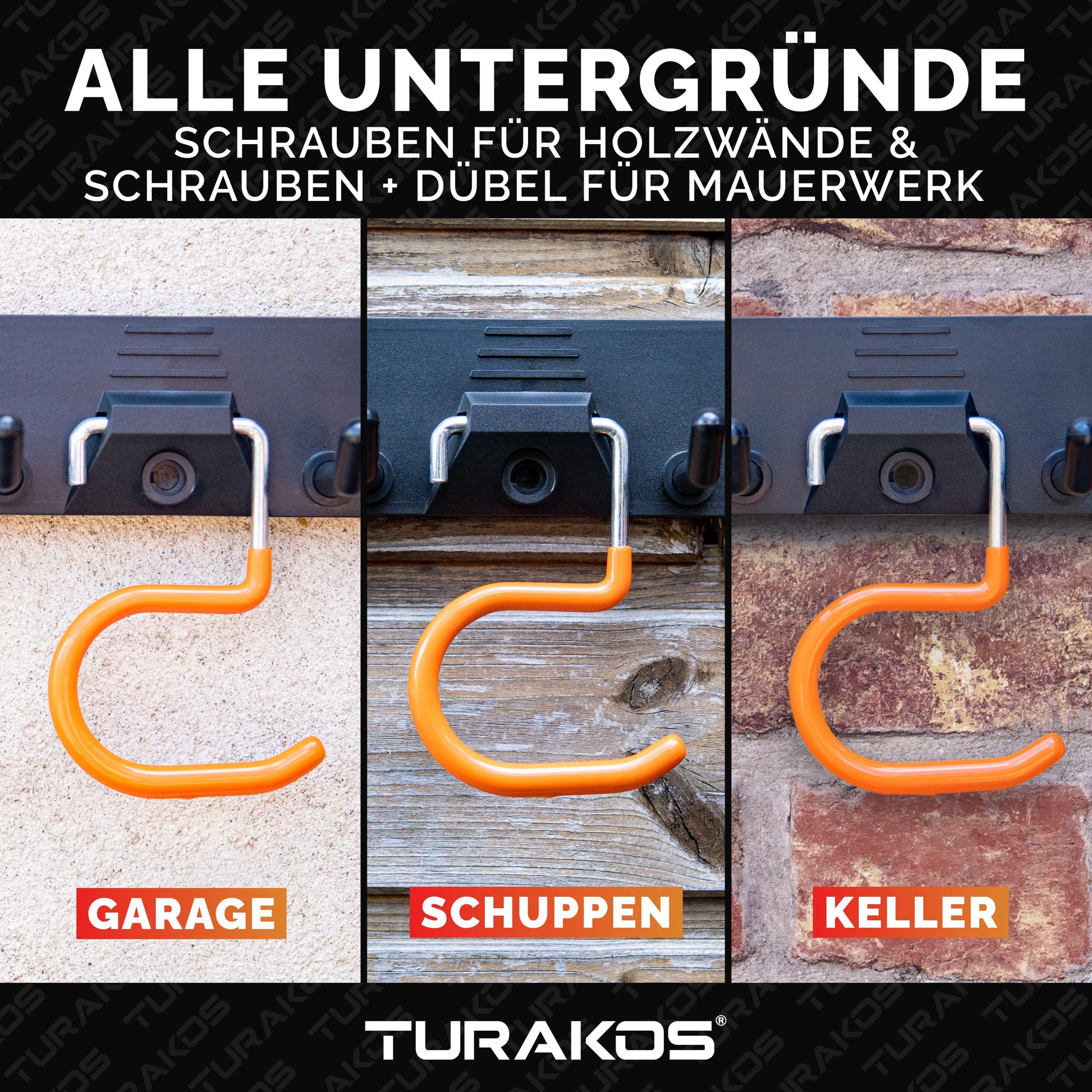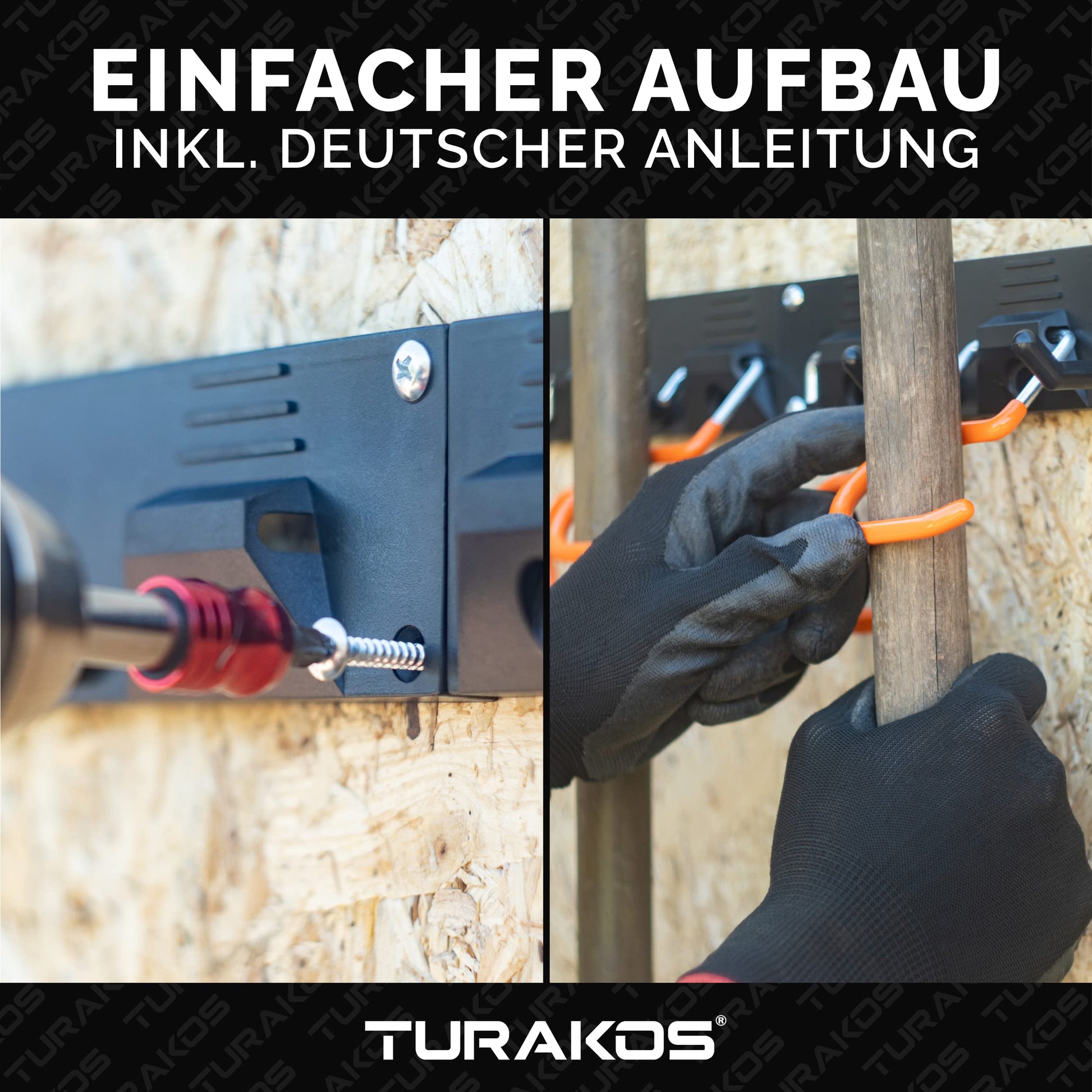["IDEALER GARTENGERÄTEHALTER | The TURAKOS tool wall mount is perfect for storing your garden tools neatly and space-saving in the garage or tool shed. The appropriate wall hooks for garden tools hanging for home, yard, garden, and workshop!", "ANTI-RUST GUMMIERUNG | The 20 tool hooks have a durable, strong adhesive rubber coating. The hooks use the force of gravity, allowing the tool handles to wedge in place and withstand vibrations without any issues.", "PASSENDE SCHRAUBEN/DÜBEL | The tool holder comes with screws and anchors for every application. Included are 20x 45mm screws + 20x 40mm anchors for masonry and 20x 30mm screws for wooden walls. Mounting on hollow walls is not recommended.", "BIS ZU 160CM ERWEITERBAR | The garden tool holder consists of four individual tool strips, each measuring 40cm. These can be used individually and closed off with matching end pieces, or connected together to extend up to a total of 160cm.", "ZUFRIEDENHEITSGARANTIE | We are confident that the TURAKOS tool holder is the ideal garden accessory. With the included illustrated instructions, you can easily install your garden tool holder in no time at the desired location. See for yourself!"]