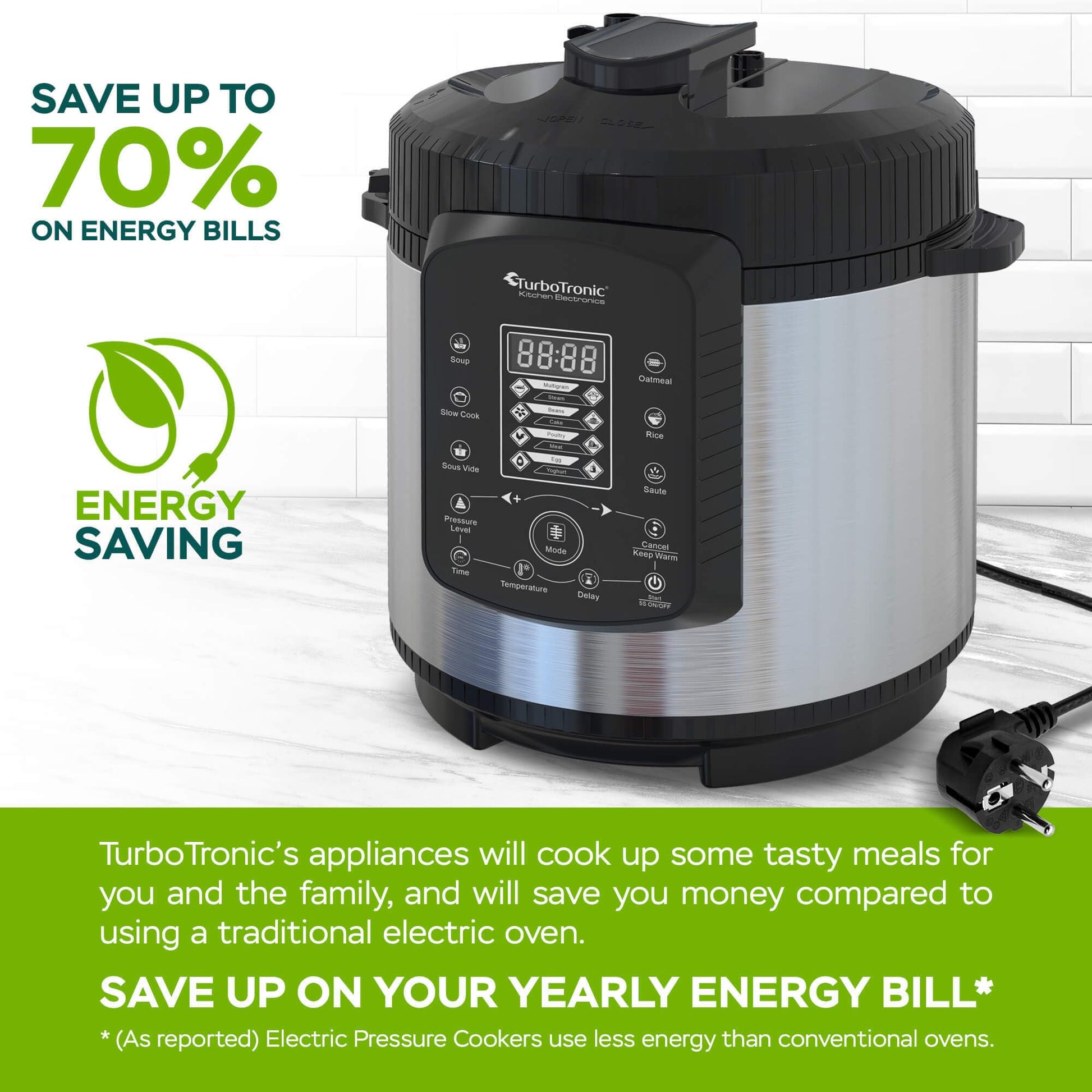 TurboTronic Pressure Cooker 6L with 2x stainless steel and coated pot, steamer, multi cooker, electric pressure cooker, steam cooker Silver