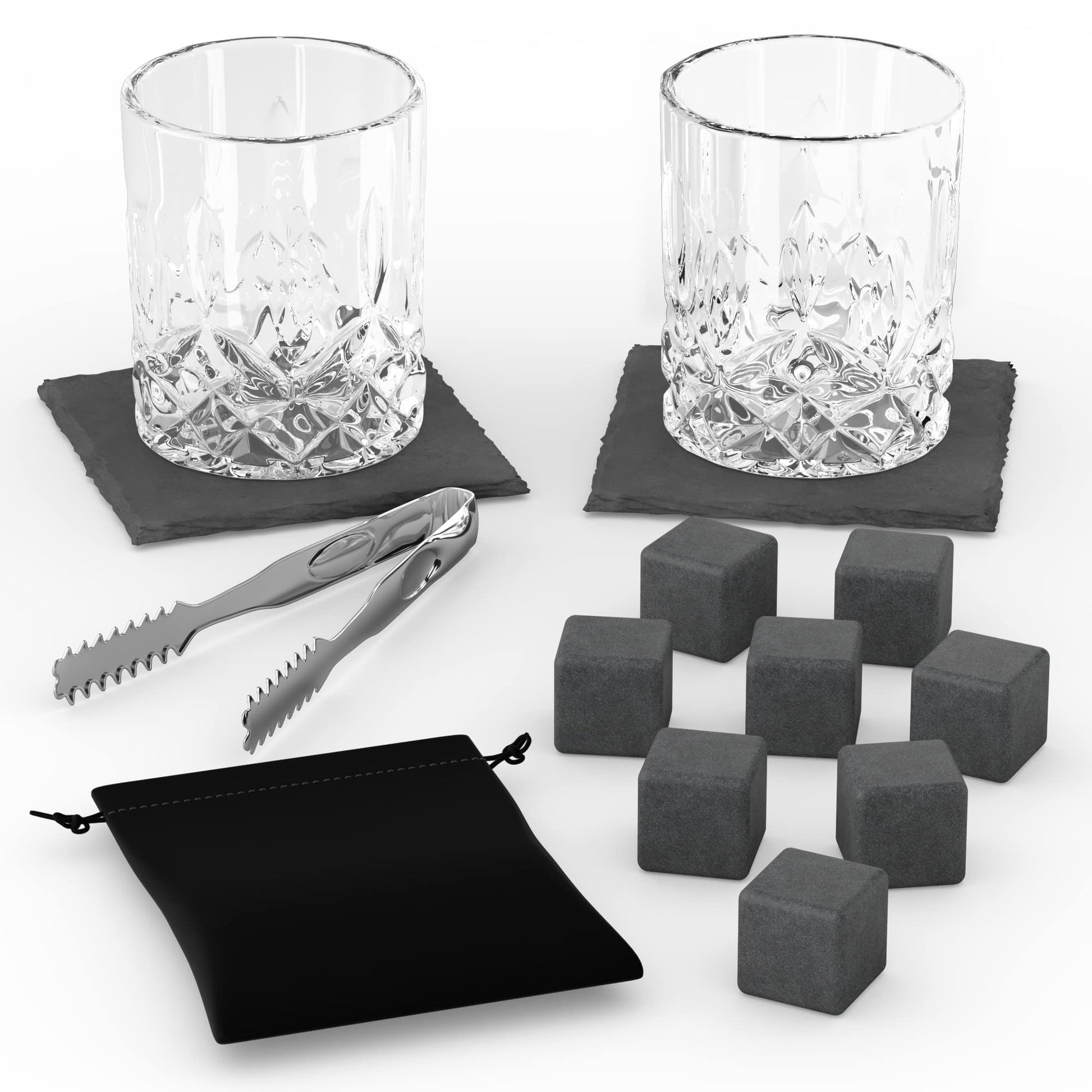 Twhisky Premium Whisky Glasses Gift Set - 2 Whiskey Tumblers 300 ml, 8 Reusable Whisky Stones made of Basalt, 2 Slate Coasters, Tongs & high-quality Gift Box