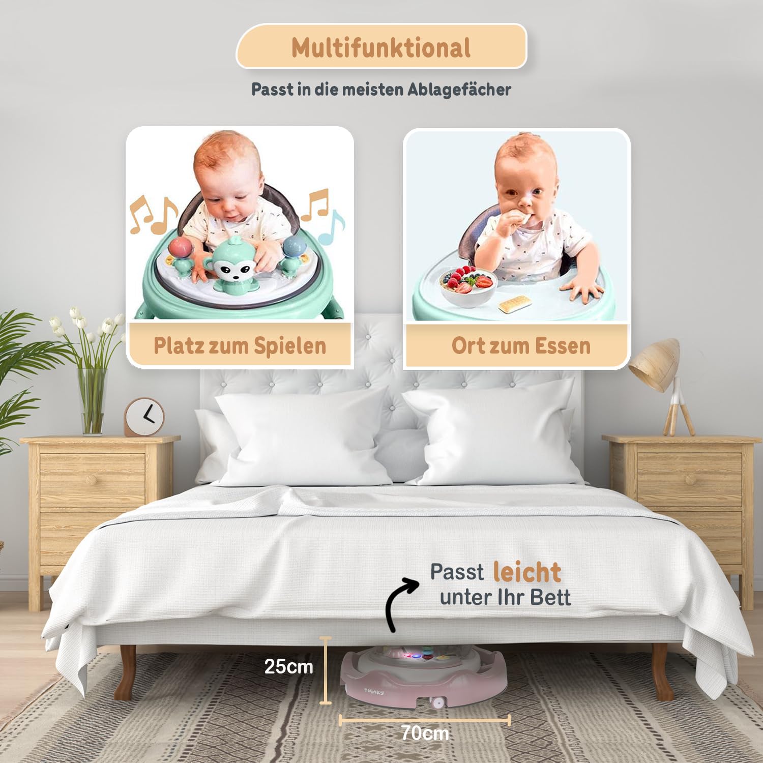 "FULLY ADJUSTABLE: The baby walker is completely foldable, making it extremely space-saving. With its adjustable seat height, this walker grows with your child and always offers optimal comfort. This baby walking aid is perfect for any home, no matter how large or small the available space is."
