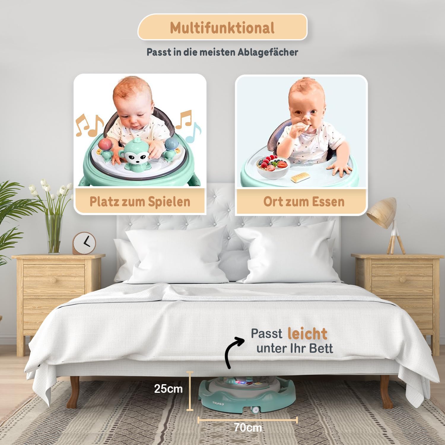 ["LEARN TO WALK SAFELY: Our baby walker provides maximum safety for learning to walk. Thanks to the generous frame, your child can learn to walk safely without collisions or falls. This baby walking aid is ideal for teaching your child to walk carefree and promoting their motor skills in a playful way.","FULLY ADJUSTABLE: The baby walker is completely foldable, making it extremely space-saving. With its adjustable seat height, this walker grows with your child and always offers optimal comfort. This baby walking aid is perfect for any home, no matter how big or small the available space is.","WASHABLE SEAT: The easily removable and washable seat of the baby walker makes cleaning up spilled food or drink easy and efficient. This baby walking aid always remains hygienic and ready for the next use. Ideal for families with babies from 6 months old who need a durable and easy-to-care-for product.","FLEXIBLE WHEELS: The flexible wheels of the baby walker prevent blockages and allow smooth movements on different floor surfaces. This baby walking aid from 6 months ensures smooth and safe progress. Your baby walker always remains easy to steer and offers pleasant walking training.","PERFECT FOR MEALTIME: The baby walker can easily be transformed into a small dining table by removing the playset. This baby walking aid offers versatile usability and is perfect for meals. The baby walker allows your child to eat safely and comfortably while remaining in an upright position."]