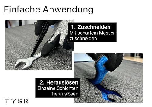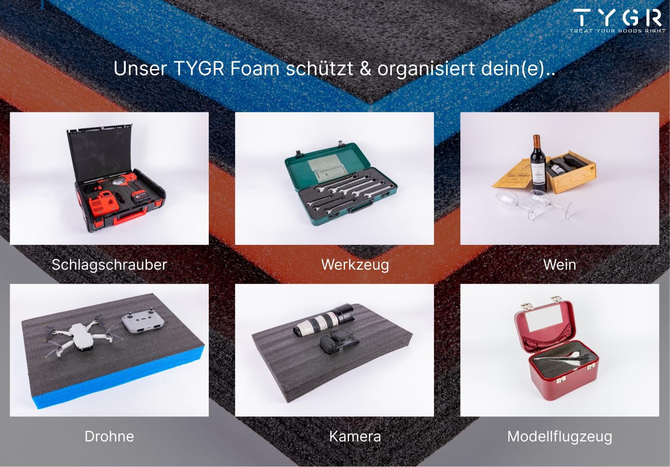 ["INDIVIDUELL: Our TYGR Multilayer Foam allows for custom inserts tailored to your needs. You determine not only the shape of the cutouts, but also the depth for perfect protection of your equipment, all without the need for tedious foam cutting.","EINFACHE ANWENDUNG: Want a custom foam insert for your equipment without the hassle of cutting? Our foam inserts are easily adjustable using our Cut & Peel method. Simply cut the foam insert and peel away what's not needed.","VIELSEITIG: Our foam inserts are perfect for tool organization in your workshop cart, suitcase, camera case, drone case, gun case, providing optimal protection for your tools, camera gear, drones, wine bottles, and more.","HOCHWERTIG & GLEICHZEITIG KOSTENGÜNSTIG: TYGR Foam offers a high-quality and cost-effective way to protect your tools, camera gear, and more at an affordable price.","RECYCLEBAR: TYGR Foam is made of 100% polyethylene, making it lightweight, waterproof, and recyclable wherever available.","Schutz in großer Vielfalt: Our Multilayer Foam inserts come in various sizes (1000x600 mm and 600x600mm), thicknesses (30, 50 & 70 mm), and colors (Blue, Red, & Black)."]