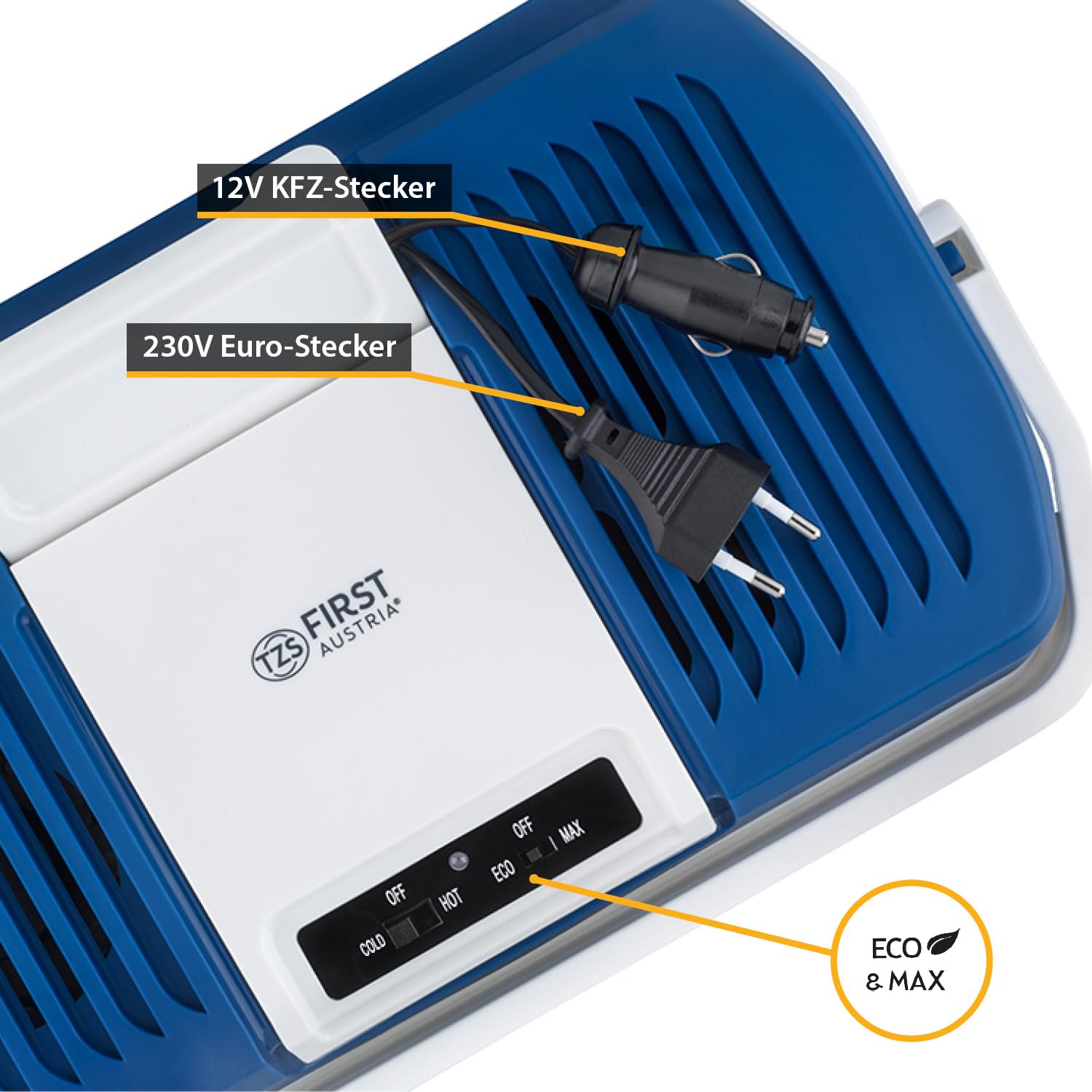 TZS First Austria - Cooler box 24L electric 12V 230V connection for car & power outlet - Thermo-electric Cool Box cools & warms - Mini fridge with handle - For camping, festivals, travel - Blue
