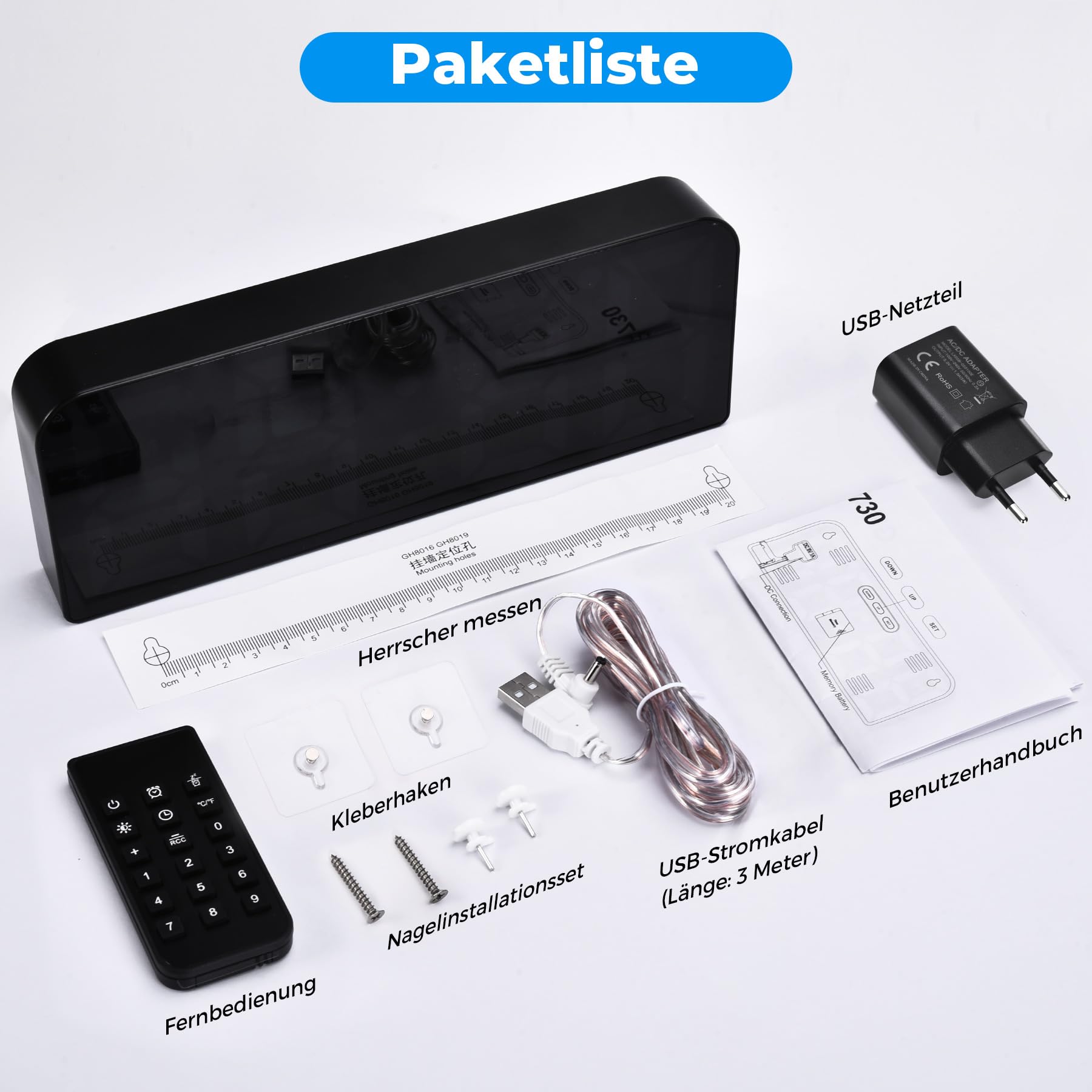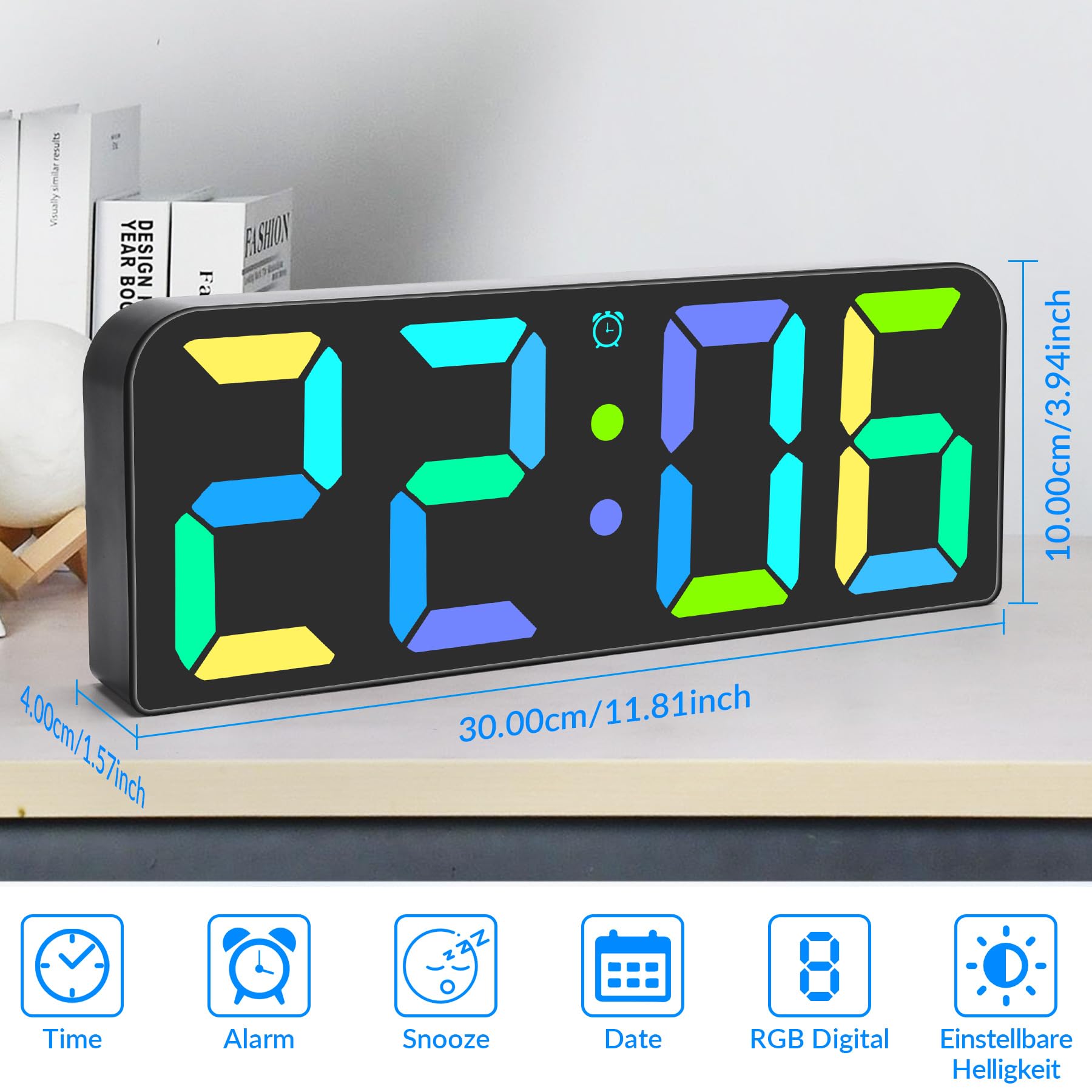 ["LED digital clock: dynamic RGB color change, you can change the color of the clock display font via the remote control, and the large screen display with large numbers allows family members to clearly see the time information.", "Three brightness settings: Depending on the ambient brightness, different brightness settings can be adjusted. The brightness can also be adjusted using the remote control without removing the wall clock.", "Alarm clock and snooze function: Up to three alarm settings can be set and it also comes with a five-minute snooze function, so you can easily wake up every morning. Both setting the alarm and activating the snooze function can be done through the easy-to-use remote control.", "Package contents: Alarm clock, packaging carton, manual, data cable, adapter, remote control, installation kit.", "Wall clock and desk clock: The digital alarm clock can be used as a wall clock or desk clock. It is equipped with a built-in timer and can be used in various scenes (kitchen, living room, bedroom, warehouse, gym) to meet the timing requirements for placement or hanging in different scenes."]