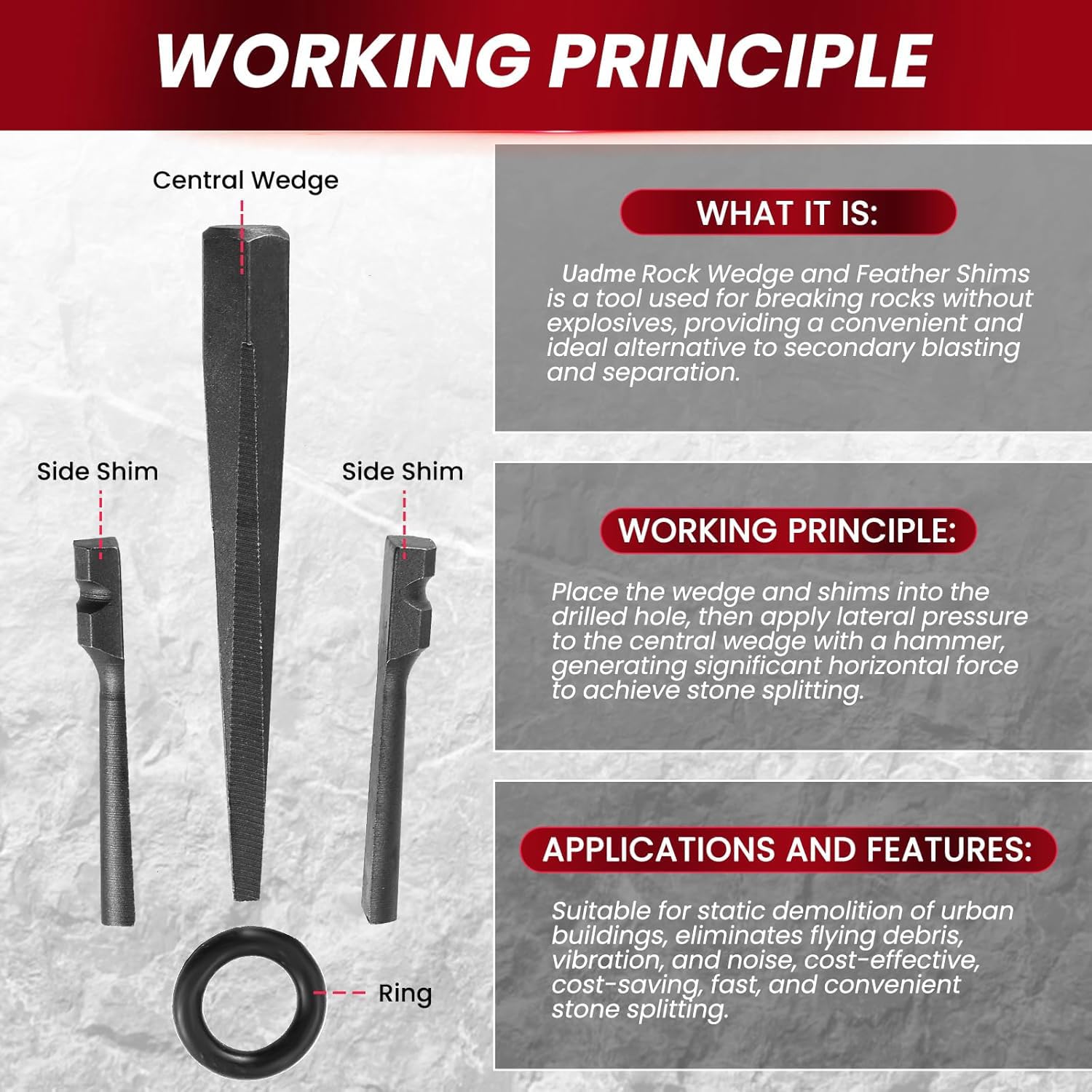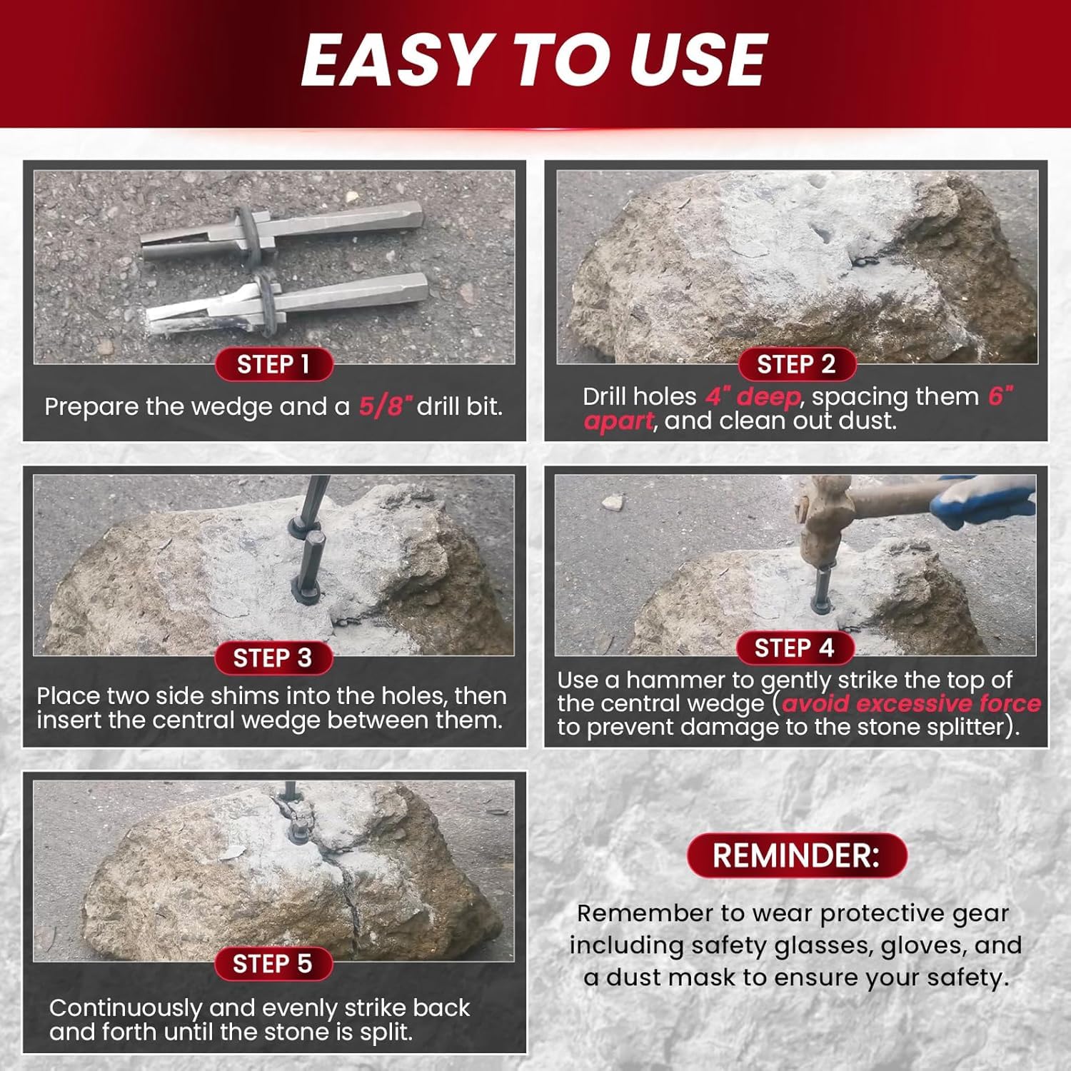 【SERVICE GUARANTEE】Start with a light hammer, tapping firmly but without force on the wedges one by one to build up gradual and even pressure along the entire series of wedges and washers. If you have any questions about the stone splitting tool, feel free to contact us directly. We will provide you with a timely solution."]