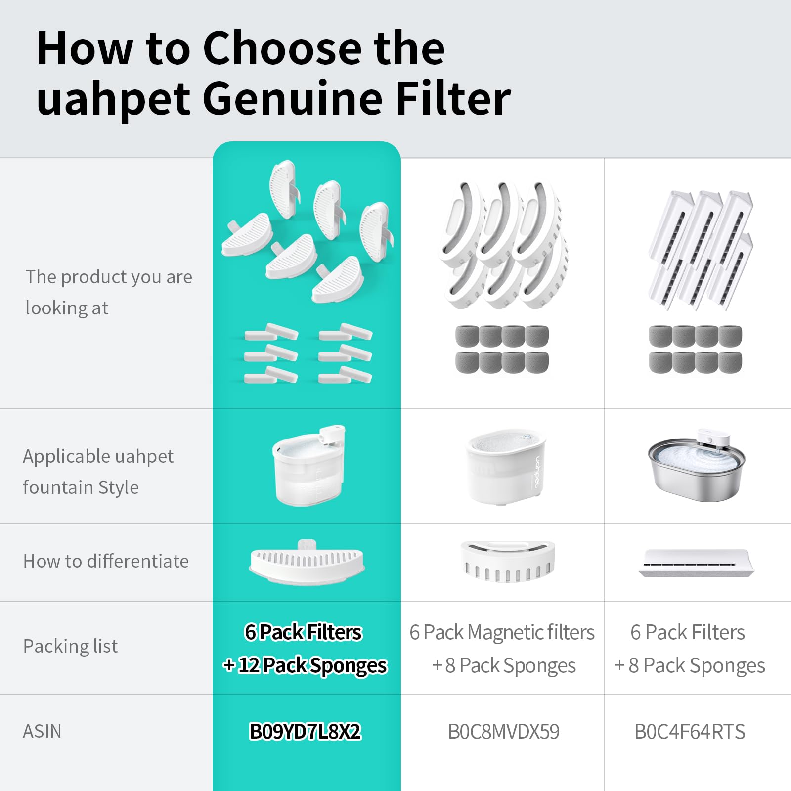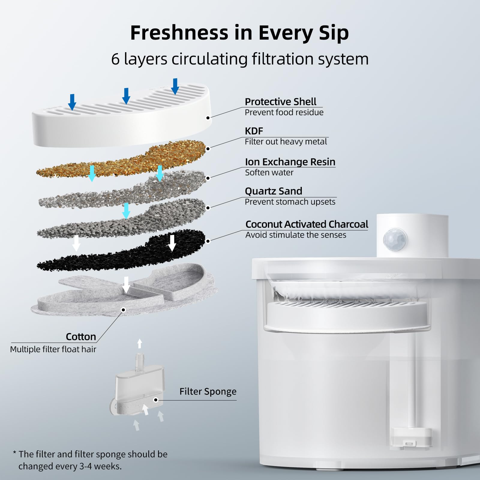 ["Filter Combo Pack - 6 Pieces","6-layer filter system in each filter, filter consisting of eco-friendly casing, KDF, ion exchange resin, quartz sand, coconut activated carbon, and cotton.","The 6x superior filter system provides cats with cleaner and healthier water. We recommend replacing the filter and filter sponge every 3-4 weeks."]