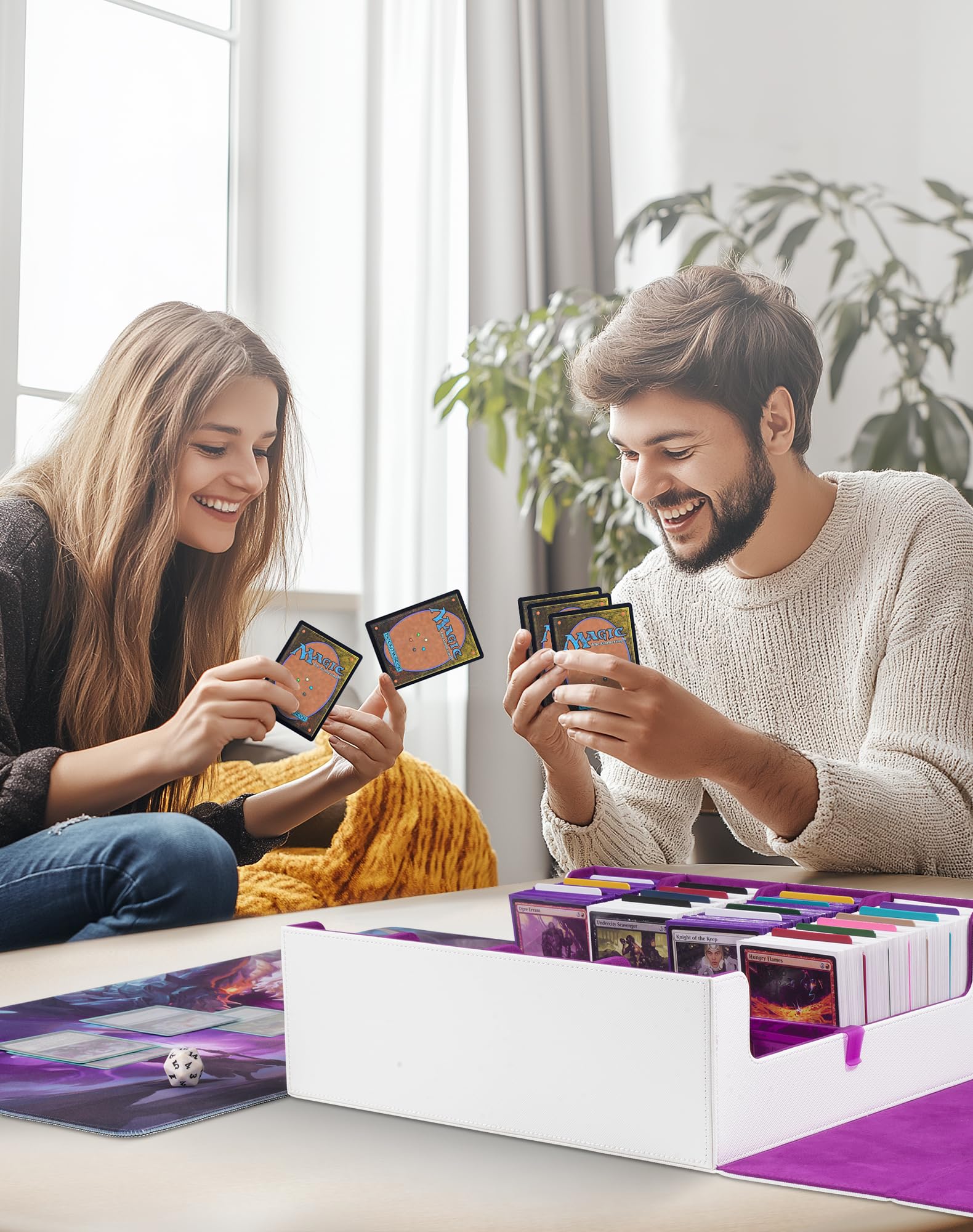 ["Super Large Capacity Card Box: By switching from a 3-row to a 4-row card game box, the capacity is increased by 33.3%. This MTG card box comfortably fits 3000+ unsleeved cards, 2400+ single-sleeved cards, or 1300+ double-sleeved cards, but not with toploader sleeves and magnetic card holders","Efficient Card Organization: The collectible card storage box comes with 24 card dividers and 4 card holders, ensuring cards stay upright and enabling perfect card organization. It is easy to organize and categorize cards and accessories. This arrangement allows for quick card retrieval, saving search time and increasing efficiency","Versatile Card Collection Box: Designed for gamers, our card boxes are perfect for a variety of game cards. Compatible with Magic: The Gathering, Duskmourn, Bloomburrow, Assassin's Creed, Modern Horizons 3, One Piece, Pokemon, YuGiOh!, Duel Masters, and sports cards like soccer, basketball, and baseball cards in penny sleeves, as well as Dominion cards and expansions and other collectibles","Great for Card Collectors: For people who have a hobby of collecting cards, it can provide a home to store your cards. If you encounter any issues with using our products, please feel free to contact us and we will do our best to assist you"]