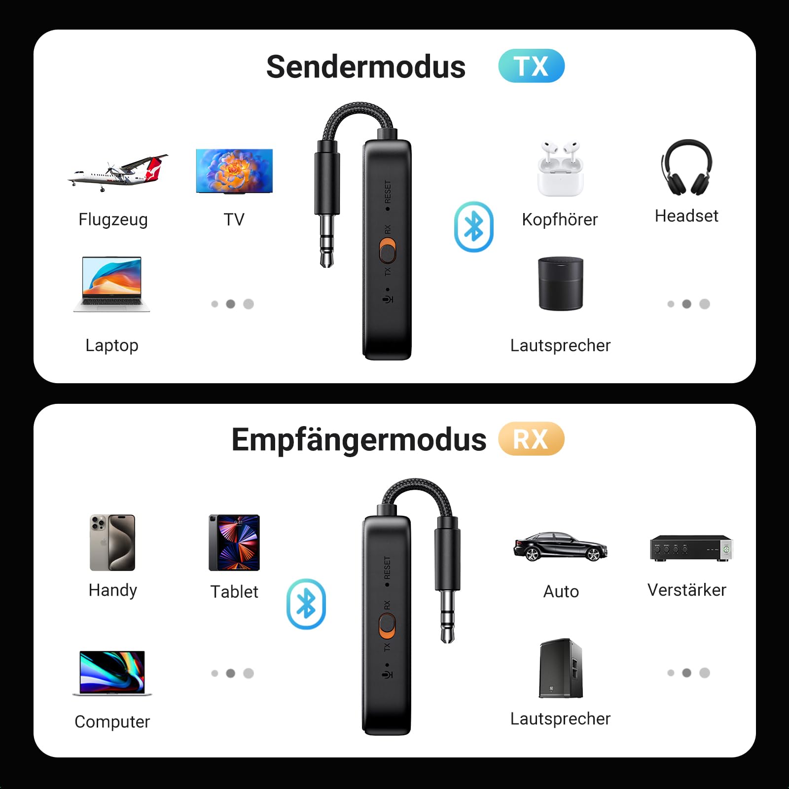 Bluetooth Transmitter: Connect your computer, TV, airplane entertainment system, etc. to Bluetooth headphones, stereo systems, etc. using a Bluetooth jack adapter in TX mode.