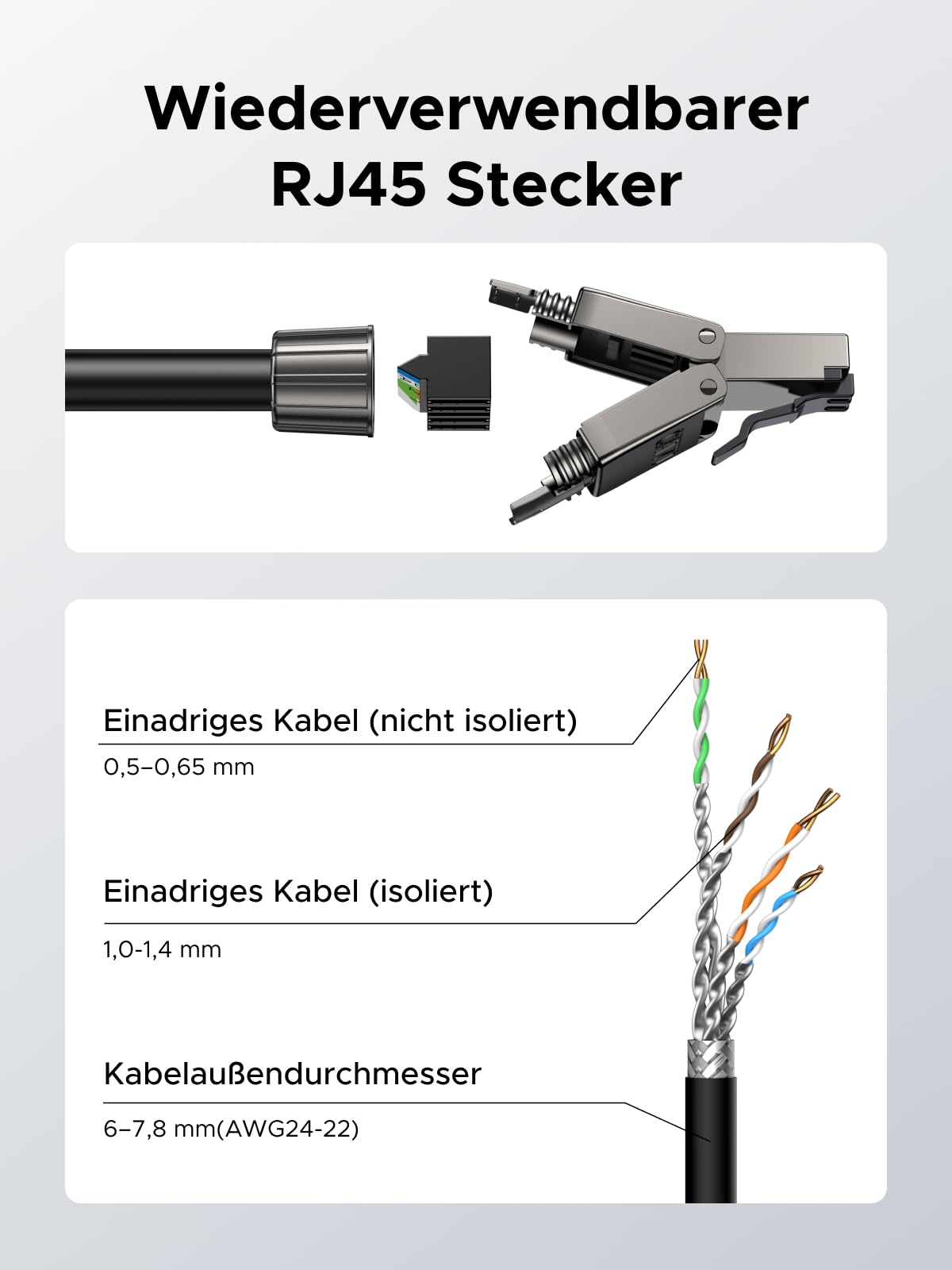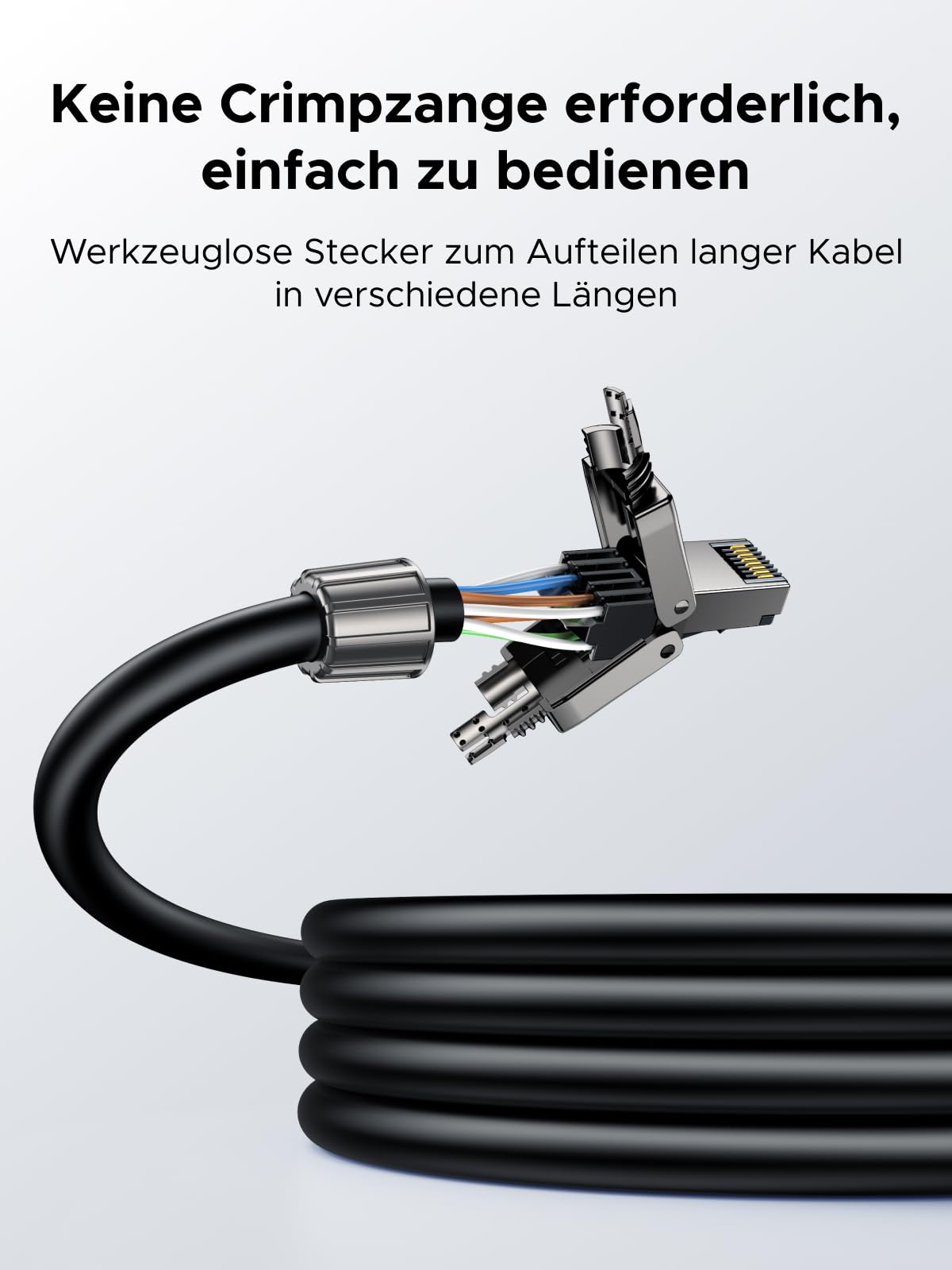 "Tool-free and fast installation: No complicated tools or crimping tools required. Simply insert the cable into the RJ45 plug without any tools, close the latch – done. The clever clip design allows for quick, precise, and repeatable connection handling, easily removable and reusable even in case of errors.