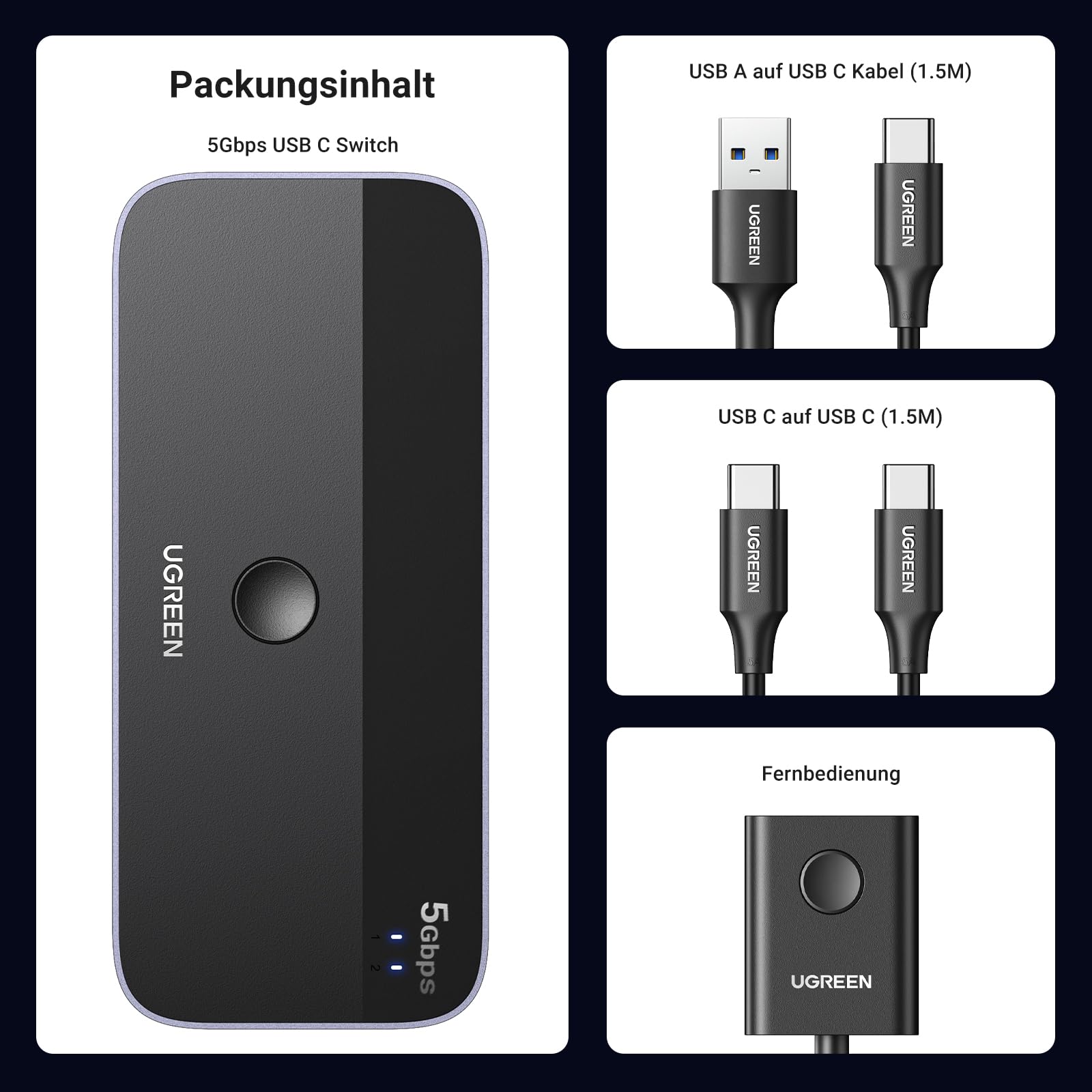 ["Outputs: UGREEN 2 In 4 Out USB C Switch allows 2 computers to share 3 USB A ports, 1 USB C port for devices like mouse, keyboard, printer, scanner, hard drive, USB stick, and other C-port devices. Switch freely between work computer and personal laptop.","Faster Data Transfer: The USB Switch 3.0 supports data transfer up to 5 Gbps, backward compatible with USB 2.0/1.1 and 10 times faster than USB 2.0, allowing the switcher to quickly access USB 3.0 devices with high bandwidth like external hard drives, webcams.","Easy Switch with One Click: Conveniently switch your USB devices between two computers with the push of a button. A clear LED display shows you which computer is currently active. With the compact desktop controller, you can easily switch from close range.","Wide Compatibility: The USB switcher for mouse and keyboard is compatible with Mac mini M4, MacBook Pro M4, and multiple systems, Windows XP/Vista/7/8.1/10/11, Linux, and macOS, etc. Simply plug and play for all such systems.","Package Contents: 1*UGREEN USB 3.0 Switch, 1*USB C to C Cable (5 feet), 1*USB C to USB 3.0 A Cable (5 feet). 2 USB C to USB A/C cables fit your desktop and laptop computers, improving efficiency in the office and your home experience."]