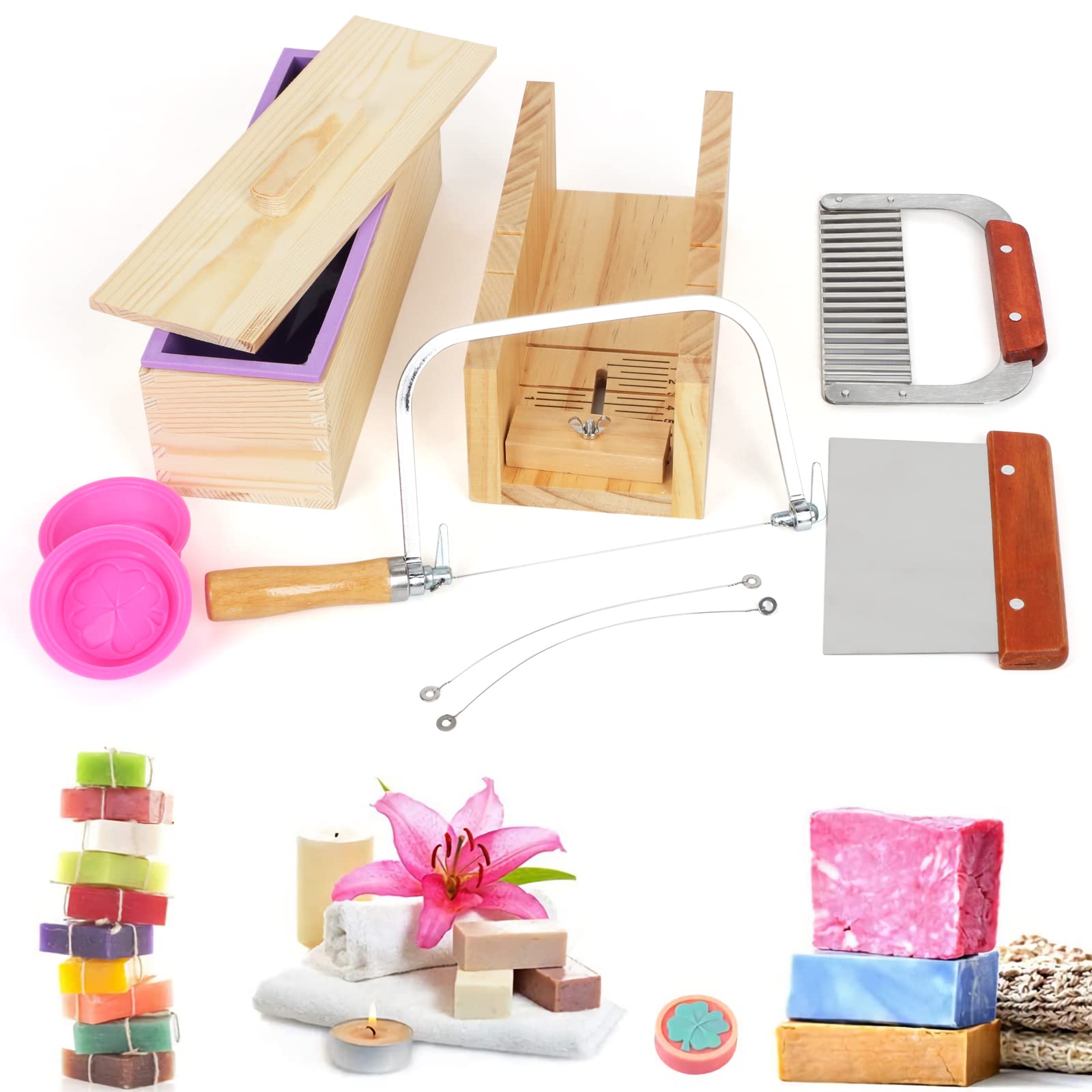 ["Excellent Quality】Made of solid wood with delicate edges and rust-proof blade, securely fastened with screws, safe, durable. Everything is designed to forge this high-quality soap cutter. Super easy to use, DIY handmade essential tool.","Adjustable Thickness】You can adjust the thickness of your slices. Clear scale reading, easy to control and get the right soap size, suitable for most sizes.","Four-leaf Soap Mold】The soap mold is made of high-quality silicone, it is safe, reliable, and durable. The surface of the soap mold is non-stick coated, making it easy to release the soap, cleaning is also convenient, it can be recycled.","Advantage Pack Soap Mold Set】9-piece set: 1 x adjustable jaw cutting mold, 1 x rectangular wooden box, 1 x lid, 1 x rectangular silicone mold, 1 x stainless steel soap cutter wire, 2 x small four-leaf clover silicone soap molds, 1 x flat soap cutter, 1 x wavy cutter","【Great Fun】Hand wash in hot soapy water. Rinse immediately and dry. If you are a DIY enthusiast, don't miss this set! They also make great gifts for your loved ones."]