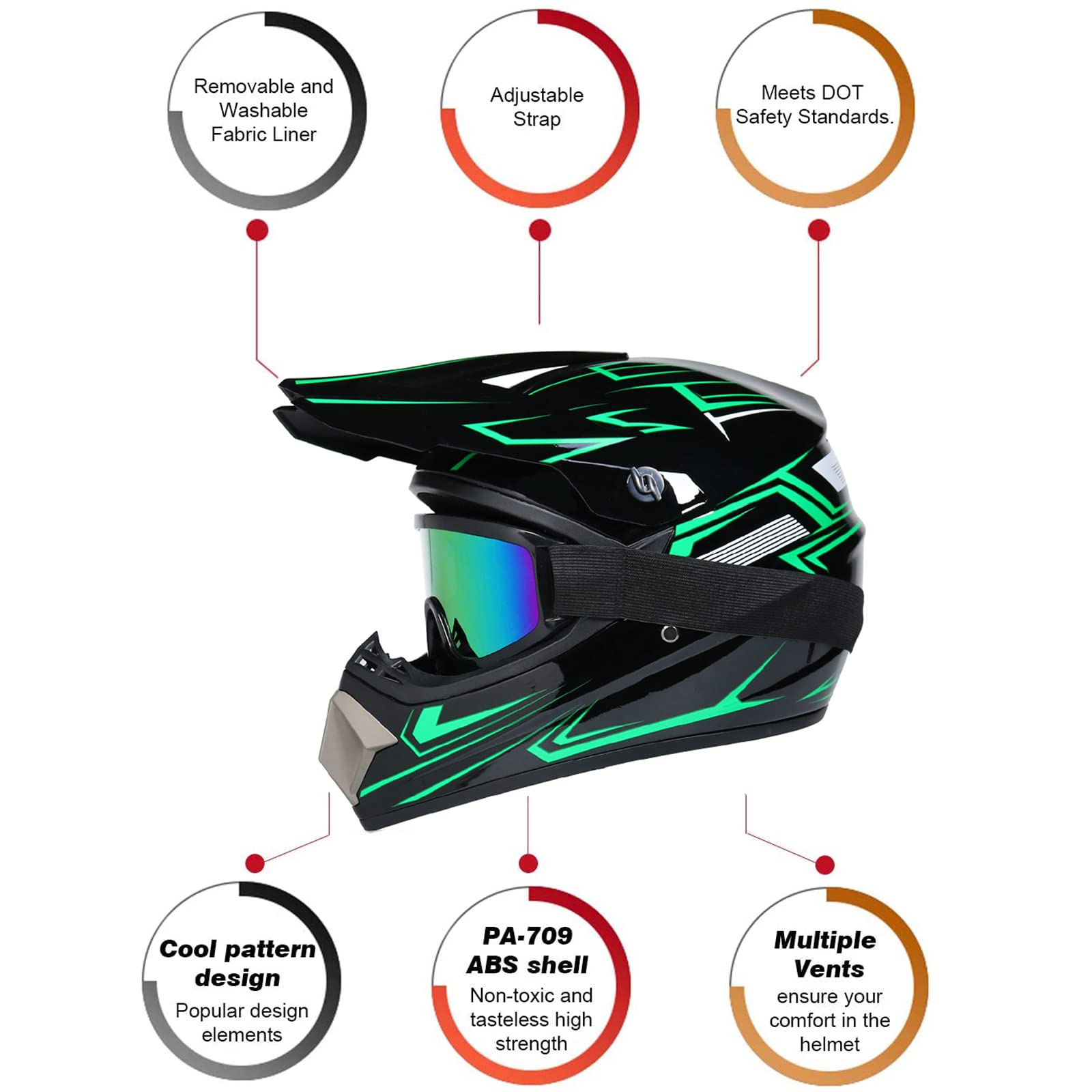 ➤ Motorcycle helmet not only protects the head but also reduces the impact on the eyes at high speeds. Suitable for motorcycle riding Motocross, Cross Country, Street Bike, Offroad, ATV, MTB, Downhill Dirt Bike, Cross Bike, BMX, and more.