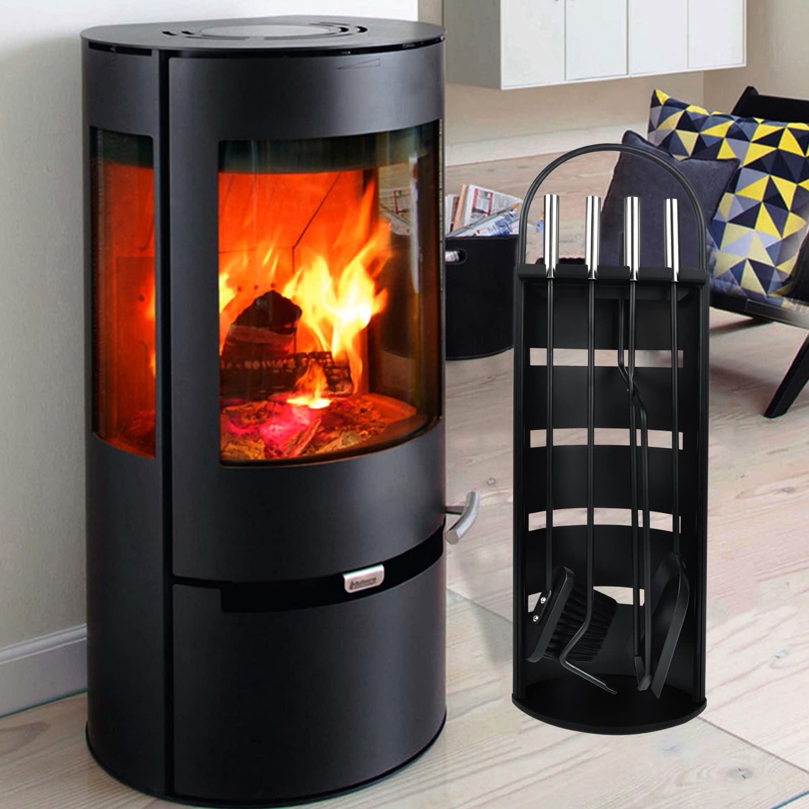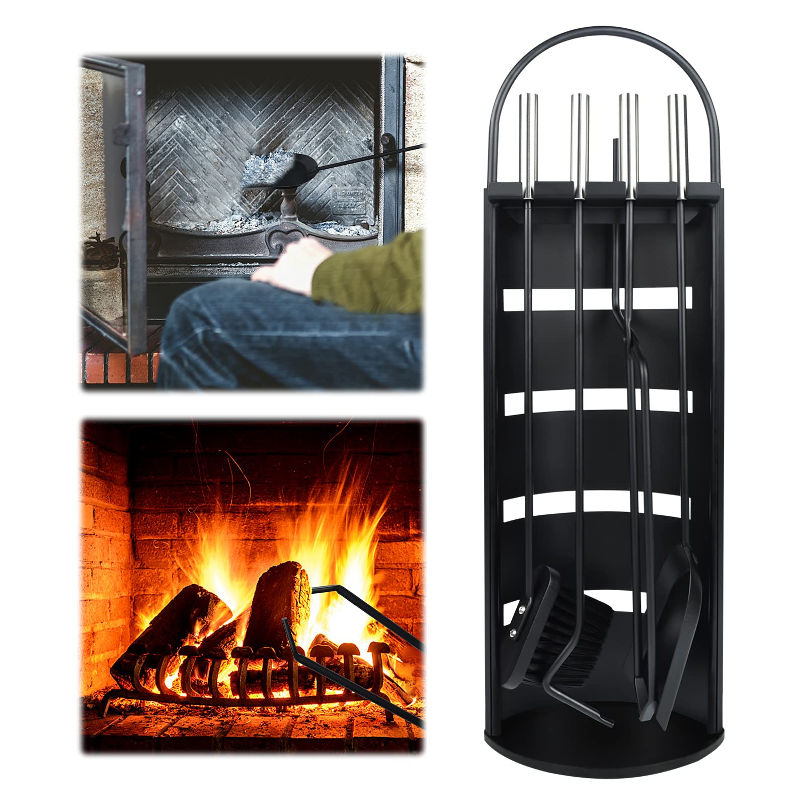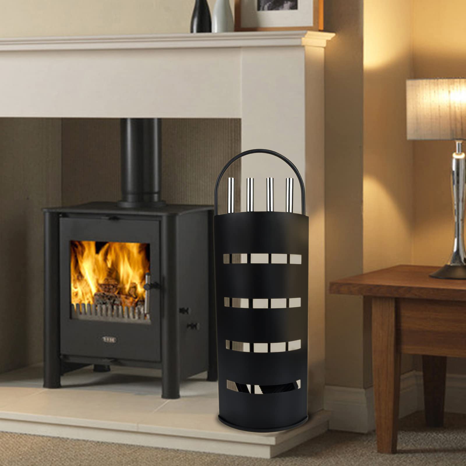 UISEBRT Fireplace Tool Set Black - Modern Stainless Steel 5-piece fireplace tool set: stainless steel stand with windshield, broom, tongs, poker, ash shovel (Black)