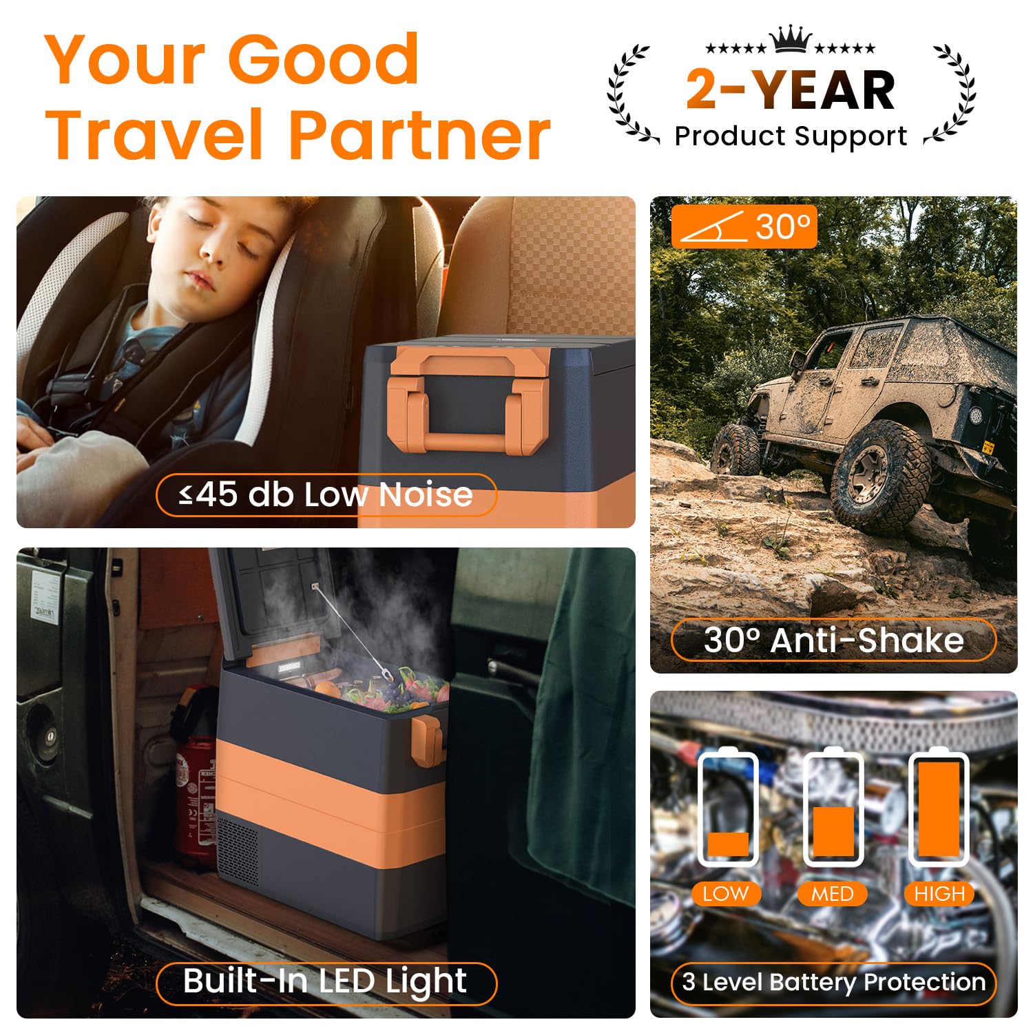 ["【Large Capacity】 The 12V car refrigerator is easy to transport and has a capacity of 50 liters, making it convenient to use anywhere. This portable refrigerator has two compartments, allowing you to cool drinks and freeze meat at the same time. Perfect for campers, boat owners, and campers to store seafood, snacks, meat, and drinks while traveling, boating, and camping.","【Highly Efficient Cooling, Low Energy Consumption】 The UKKISO 12V car refrigerator features a protection system with different H/M/L levels. The system can match different start-up voltages and shut-off voltages. The powerful compressor can lower the temperature of an empty portable refrigerator to 32°F in the maximum mode. The cordless RV refrigerator design keeps your items cool even when you turn off the power on the go.","【Quality Assurance】 The sturdy PP shell ensures that the refrigerator has excellent impact and collision resistance. Thanks to the professional anti-vibration technology, the refrigerator can maintain good cooling effect even in rough terrain of 86°F.","【Affordable Package and User-Friendly Design】 You will receive a portable car refrigerator, 1 cigarette lighter socket, 1 wall socket adapter, 1 user manual (may not be in English). The drain hole at the bottom allows for easy cleaning of the 12-volt refrigerators. It is designed for minimal noise, so you can sleep well after a long drive.","【Our Customers Matter to Us】 We have a professional technical support team dedicated to portable car freezers. If you have any questions, feel free to contact us through Amazon. We will respond within 24 hours to provide you with a wonderful experience."]