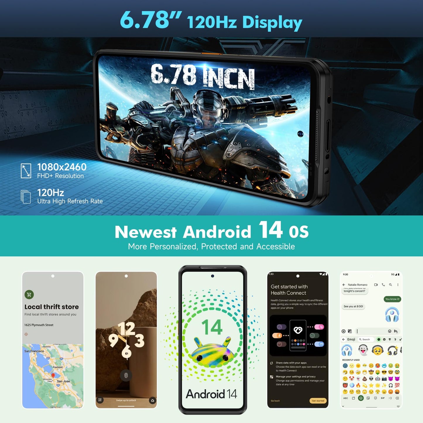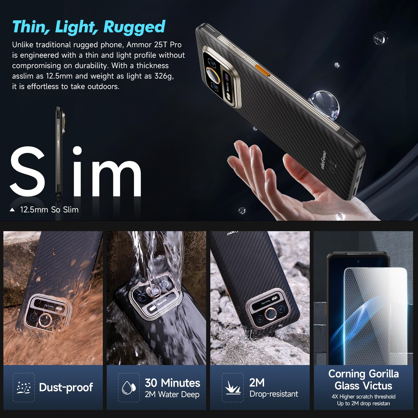 ["【5G MTK Dimensity 6300, Android 14, 12GB + 256GB/2TB 】 Ulefone Armor 25T Pro 5G phone without contract with MediaTek Dimensity 6300 Octa Core 2.4 GHz, a completely new gaming processor and Android 14, with faster processing and less delays. Up to 12GB RAM (6GB RAM + 6GB virtual RAM) + 256GB ROM + 2TB SD expansion, downloading and sharing becomes child's play.","【ThermoVue thermal camera】Ulefone Armor 25T Pro is integrated with the ThermoVue thermal camera, offering up to 160 x 120 high resolution and up to 25Hz frame rate, delivering clear images and capable of detecting objects in the scene as well as creating thermal images based on temperature. Perfect for wildlife hunting, electrical and pipeline maintenance, outdoor adventures, and emergency rescue.","【50MP super camera + 32MP front camera】: The Ulefone Armor 25T Pro is equipped with a pro-level camera system, featuring an SLR-level Samsung GN1 50MP main camera with 1/1.31-inch Ultra-Large sensor to capture great moments in sharp photos. The 64MP night vision camera allows easy navigation and targeting in low light or non-lighted areas. The 32-megapixel front camera makes your selfie photos striking. The underwater mode allows for taking photos and videos underwater, even while swimming or diving.","【6500mAh battery + 33W fast charge + wireless power bank function】: Equipped with a 6500mAh battery, 478 hours standby time, 48 hours talk time, and 16 hours video time. With 33W fast charging and 30W Qi wireless charging, the Ulefone Armor 25T Pro can be charged to 50% in 30 minutes. Supports wireless reverse charging OTG function, it can be used as a power bank to charge other phones or earphones.","【6.78\" FHD+120 Hz Corning Gorilla Glass Display 】: The Ulefone Armor 25T Pro features a 6.78-inch FHD+ rugged screen with a resolution of 1080 x 2460, a super fast 120Hz display, a wider color gamut, and higher contrast ratio, offering an impressive visual experience. The new generation Corning Gorilla Glass Victus increases durability to a new level and provides outstanding protection against impacts, shocks, and damage in daily use.","【IP68/69K waterproof shockproof dustproof】: The rugged Ulefone Armor 25T Pro phone is IP68/IP69K waterproof and can work underwater up to 2 meters deep and for up to 30 minutes; shockproof, it can be dropped from a height of 2 meters without causing damage; dustproof, it protects against dust, dirt, and sand.","【12.5mm lightweight body】: With an ultra-thin 12.5mm body and a weight of 326g, the Armor 25T Pro smartphone is slim and easy to hold while being extremely rugged. It is suitable for both office use and outdoor adventures.","【Supports NFC/Fingerprint & Warranty】: Supports 5G/4G/3G/2G dual SIM. It is compatible with all major carriers. Integrated with multiple functions, ✔️NFC function ✔️fingerprint, ✔️Face ID, ✔️GPS, ✔️custom key, ✔️FM radio, ✔️3.5mm headphone jack, ✔️notification-led equipped and more gadgets. Warranty and repair center in Europe. Comes with a 24-month warranty."]
