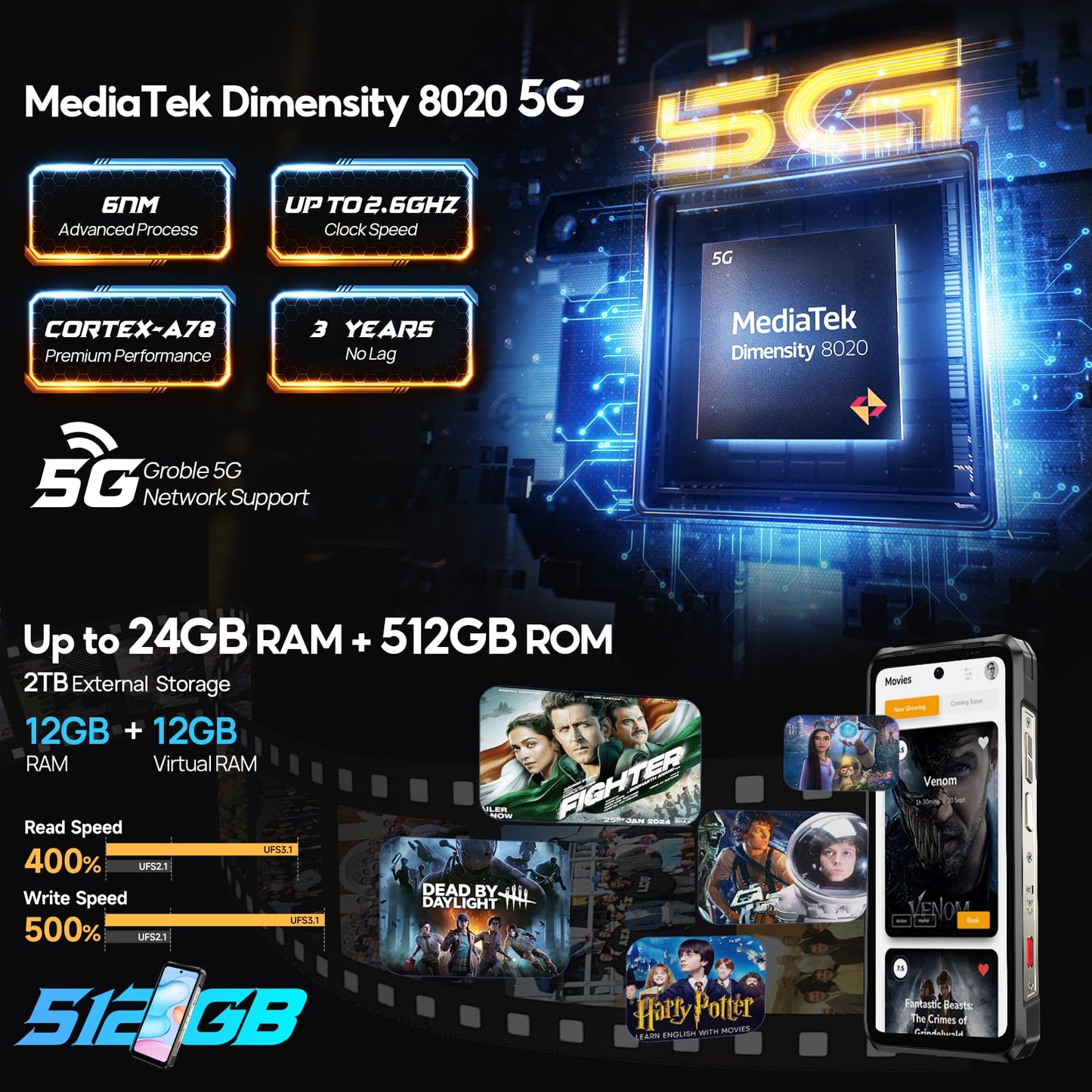 "【24 GB + 256 GB/TF-2T GB & Android 13】Armor 26 Ultra unlocked smartphone with the latest Android 13 operating system and MediaTek Dimensity 8020 5G "Octa Core" processor, with faster downloads, faster processing, fewer layers. Upgraded original 12 GB RAM to 24 GB. Meanwhile, 512 GB ROM, 2 GB expansion, plenty of storage space for your apps. Record and play all valuable moments without stress.