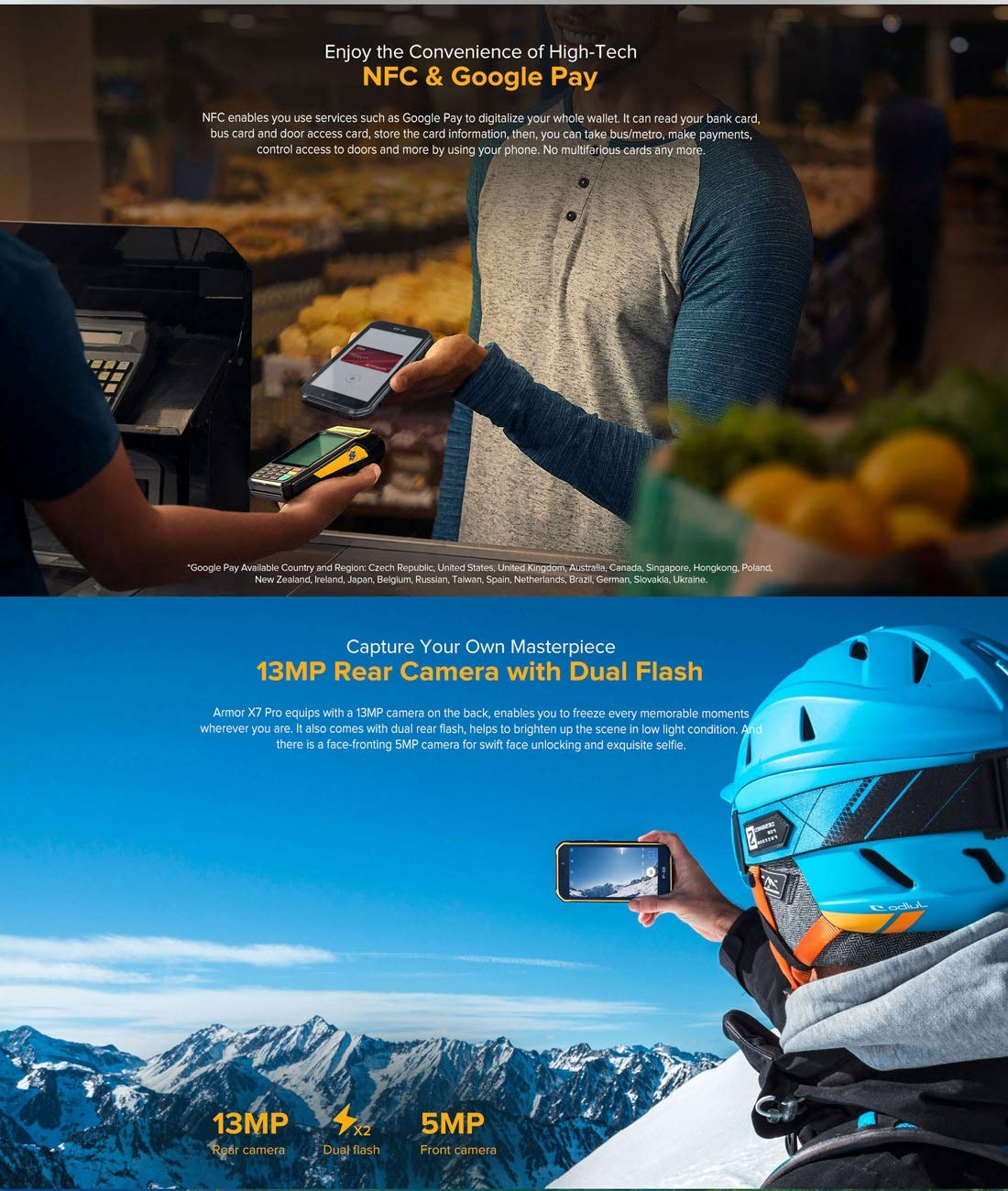 ["★ 【IP68 waterproof/IP69K dustproof protection:】 The Armor X7 PRO, equipped with a responsive screen, is waterproof and dustproof according to IP68 protection rating, allowing it to perform perfectly in extremely wet and dusty environments. It can stay underwater for more than 30 minutes at a depth of 1.5 meters. You can confidently use it outdoors in the rain and be assured that it will survive a drop in the water.","★ 【Android 10, Making Your Everyday Life Easier:】 As the latest Android operating system, Android 10 is easier, smarter, and more helpful than previous versions, protecting your privacy and security while finding the right balance with technology for you and your family.","★ 【MT6761 Quad-Core Processor, Smooth Performance and Low Power Consumption:】 The Armor X7 PRO is equipped with the MT6761 processor, providing fast and smooth handling, allowing you to multitask, watch movies, and play demanding games smoothly. The internal storage meets your daily requirements, allowing you to store all files, images, and music,","★ 【Long-Lasting Battery, a Battery that Lasts Not Just Hours, but Days:】 The Armor X7 PRO is equipped with a 4000mAh battery, providing up to 13 hours of talk time and 18 days of standby time. This allows you to stay active outdoors for longer without the risk of battery failure.","★ 【13-MP Rear Camera with Dual Flash, Capture Your Own Masterpiece:】 The Armor X7 PRO features a 13-MP rear camera that allows you to capture every memorable moment, no matter where you are. It also comes with a dual rear flash that brightens the scene in low-light conditions. Additionally, there is a 5-MP front camera for quick selfies and self-portraits."]