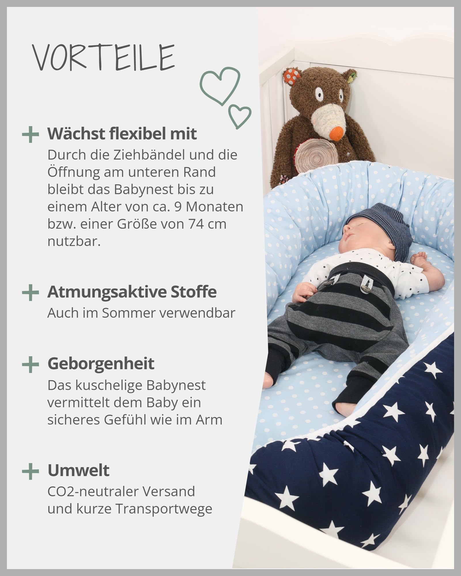 ["COMFORTABLE SLEEPING PLACE: This soft & cozy baby nest is ideal as a safe sleeping spot in the parents' bed, stroller, or as a travel bed for naps on the go.","BEAUTIFUL DESIGN: The baby nest features a kid-friendly & very loving design. With the practical reversible design, you can always adjust the look.","HIGH-QUALITY MATERIAL: Both the outer material (cotton) and the inner material (polyester flakes) are OEKO-TEX certified. This makes the baby cuddle nest suitable for allergy sufferers & tested for harmful substances.","EASY HANDLING: The baby snuggle bed can be easily taken anywhere. After use, you can also wash it at 30 °C. This keeps everything hygienic.","THIS IS ULLENBOOM: All products in our brand are manufactured in a family-run business under great working conditions. Discover our other beautiful baby accessories in patchwork style."]