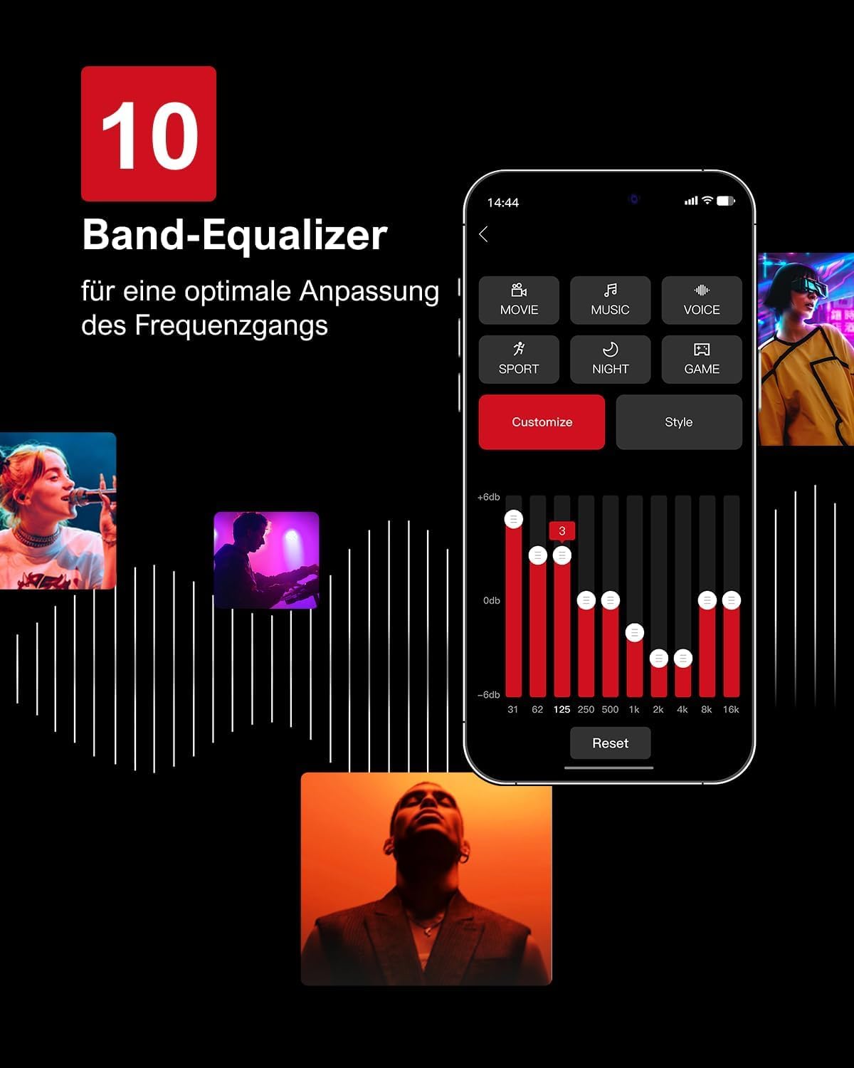 10-band EQ settings: Enhance your audio experience with six individually tuned EQ modes: Movie, Music, Voice, Sports, Game, and Night, each optimized for optimal sound quality. Additionally, with the advanced "Customize" function of the Ultimea app, you can further fine-tune the sound to your personal preferences and environment."