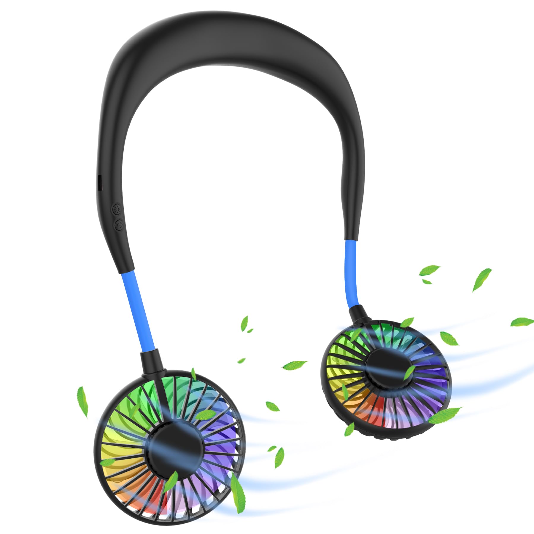 Ultra-light neck fan, USB neck fan, neck fan, quiet, 3 speeds, LED light, portable neck fan for outdoor, indoor, camping, travel, sports - black & blue.