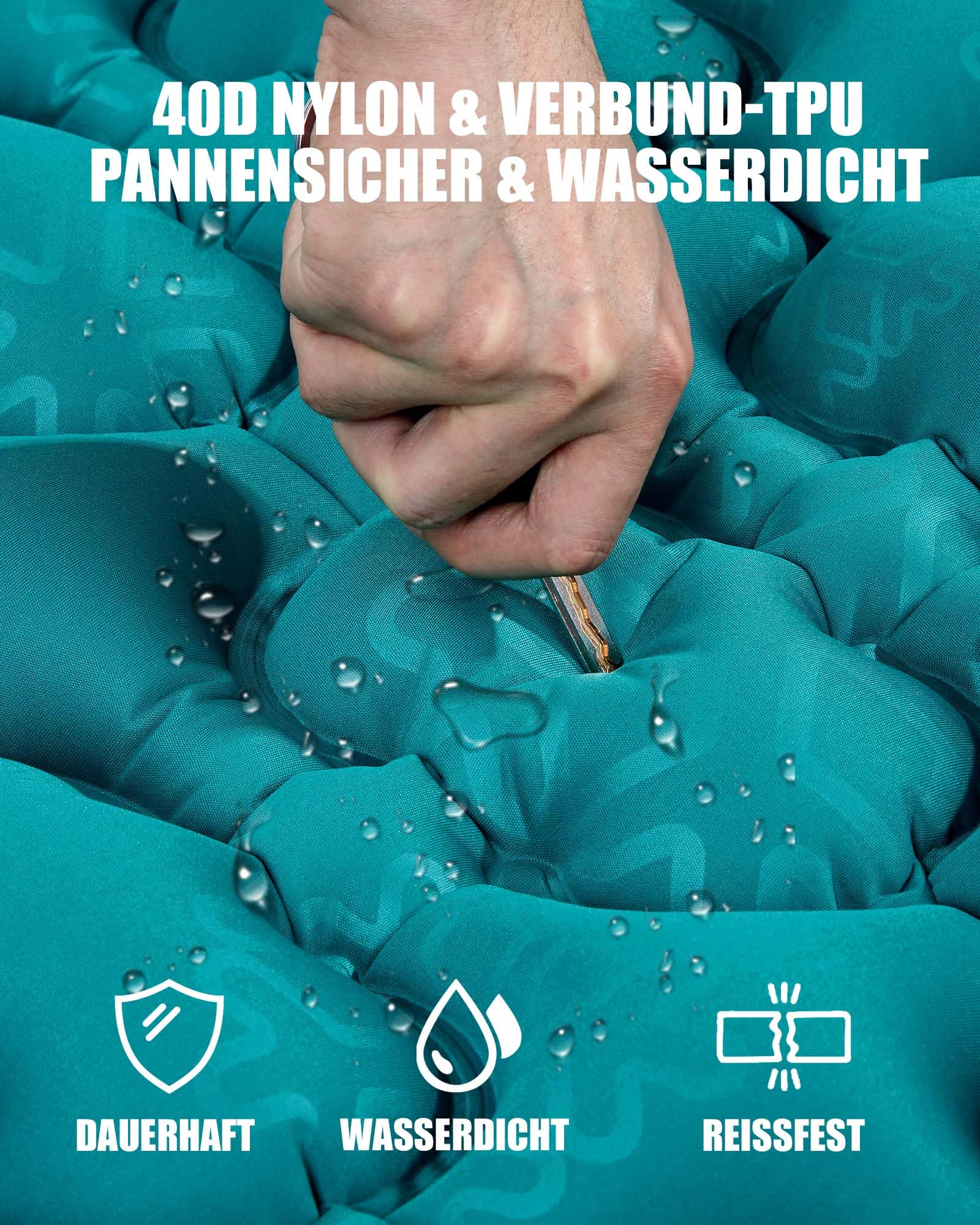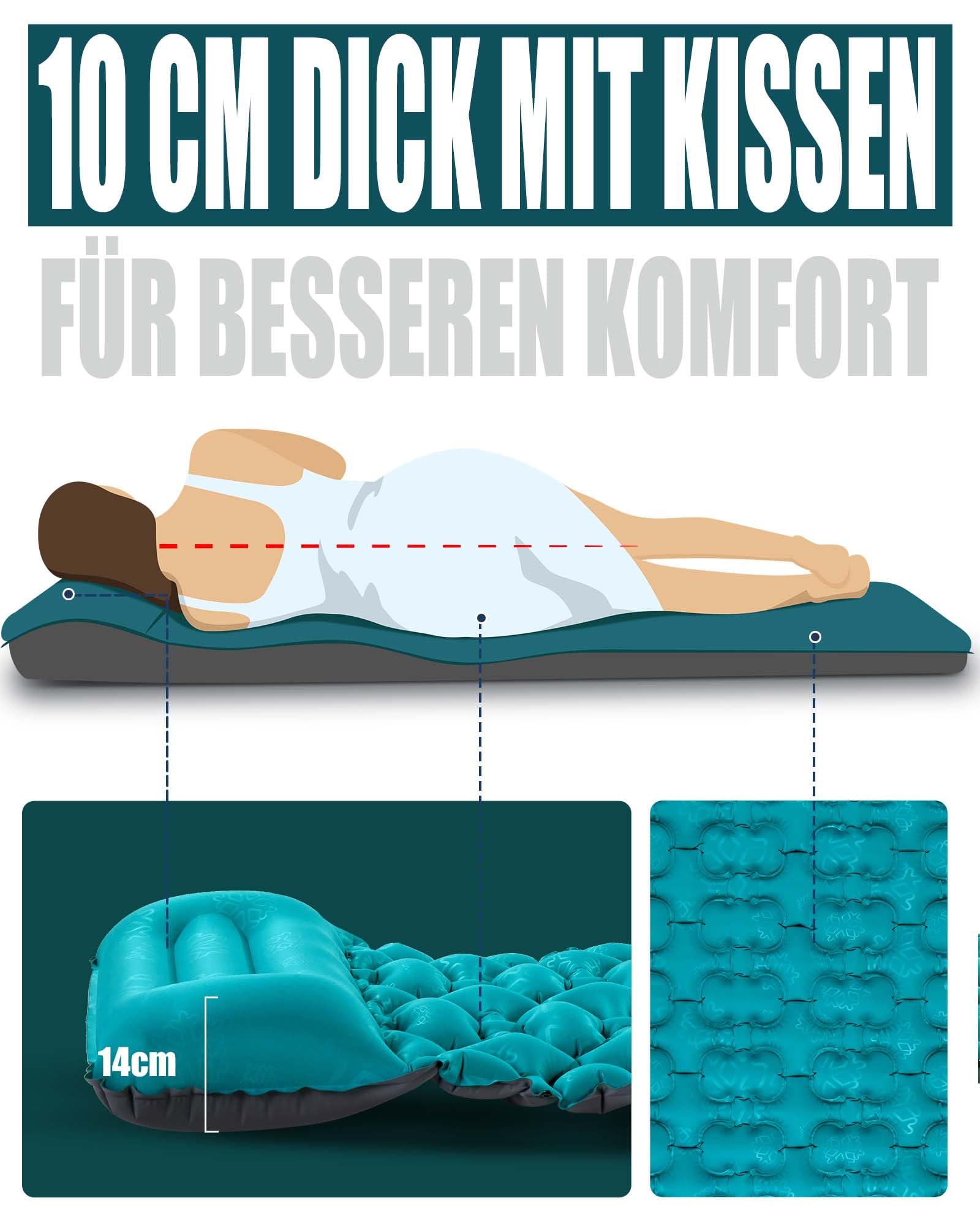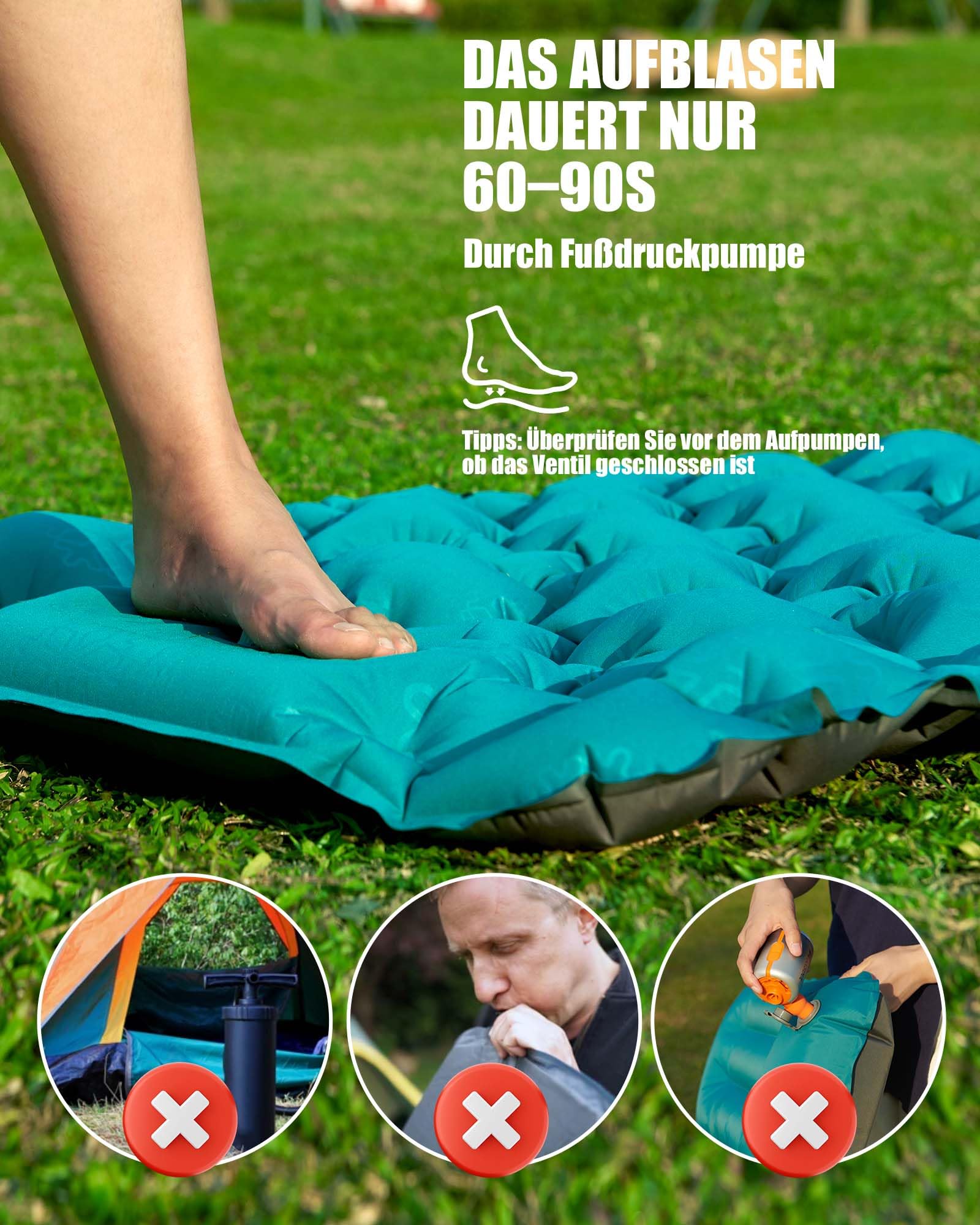 ["【▲▲▲10 CM for exceptional comfort▲▲▲】: Our self-inflating sleeping pad has a luxurious thickness of 10 cm, and the fully inflated mat measures 195 cm x 70 cm x 10 cm thickness, providing optimal support for a restful sleep for you. The built-in 14 cm pillow ensures that your head and neck are properly supported, enhancing your overall sleeping experience","【▲▲▲Quick Inflation▲▲▲】: Inflate your self-inflating air mattress quickly within 30 to 60 seconds. With a convenient foot pump design, you can easily inflate the self-inflating air mattress in peacock blue without any additional equipment, and it also prevents moisture from entering the interior through mouth blowing. And the deflation valve has a double-layered design with a multi-functional function for quick deflation","【Durable Design】: The outdoor sleeping mats are made of 40D Nylon with TPU coating. Our self-inflating camping mat is both waterproof and puncture-resistant, ensuring it withstands rough outdoor conditions for long-lasting use. With special inner I-beam structure and thermoforming sealed edges, the blue sleeping pad has an R value of 5, supporting up to 200 kg weight, providing you with durability for every adventurous camping night","【△△△Connectable Double Camping Air Mattress Design△△△】: There are connection buttons on both sides of the sleeping mats, allowing multiple camping mats to be seamlessly connected. Simply close the button to instantly create a double/multiple camping mat. Connect multiple sleeping mats to create a larger sleeping area for group camping trips, ideal for couples or friends on outdoor excursions","【▼▼▼Ultralight and Portable▼▼▼】: After deflation, our self-inflating sleeping pad measures a generous 36 cm L x 16 cm W x 12 cm H, making it easy to carry on your outdoor adventures. It is lightweight and compact, weighing only 1.2 KG, a size that even children can easily carry","【▽▽▽After Use & Very important▽▽▽】: After receiving and using the self-inflating sleeping mats for camping, if you are not satisfied with the Ultralight sleeping pad in any way, you can contact us as soon as possible. We will do our best to solve your problem and ultimately provide you with a satisfying shopping experience"]