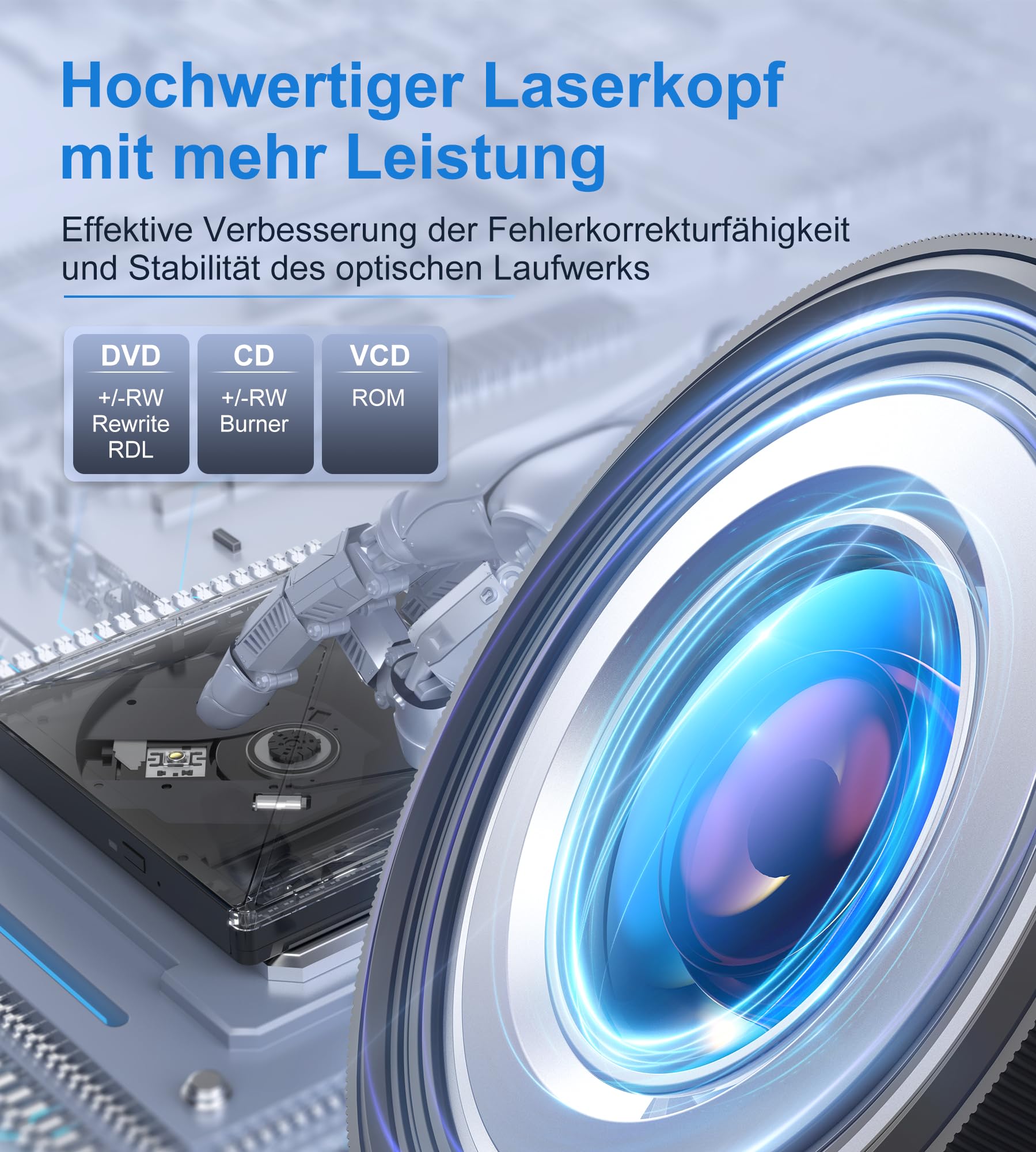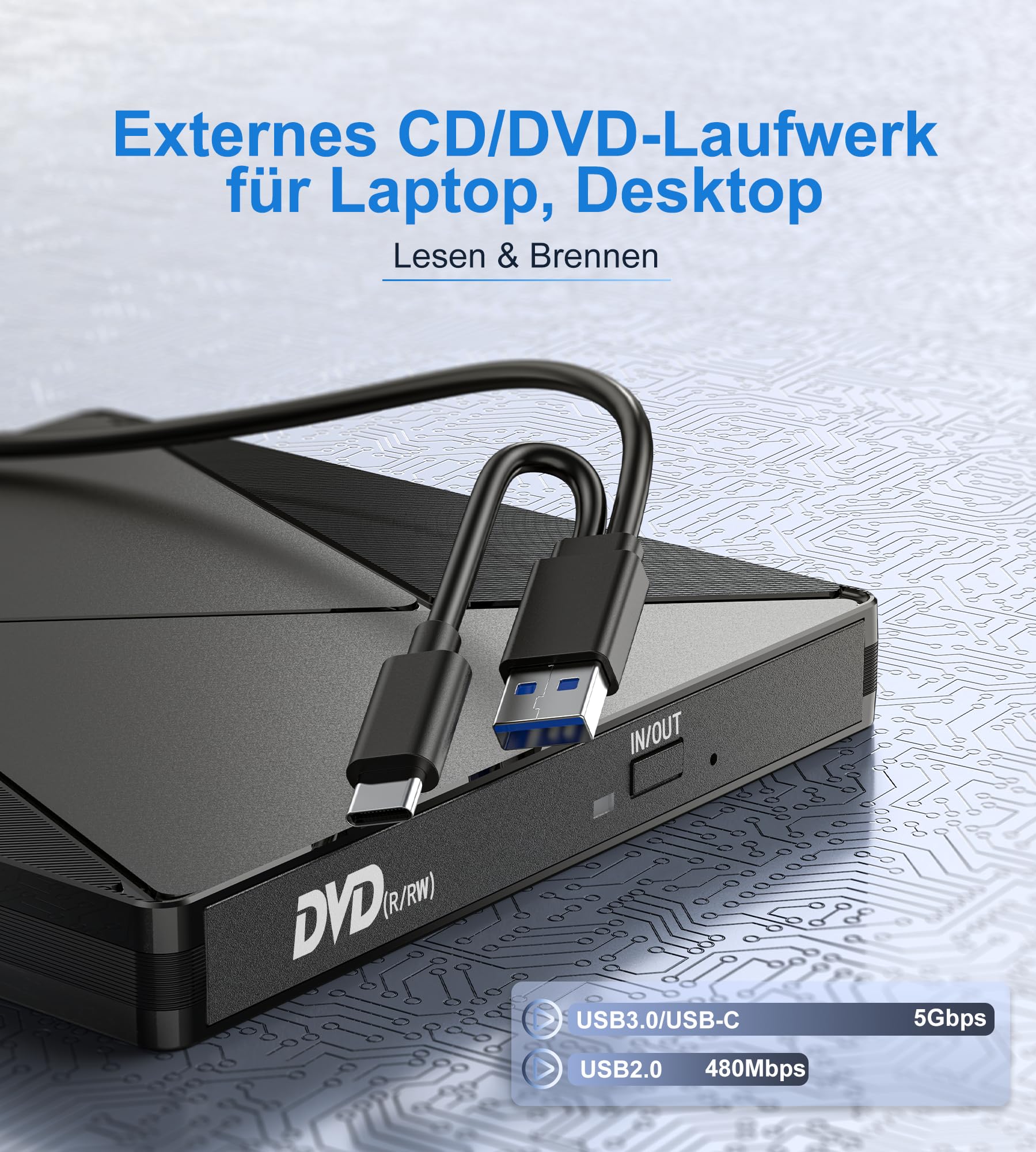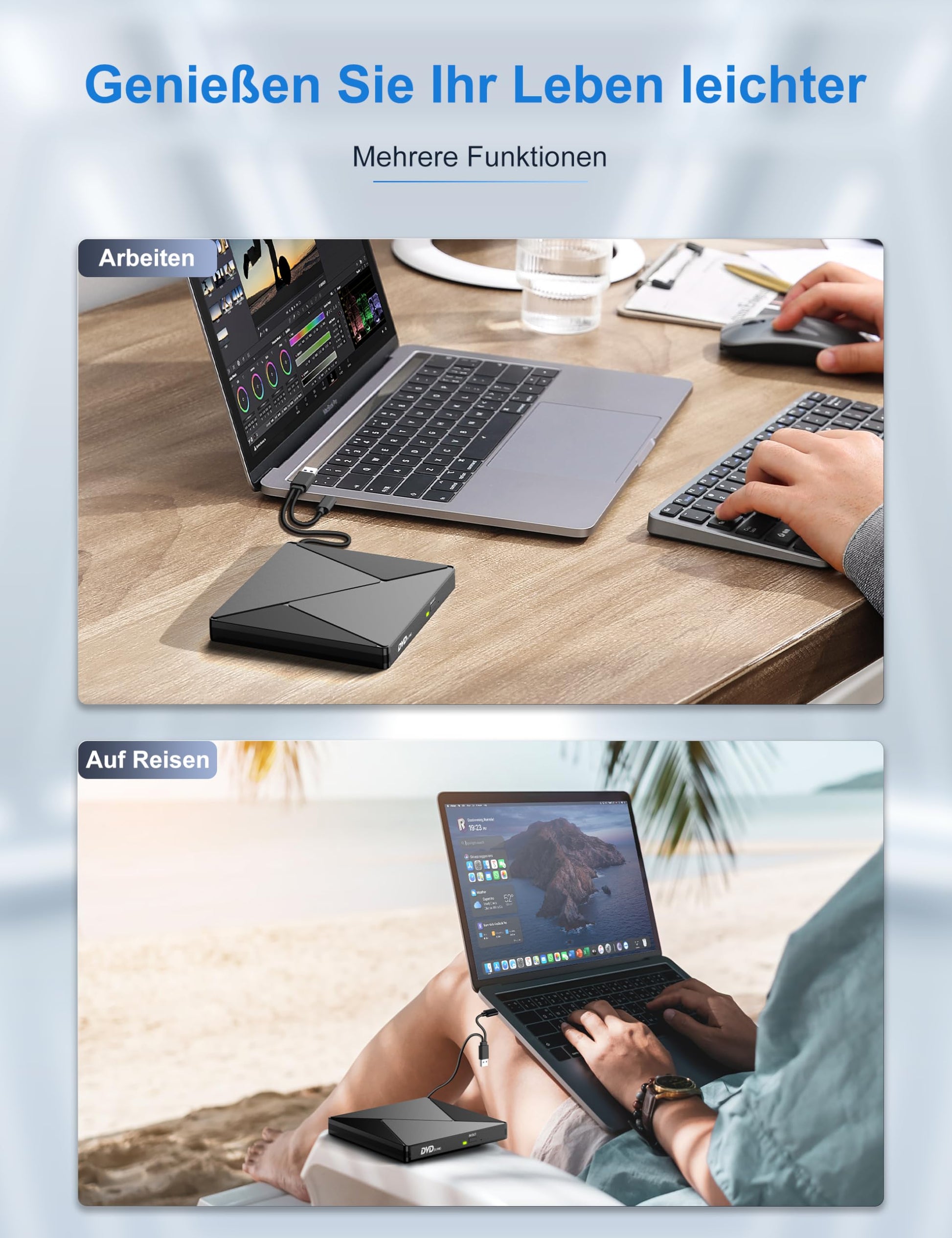 "【External CD/DVD Drive USB 3.0 & USB C】External DVD Drive with USB 3.0/Type-C high-speed interface. Faster data transfer speeds (up to 5 Gbps), stable and without subsequent latency. Backward compatible with USB 2.0 and USB 1.1/1.0. Burn, play music, and movies without delay or distortion.",