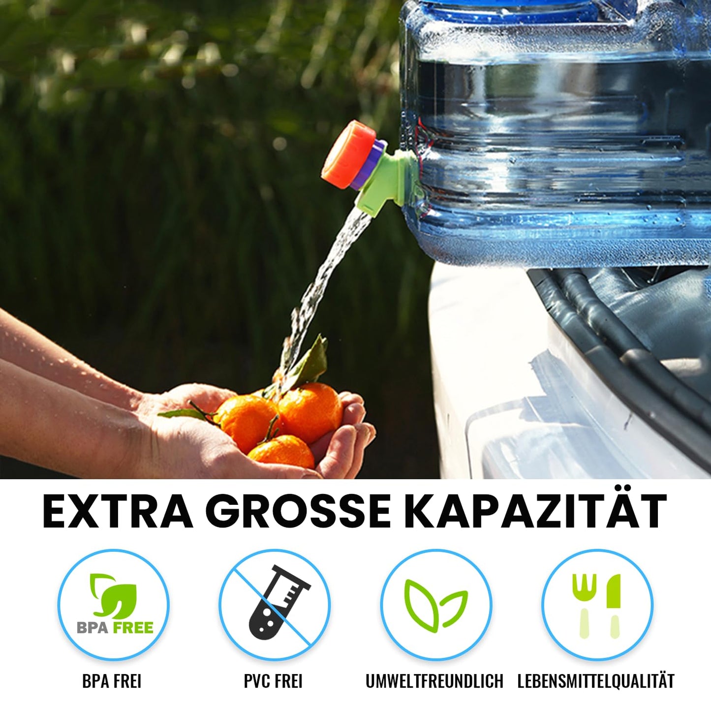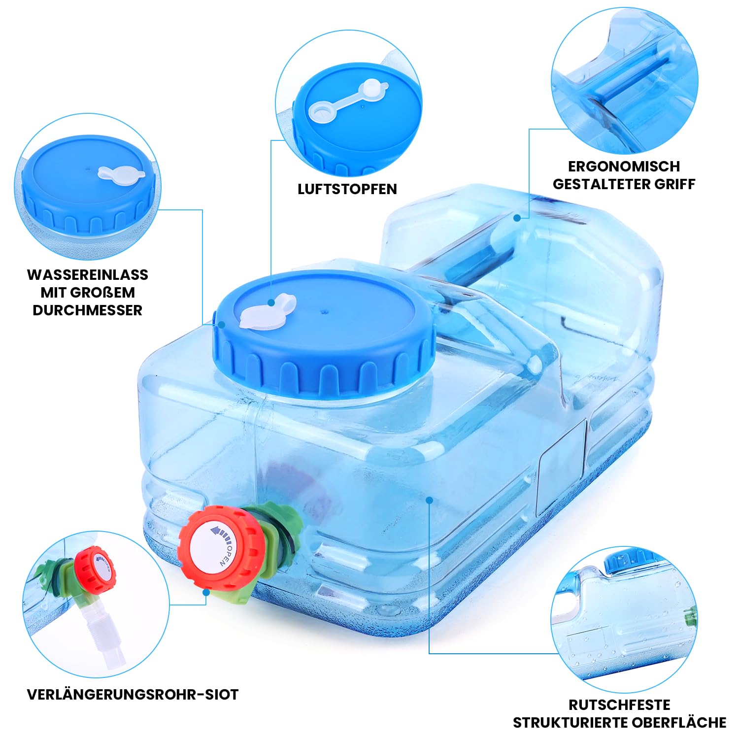 ["Applicable Scenarios": Water jug with tap, water tank for drinking water outdoors or in the household. This water storage is an ideal companion for caravans, motorhomes, camping, BBQs, beaches, fishing or picnics. It is suitable for overnight stays in the car, whether for daily drinking water, hand washing, teeth brushing or washing face and hair, there is enough water available.