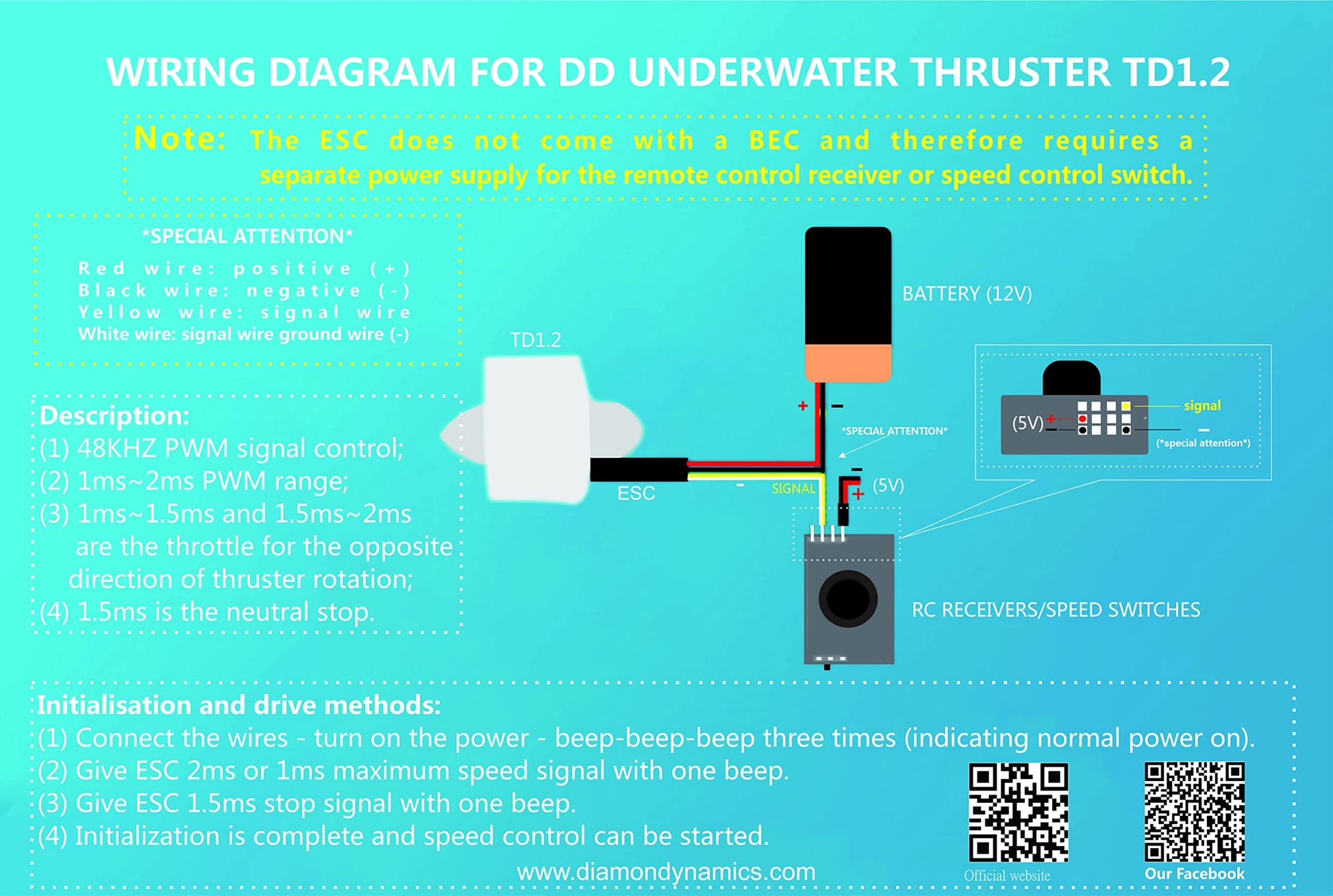 "Accompanied by high performance bidirectional fully waterproof ESC, high precision bearing extends motor life, PWM: 1500-2000us (forward), 1500-1000us (reverse)",