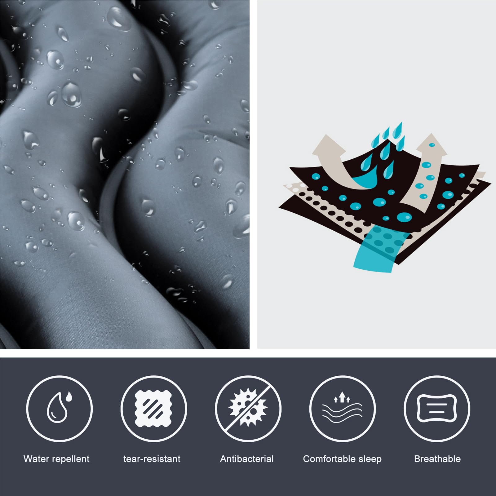 ["Dual Protection with 2 Material Types: The surface of the camping mat is made of 40D nylon. This material is wear-resistant, moisture-resistant, ultralight, and splash-proof. Internal material made of TPU has excellent load-bearing capacity, shock resistance, and impact absorption performance, making the camping mat suitable for both indoor and outdoor activities."]