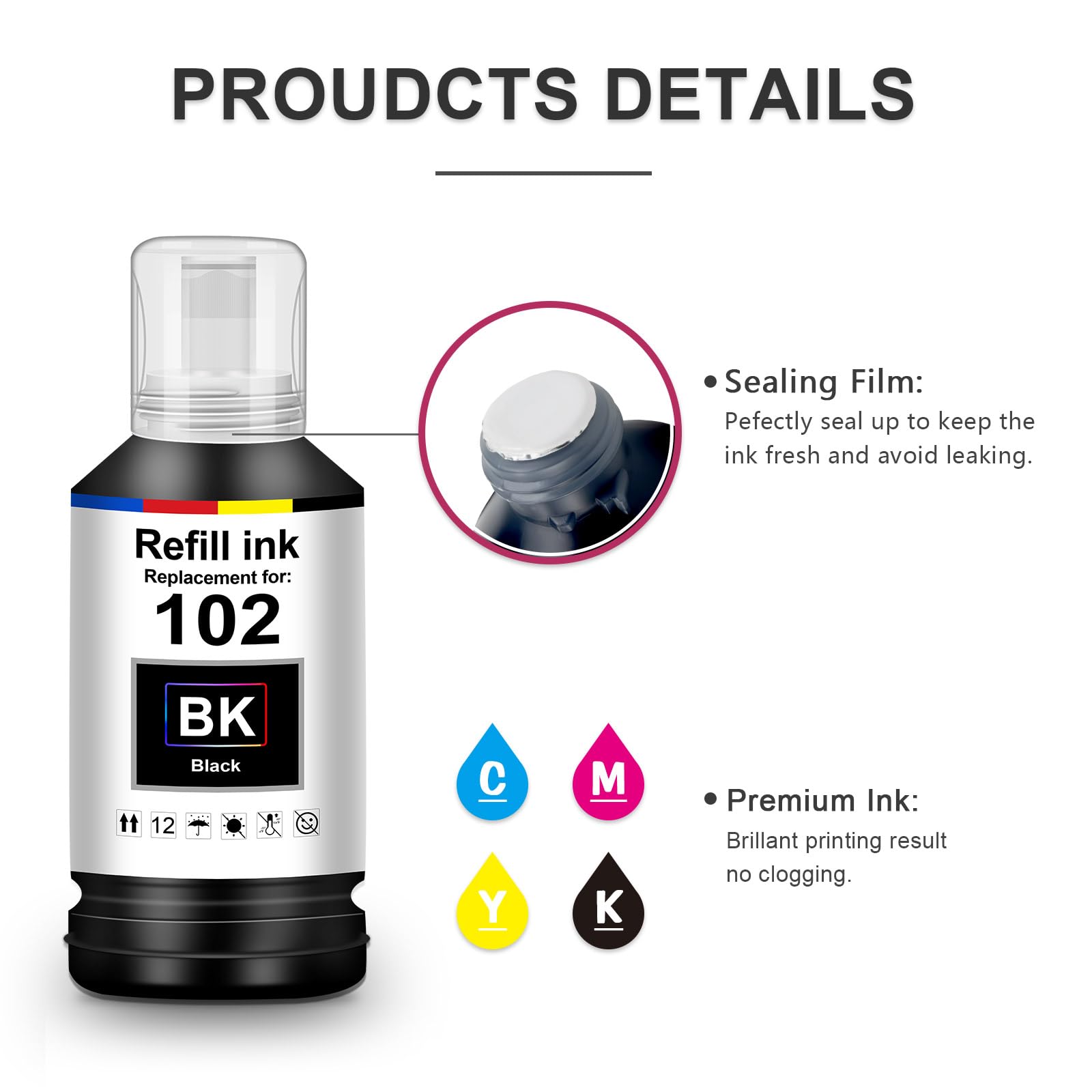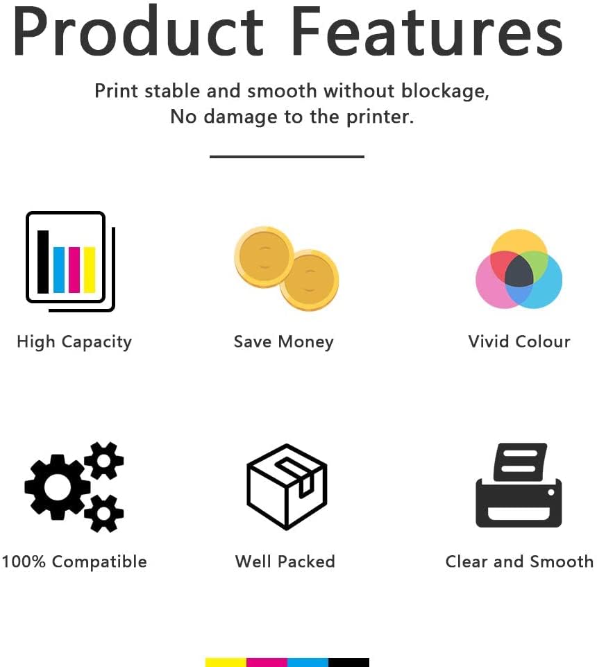 ["EPS E102 Ink Cartridges Compatible Printer Models: ET-2850 ET-2856 ET-3850 ET-4850 ET-4856 ET-15000 ET-2750 ET-4700 ET-3750 ET-4750 ET-4500 ET-2756 ET-3700 ET-2751 ET-2700 ET-2851 ET-2750 Unlimited ET-4750 Unlimited ET-3750 Unlimited","Ink EPS E102 High Productivity: Each black ink cartridge 130 ml can print 8000 pages; each colored ink cartridge 70 ml can print 6500 pages (A4/5% coverage)","EPS E102 High-Quality Ink Cartridges: UniPlus ink is smooth and uniform, no clogging, no fading, no ink exposure. The ink cartridges are simple and compatible for excellent printing results.","EPS E102 Inkjet Wide Range of Applications: It has a wide range of applications and can be used at home / in businesses / agencies / hospitals / schools. The odorless printing ink creates a better printing environment.","What You Get: Uniplus EPS E102 Inks (1x Black, 1x Cyan, 1x Magenta, 1x Yellow), No questions asked return within one year and 24-hour customer service."]