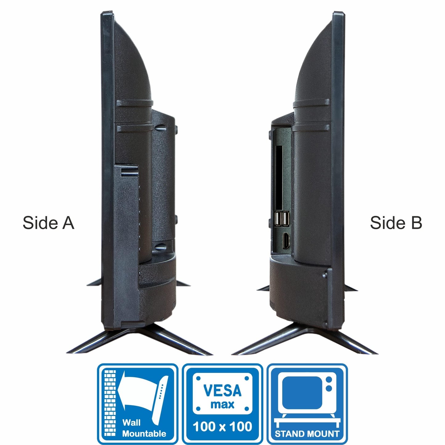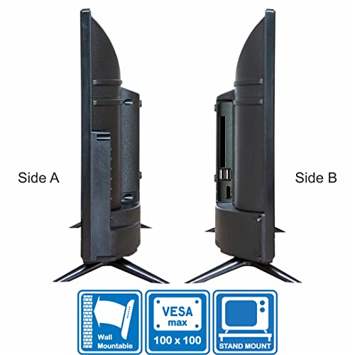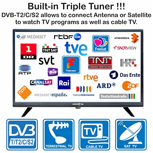 ["NEW 2023 model. 19 inches DIGITAL LED HD 230 V / 12 V TV", "IDEAL FOR: RV, camper, truck, boat, home with 12-volt DC or 230-volt AC power supply (both power cables included). 24V power supply for truck/LKW is optional, please visit Unispectra's Amazon shop. It can be used as HDMI CCTV / PC monitor.", "TRIPLE TUNER: DVB-T/T2 tuner for all of Europe's Free-to-Air TV. DVB-S2 tuner for satellite HD TV. Integrated CI+ for Pay-TV subscription services. DVB-C for cable TV.", "USB MEDIA PLAYER and PVR: Watch movies, view pictures, and listen to music from a USB storage.", "VESA 100 x 100 mm per mounting bracket and side wall. Low energy consumption (15W)."]