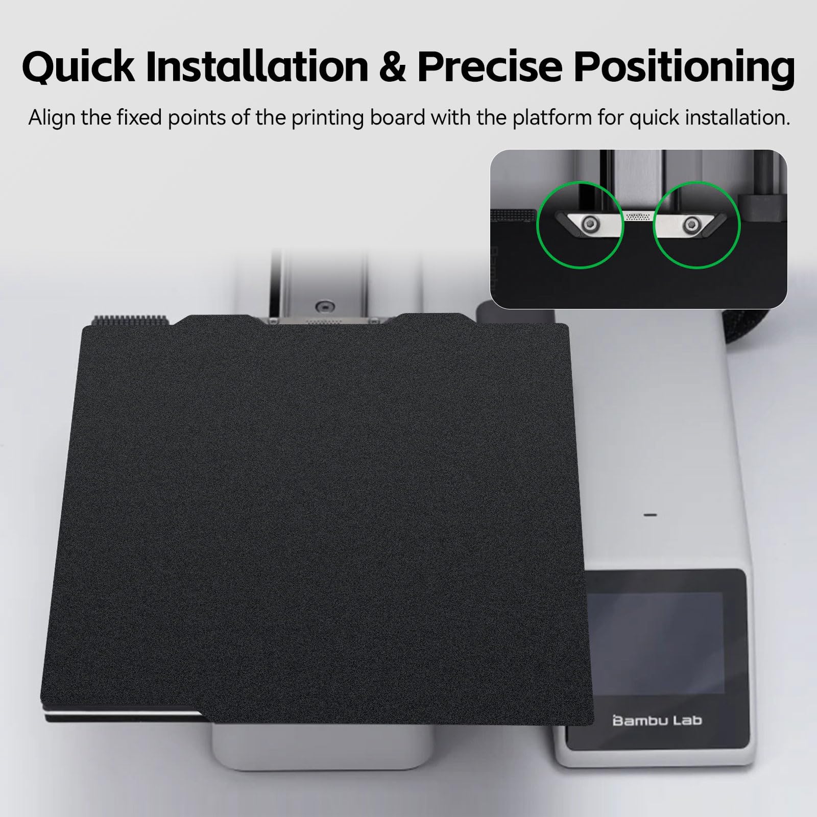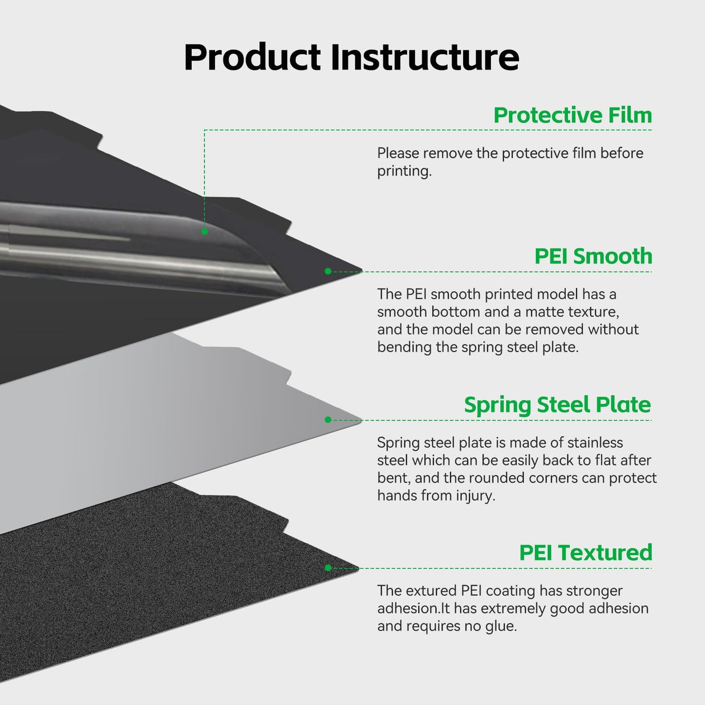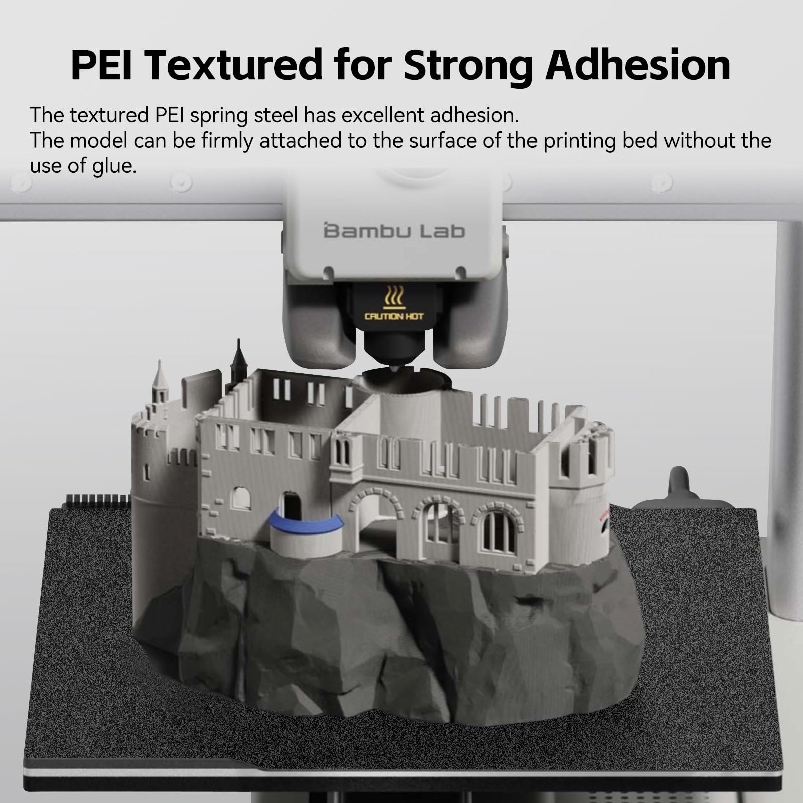 ["【Strong Adhesion】The textured PEI has excellent adhesion, so the model is firmly attached to the print bed surface without the use of adhesive.","【Easy to Remove】The smooth PEI makes the bottom of the printed model very smooth, and the model can be easily removed without bending the spring steel sheet.","【High Temperature Resistance】Real black PEI powder coating is heat resistant. Textured side of PEI is resistant up to 572°F and smooth side of PEI is resistant up to 392°F.","【Application】This 184mm double sided PEI plate is ONLY compatible with Bambu Lab A1 Mini 3D Printer. And it can support PLA/PETG/ABS/TPU/Nylon/PC/PA/ASA/PVA filaments.","【Warm Reminder】PEI smooth side requires 3D printing adhesive sticks to prevent the model from falling off, except for PLA filaments.","【Kind Reminder】Please level the plate again before switching to print on another side; Please wait for the platform to cool down before removing the model to prevent damage to the platform surface; Please clean the surface regularly with a soft cloth. Do NOT wash or clean the PEI with strong chemical reagents or strong cleaning agents."]