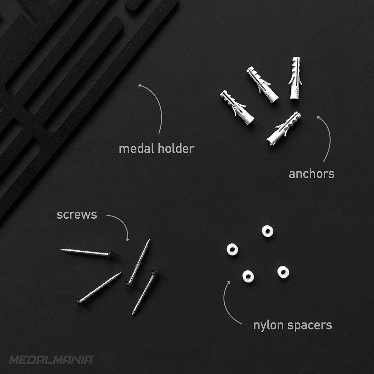 ["Medal Holder Deluxe - Display your sports trophies and achievements proudly as a special decoration in your own home with our high-quality medal hanging and storage bracket.","Ideal gift for triathletes - A medal hanger is the perfect gift idea for both adults and children who enjoy participating in competitions. Extra dose of motivation included!","Various colors & sizes - Choose between brushed stainless steel and powder-coated, matte black or red in 3 sizes: [M = 30 medals = 300x112 mm], [L = 48 medals = 430x112 mm], [XL = 60 medals = 550x112 mm].","Easy installation - The laser-cut and precisely crafted wall mount for medal storage can be easily attached with the included screws, dowels, and spacers with just a few simple steps.","European brand - We at United Medals have been designing and developing the best solutions for displaying medals for all kinds of sports and passionate athletes as a European company since 2017."]