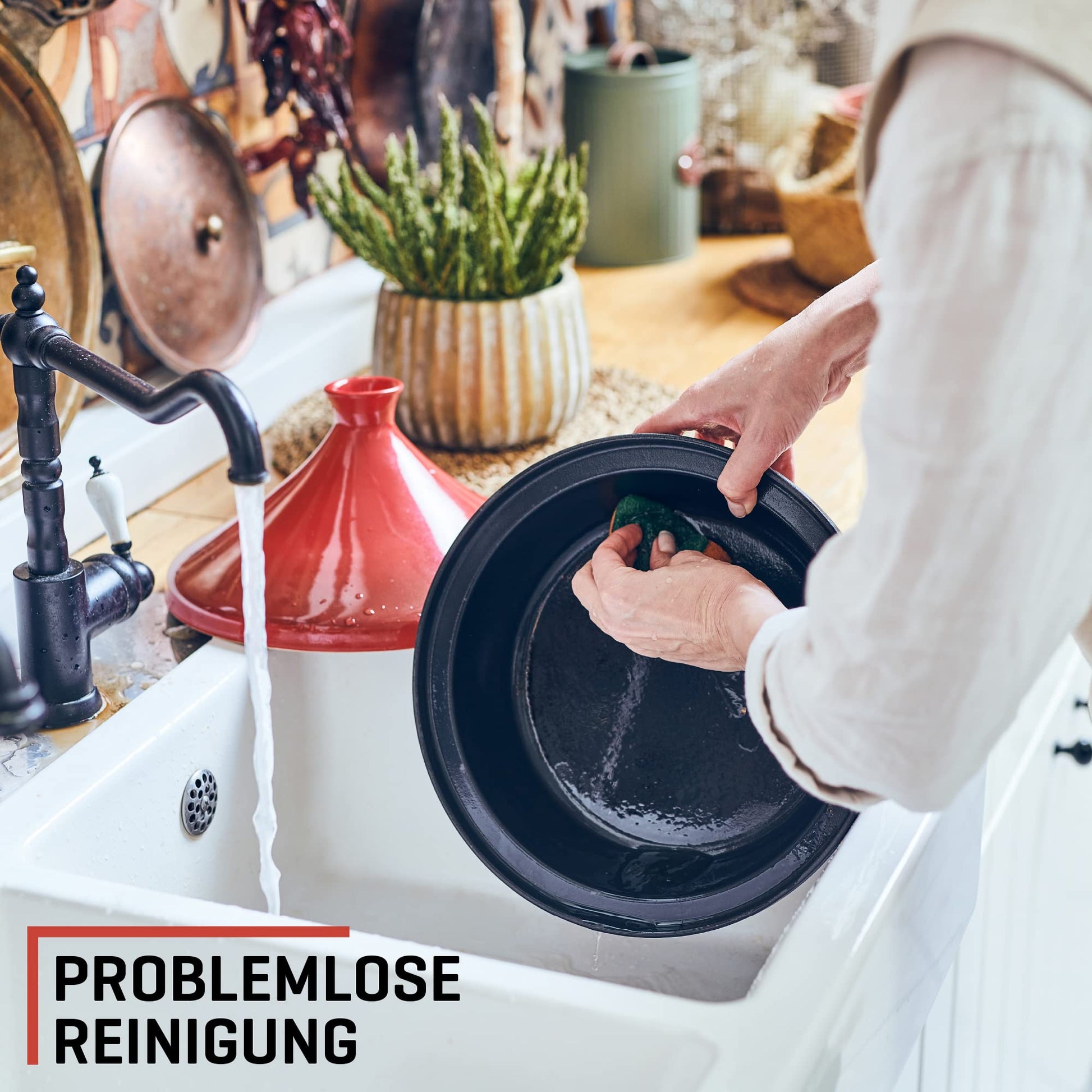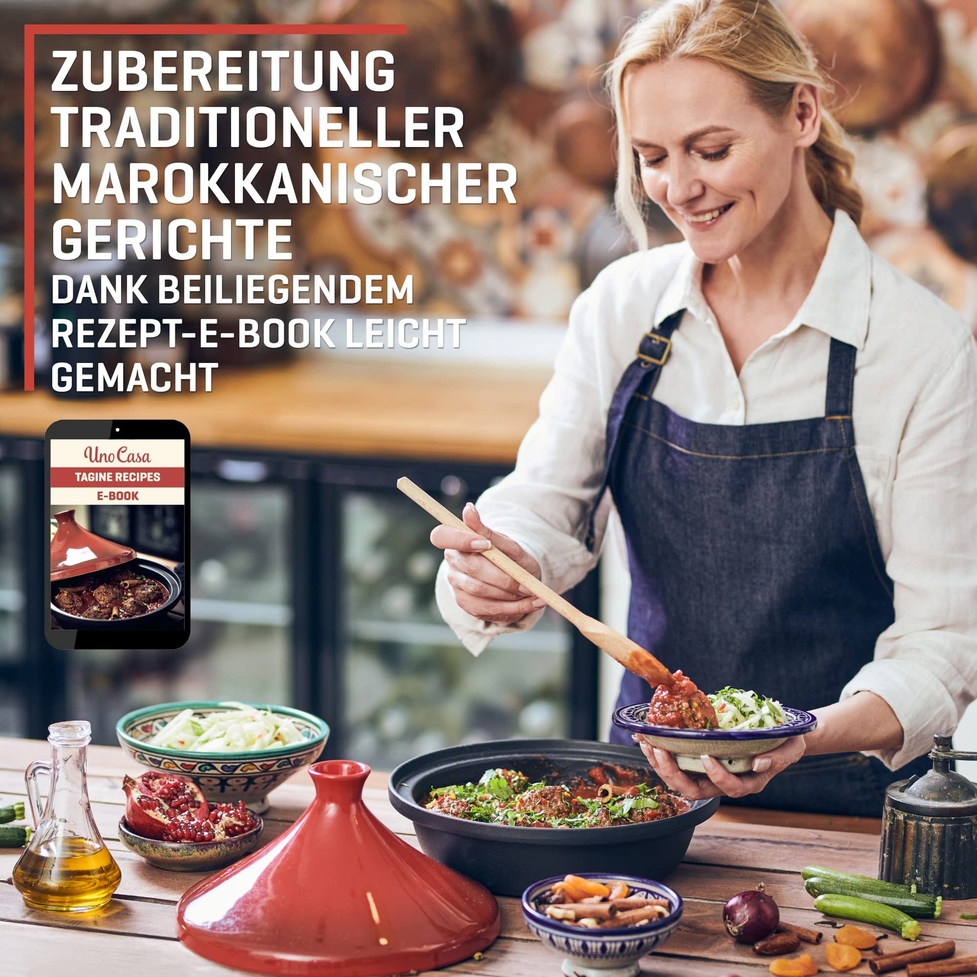 ["MOROCCAN TAGINE - Create a truly traditional Moroccan feast with this 4 liter Moroccan Tajine. Perfect for Moroccan dishes, slow-cooked stews and soups, casseroles and roasted meats, as well as many other Tajine recipes.","ENAMELED CAST IRON BASE - Our Tajine pot base is made of high-quality enameled cast iron to allow for lasting use and delicious meals, cooking foods more evenly and retaining heat longer. The oils you use naturally penetrate the pores, creating a smooth, natural, non-stick surface. No seasoning required!","CONE-SHAPED CERAMIC LID - Thanks to its unique design, the cone-shaped red ceramic lid retains moisture circulating during cooking, enriching the food with bold flavors. Delicious meals guaranteed!","FROM OVEN TO TABLE - Simply transfer your sizzling food from the stove to the table with the Tajine. It maintains heat consistently, ensuring that the food not only cooks evenly but also stays warm until ready to eat.","BONUS PAIR OF OVEN GLOVES - The wide rim allows you to easily and comfortably grip your Tajine pot. The included colorful pair of oven gloves protects your hands from heat up to 230°. Your cooking and serving experience will be safe and enjoyable!"]