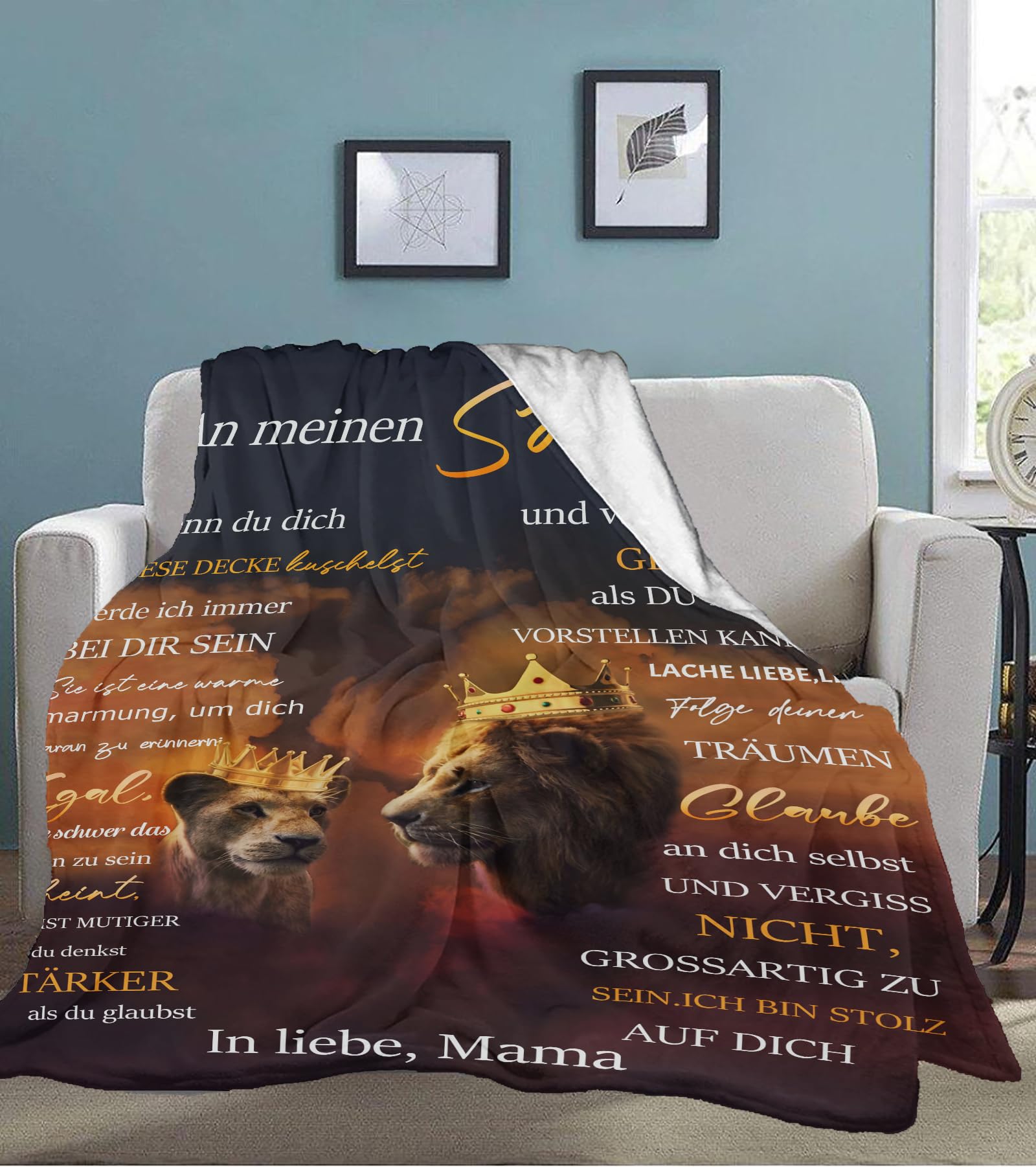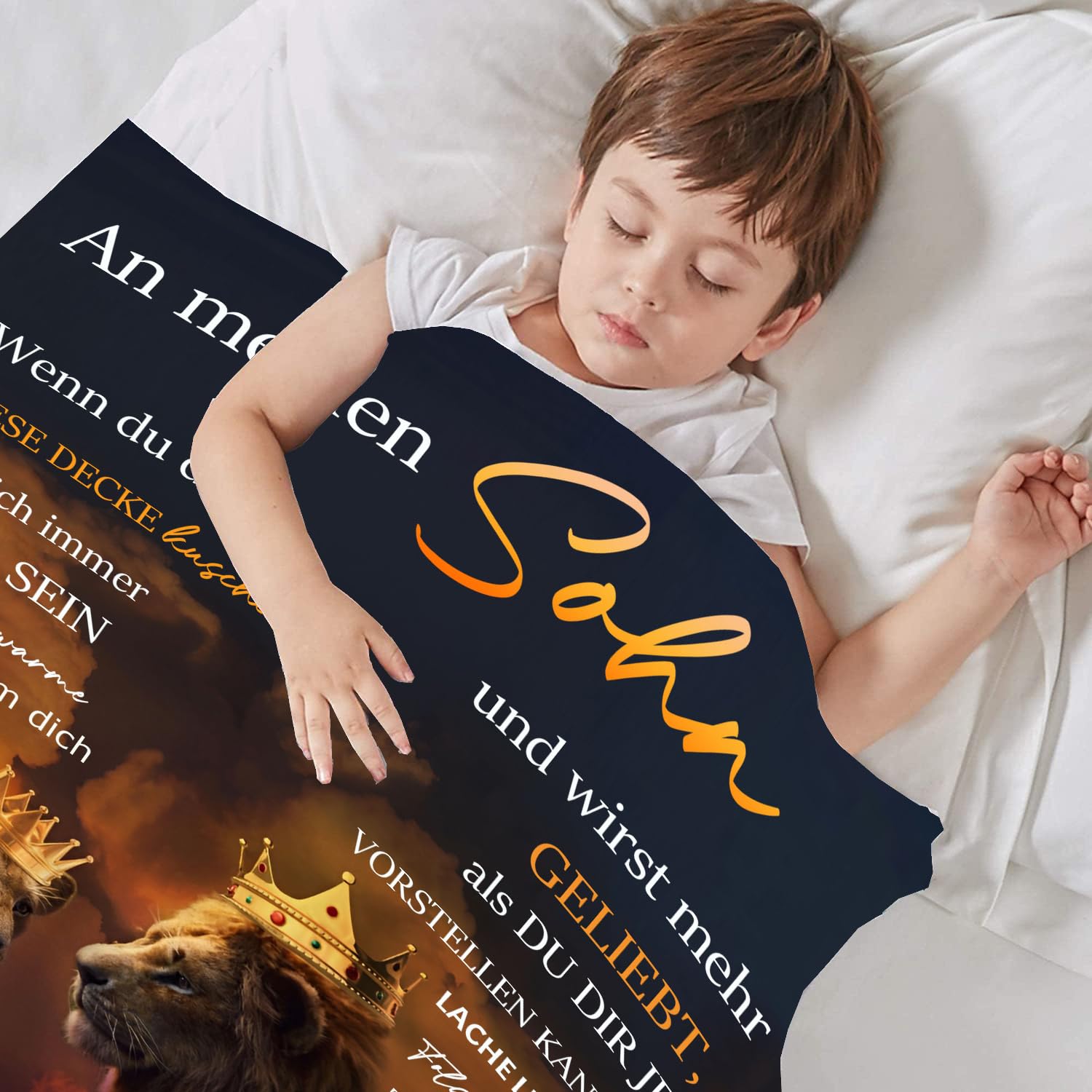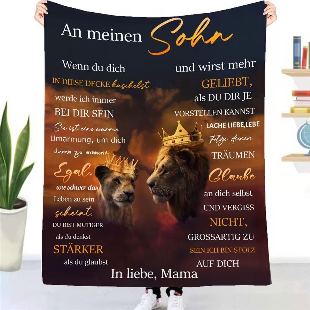 ["【PERSONALIZED BLANKET】: My son cuddle blanket Each quilt is printed with high-quality polyester that maintains beautiful color brilliance even after washing. The stitching pattern provides people with a comfortable, breathable, and luxurious feel, making the blanket suitable for year-round use.","【MOTHER SON GIFT】: Blanket gifted to my son lists words of love for our son in detail, such as encouragement, hugs, appreciation, love, and proud wishes for our son. This is a great help for their growth. When they are in a bad mood, when they are sick and their parents are not with their daughters, this blanket indirectly expresses your blessings and care for your children, but also brings smiles, courage, and a sense of love.","【MATERIAL】: To my son blanket in German, Cuddle blanket Microfiber, printed with an hypoallergenic cotton fabric that does not fade even after washing. The diamond stitch pattern conveys a sense of comfort, breathability, and luxury, suitable for use in any season. At the same time, the blanket is decorative. It is ideal for relaxing on the sofa or as a stylish bedspread.","【MULTIFUNCTIONAL】: Blanket with message As part of the bedding, you can read a book on the bed, relax on the sofa, and enjoy family happy time while watching the family's favorite TV show. The blanket is perfect for indoor and outdoor use, generating successive warmth in any season, making it perfect for camping and picnicking.","【Machine Washable】: Cuddle blanket son from mom's blanket Machine washable in cold water on a gentle cycle. Avoid direct heat. Do not use bleach. Made of non-shrink fabric."]
