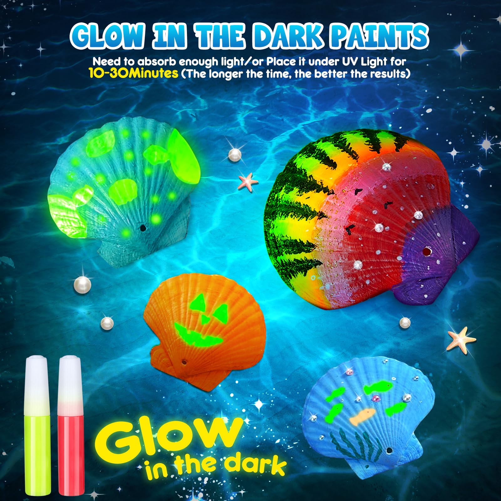 CRAFT KIT: Our Shell Painting Kids Kit includes eighteen shells, two colors of gold onion glue, two colors of glow-in-the-dark glue, five pairs of eyes, twelve 5ml paint colors, two brushes, a color palette, a heart diamond sticker + a pearl sticker, a bundle of string, a stiffened tube, a colored box, and instructions. Let your children's imagination run wild and stimulate their creativity.