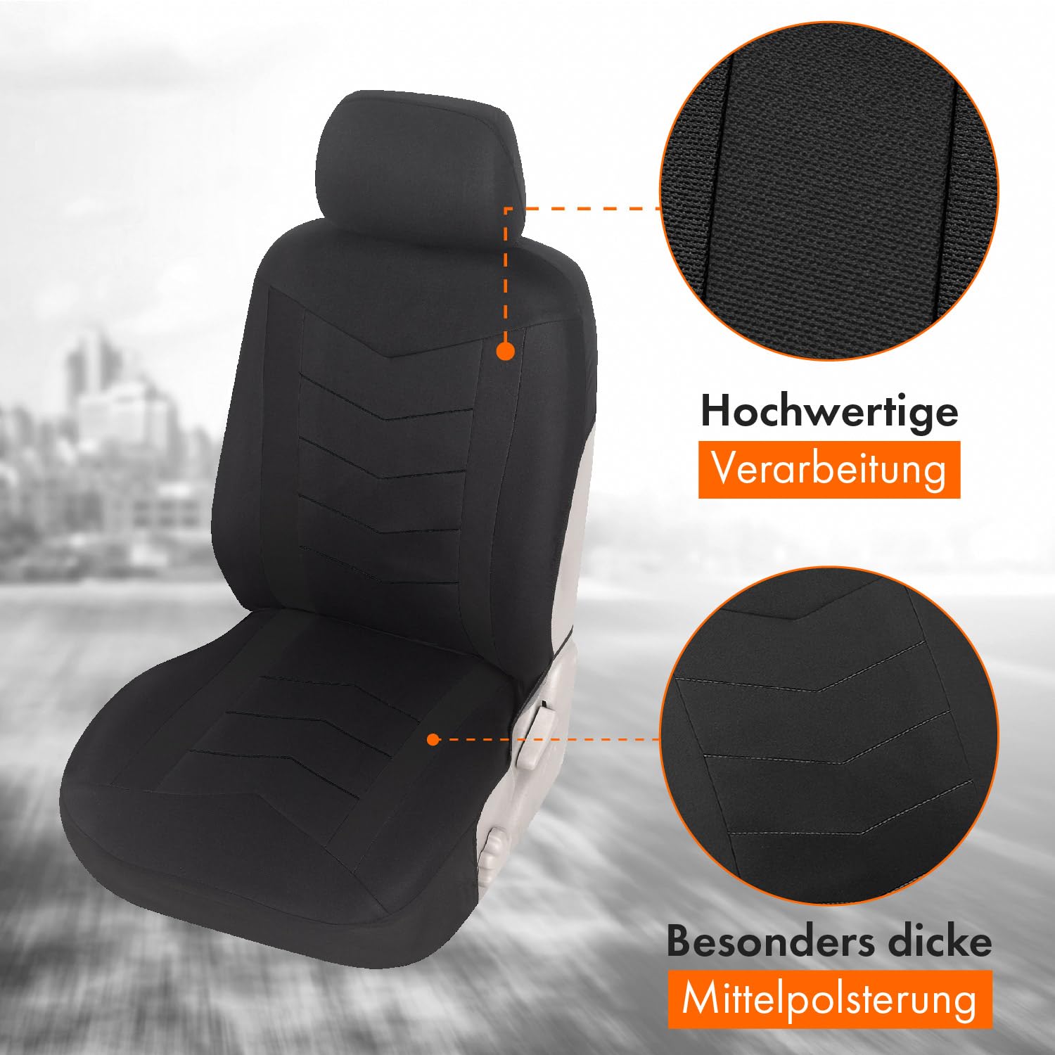 ["Upgrade4cars Car Seat Covers Set for the front seats - Your loyal companion for a comfortable driving experience | Highlights: Protects car seats from wear and tear, upgrades the vehicle interior, unbeatable value for money.","Material & Features: Black car seat covers with black stripes made of high-quality polyester with 8mm foam padding | Adjustable, easy to care for (machine washable at 30 degrees) & breathable.","Scope of delivery: 4-piece seat covers set for the front seats | 2 front seat covers + 2 headrest covers. The optimal installation process and further tips can be found in the installation manual. We are, of course, happy to assist you with any problems and questions.","Fit: Universal | Suitable for: Alfa Romeo Audi Bmw Citroën Dacia Fiat Ford Honda Hyundai Mazda Mercedes Mitsubishi Nissan Opel Peugeot Renault Seat Skoda Toyota VW and many more. As this is a universal product designed for a wide range of vehicles, optimal fit cannot be guaranteed for all vehicles.","Caution: Not suitable for vehicles with side airbags in the seat, seats with a continuous plastic cover (Headrests must be removable), sports seats & car seats with integrated armrest. Please try to avoid using force during installation, as the rubber bands could break under excessive tension."]