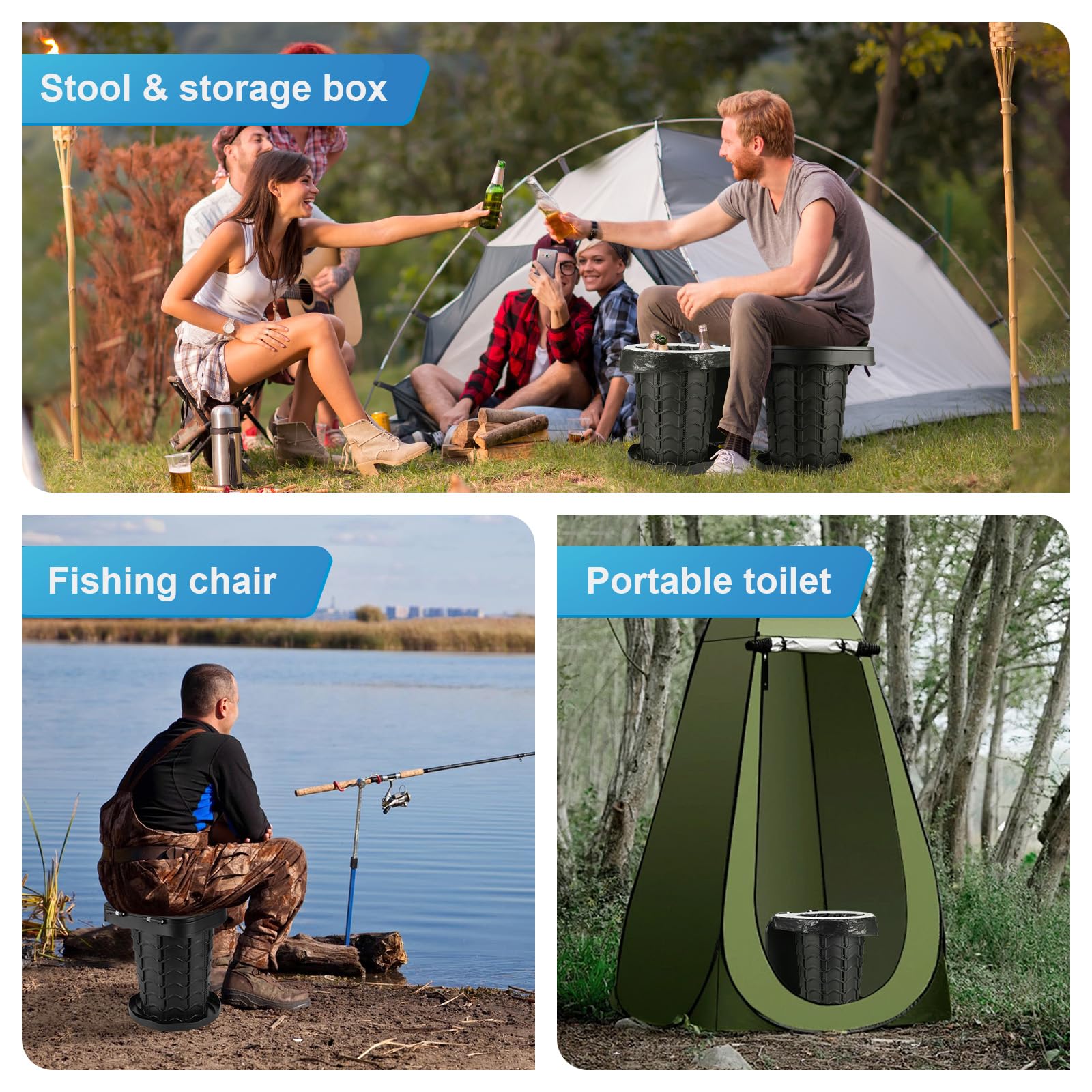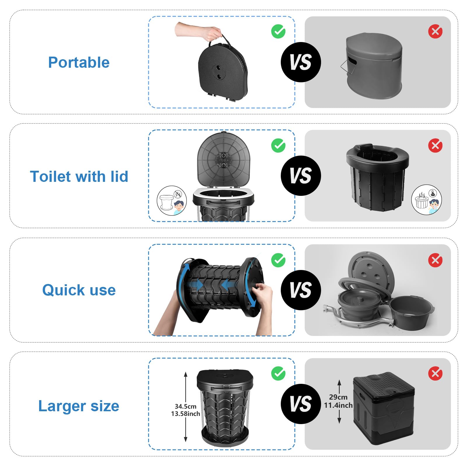 Upgraded camping toilet foldable with spring, includes lid and 10 trash bags. Ideal for camping, hiking, fishing, and parties. Supports up to 180kg.