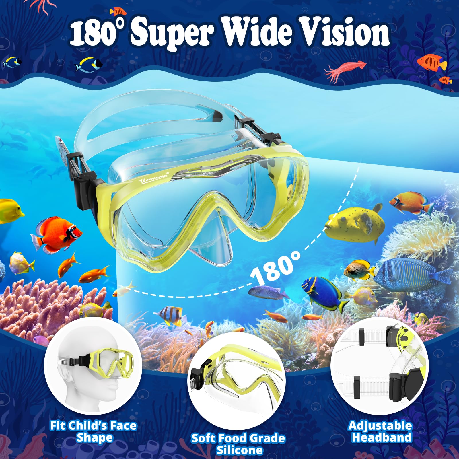 180° panoramic view and anti-fog: Enjoy maximum underwater visibility. Advanced tempered glass means your children will have a clear underwater experience. Qualified tempered glass can withstand the water pressure during snorkeling and diving, which is safer than ordinary glass. One-piece glass with anti-fog design allows for better and wider underwater view.