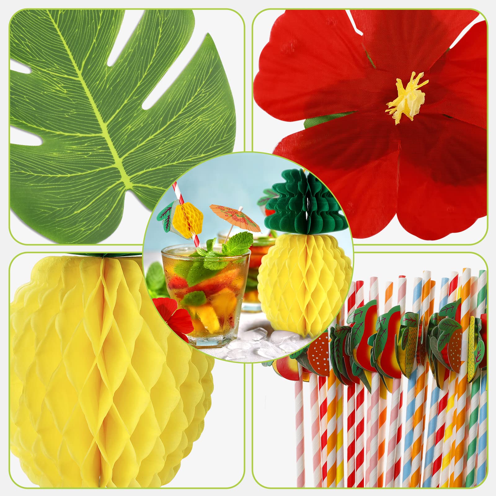 URBZUE Hawaii Party Decoration Set, 97PCS Tropical Party Decoration Set, Hawaii Luau Table Skirts, Garlands, Palm Leaves, Pineapple Flamingo Umbrella Fruit Straw Combination for BBQ, Garden Summer