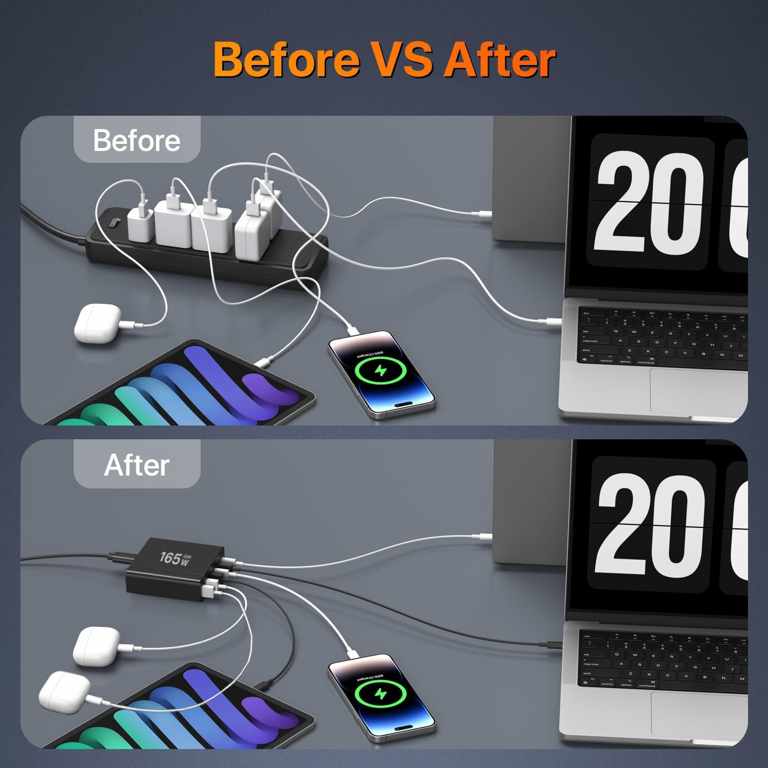 ["đăHigh-Speed Desktop Charging StationăPortable 6 USB Charger, 4 USB C PD 3.0 Ports (USB-C1: 65W, USB-C2: 20W, USB-C3: 20W, USB-C4: 20W) + 2 USB-A Ports (USB-A1: 20W, USB-A2: 20W), total up to 165W, (compatible with almost all smartphones, iPad, laptop, tablet, watch, earphone, Power Bank, Electric Fan) Fast and safe charging, meets various user needs.","đă165W High-Speed ChargingăThe USB-C1 port supports a maximum output power of 65W. Our USB C Charger can simultaneously fast charge up to 6 devices at once, from smartphones to tablets to USB-C laptops. The fast charger USB C automatically recognizes the connected devices and charges them at the optimal level to minimize waiting times and free you from messy chargers with different interfaces.","đăNew GaN TechnologyăThe 165W charger uses Gallium Nitride (GaN) technology, which is smaller than conventional multi-port adapters while ensuring fast, safe charging and more efficient energy transfer. In addition, the PPS fast charging protocol protects the health of the device battery and extends its life Protect your devices from overheating and overcurrent for a hassle-free charging experience.","đăSuperior DesignăCompact size and lightweight design make it easy to be the best charging companion for your electronic devices wherever you are. 6-Port USB Charger can be used for school, office, home, travel. Make your life convenient and comfortable, takes up little space and can be easily carried in your pocket, handbag, luggage, very easy to carry.","đăWhat You Getă1 x 165W charger with 6 ports, including 1.2m AC cable. We promise to provide every customer with a 100% satisfactory shopping experience. If you have any questions about your purchase, please feel free to contact us. We will provide you with a professional and detailed response within 12 hours."]