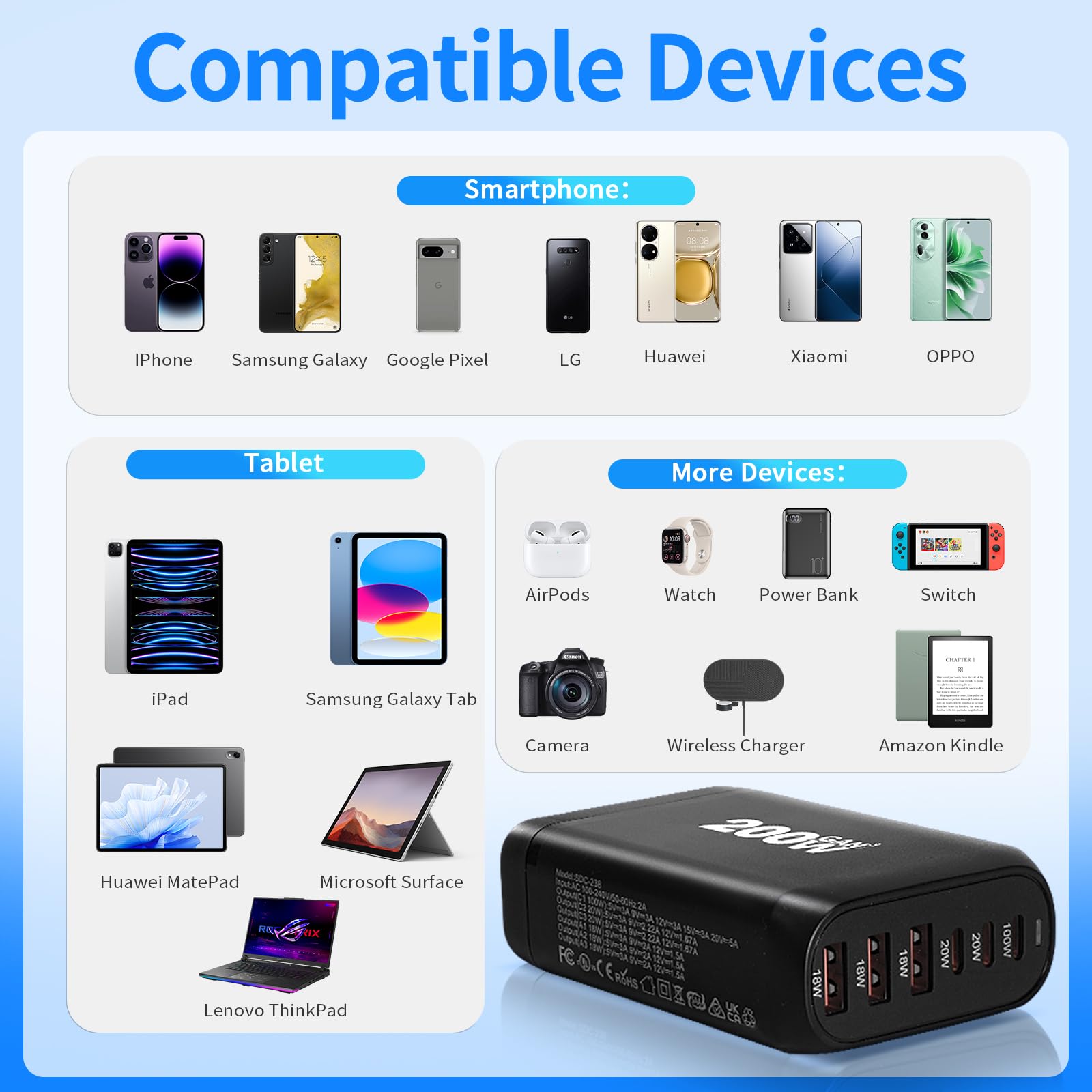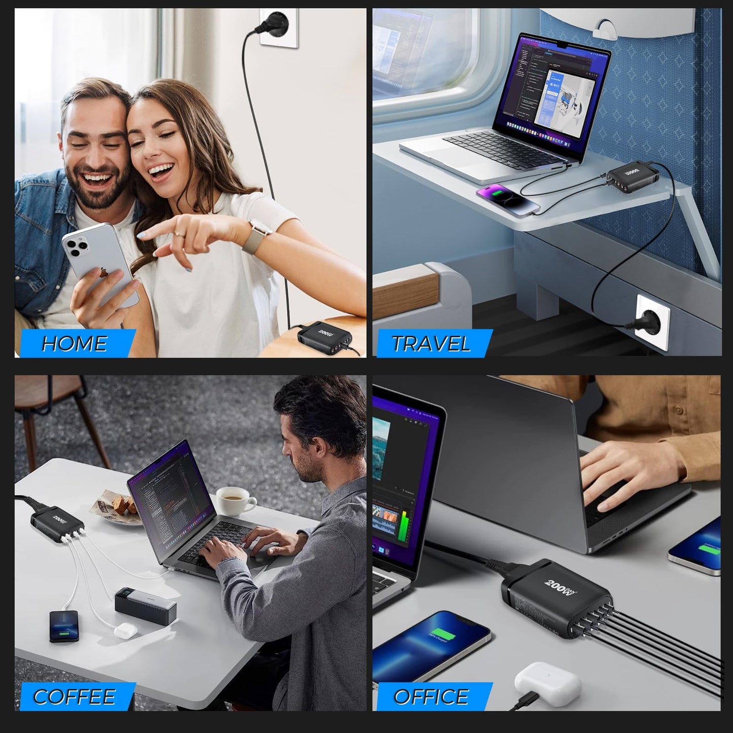 ["200W USB-C Fast Charger: 200W usb charging station supports Power Delivery 3.0, Quick Charge 4.0+/3.0, SCP, AFC, 5V/2.4A, Galaxy PPS fast charging. MacBook Pro 16 charges from 0-60% in just 30 minutes, reducing the waiting time for charging.","6-Port Multi Charger: The usb charger multiple adapter comes with 3 USB-C (max. 100W) and 3 USB-A (max. 18W) power adapters to charge up to 6 devices simultaneously. Comes with a 1.5m long extension cable for unlimited charging regardless of distance.","Universal Compatibility: USB C charging station is compatible with almost all electronic devices due to the uniqueness of the interface. For example: Compatible for MacBook Pro/Air, iPad Pro/Air, iPhone 16/16 Pro/15/15 Pro Max/14/14 Mini/14 Pro Max, Galaxy S23/S22/S21/S20/S20+/S10/S10+ series, laptops, tablets, Switch, Steam Deck, Google Pixel, Huawei Mate/MatePad/Nova, headphones, smartwatches, and many other devices. Ideal for home, office, travel, and business trips.","Safe and Reliable: USB C charger multiport is made of flame-retardant material. Uses GAN chip technology to effectively reduce power consumption and drastically improve charging efficiency. Built-in protection against short circuit, overvoltage, overheating, overcurrent, overpower, and overcharge. Charging stops when the battery is full, ensuring safe charging of your device and prolonging battery life.","Compact and Portable: The compact size of the multi usb charger saves you 50% space and easily fits in pockets, handbags, and suitcases. The compact and lightweight design allows for charging multiple devices wherever you are. A single charger is enough, takes up little space, and is easy to carry."]