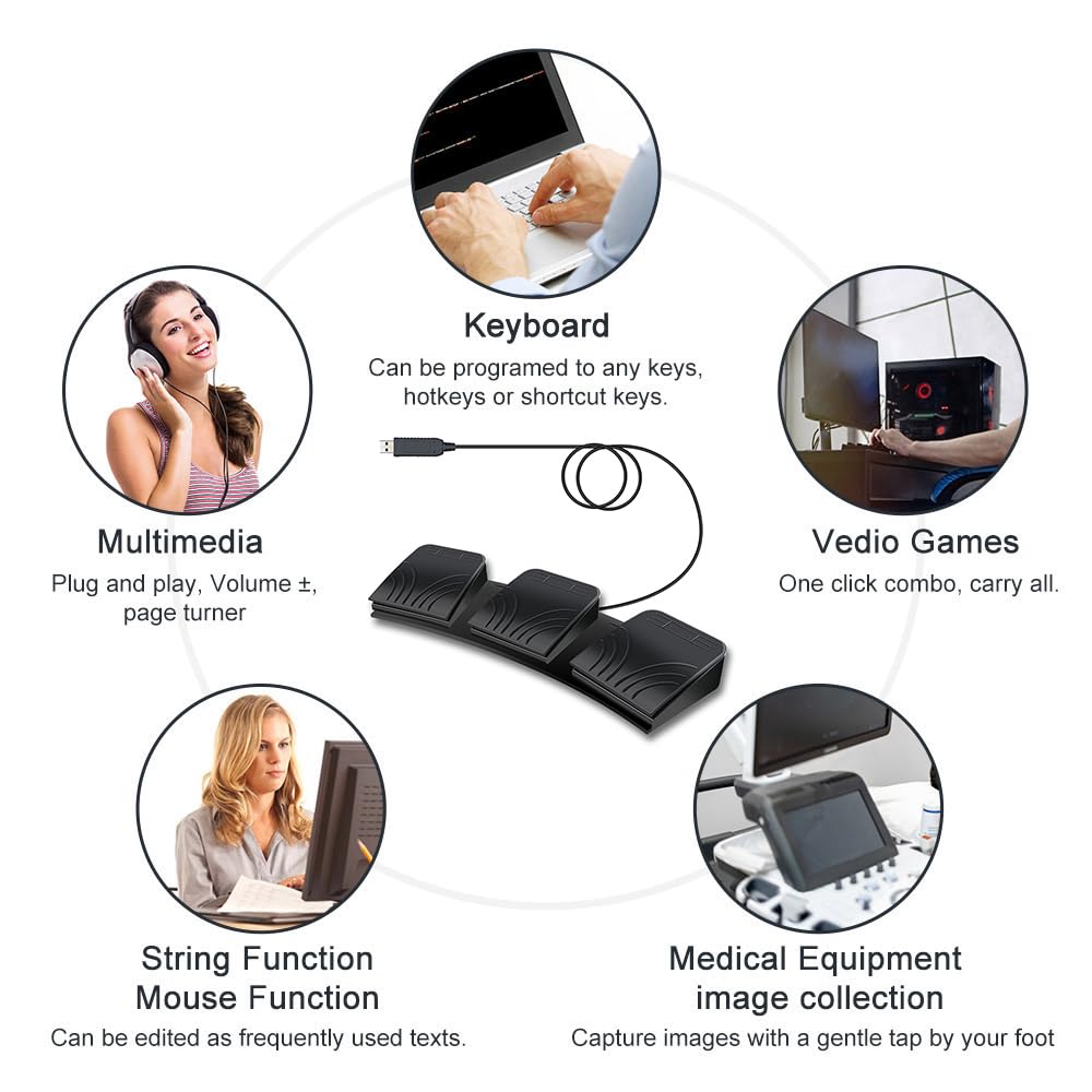 ["Improved 3-foot switch With wide pedal, optical switch, and USB foot switch, it is a standard HID device and programmable keyboard and mouse triggered by your foot. The optical switch is quiet and easy to press.","USB connection, plug, and play Can be configured as any key combinations such as single, combination, multimedia key, etc. by corresponding software. Once the pedal function is defined, it can be used in different operating systems.","Non-slip design: There are 4 TPU rubbers that can be used on hard floors. The non-slip bottom ensures it stays right where you want it, no sliding around.","One for all Adapt to Dos, Win 2000/XP/7/10/Linux/Mac/Android. You need to install and set up the driver on a Windows computer for what you want to do. Once set up, then plug it into your Mac or another system.","Widely used It is used for playing games, factory testing, controlling instruments, supporting disabled people, and more. You can use it with hands or feet for more efficiency, play freely."]