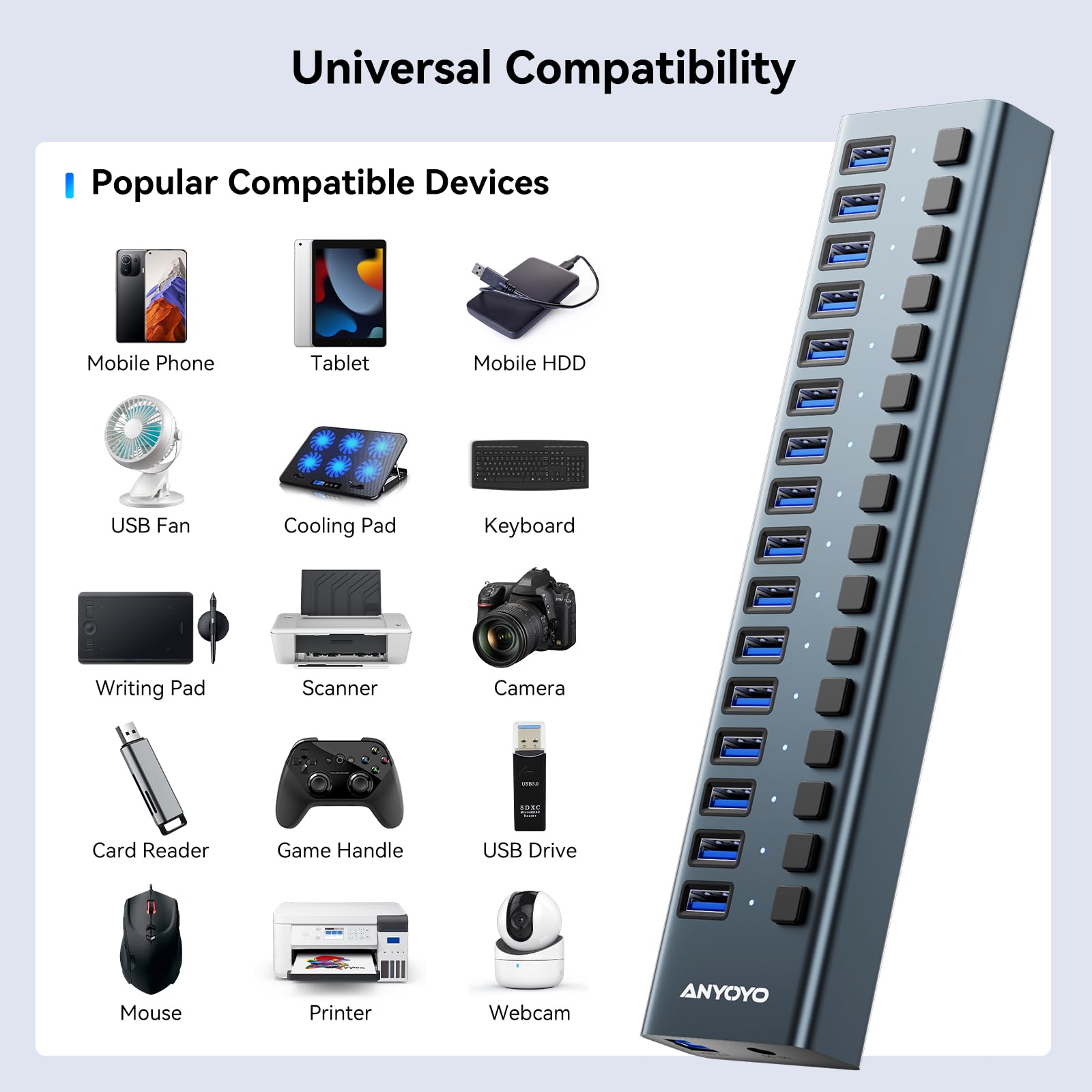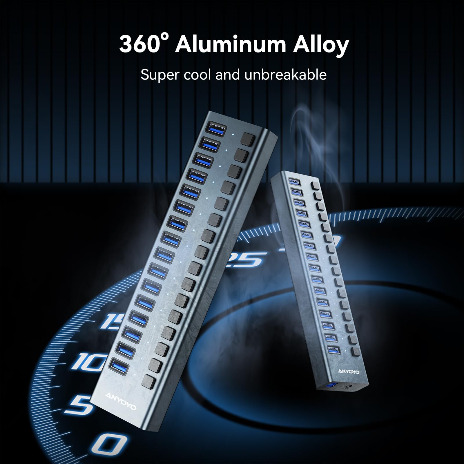 ["【16 x 10 Gbit/s Port】 The ANYOYO USB 3.1 Hub is 10 times faster than USB 2.0. This USB Hub Active 3.1 with power supply expands your computer to 16 x 10 Gbit/s ports, allowing you to connect 16 devices such as hard drives, printers, scanners, webcams, mice, and keyboards. It is ideal for video editors, musicians, graphic designers, and gamers to expand your connectivity options. NOTE: Cable B to C can reach 10 Gbit/s, while Cable B to A only reaches 5 Gbit/s.","【90 W powerful performance】 The USB Hub with 90 W (12 V/7.5 A) power supply provides not only a charging power of up to 2.4 A, but also ensures a more stable data transfer. This USB Hub actively charges with up to 5 V/2.4 A per port. Note: Not recommended for charging.","【Full aluminum alloy】This USB Hub 3.1 (3.0) with power supply features a sleek aluminum alloy design for optimal heat dissipation and accommodates 16 interfaces without overheating. Each port has an independent switch for flexible control, while LED indicators provide clear status updates.","【Built-in overvoltage protection】 This USB Hub 3.1 protects your devices and data and supports hot swapping. The external power supply ensures that multiple devices can work simultaneously.","【Package includes】16 Port USB 3.1 (3.0) Hub, B to C/A (100 cm), 90 W (12/7.5 A) power supply (120 cm). NOTE: Cable B to C can reach 10 Gbit/s, while Cable B to A only reaches 5 Gbit/s."]