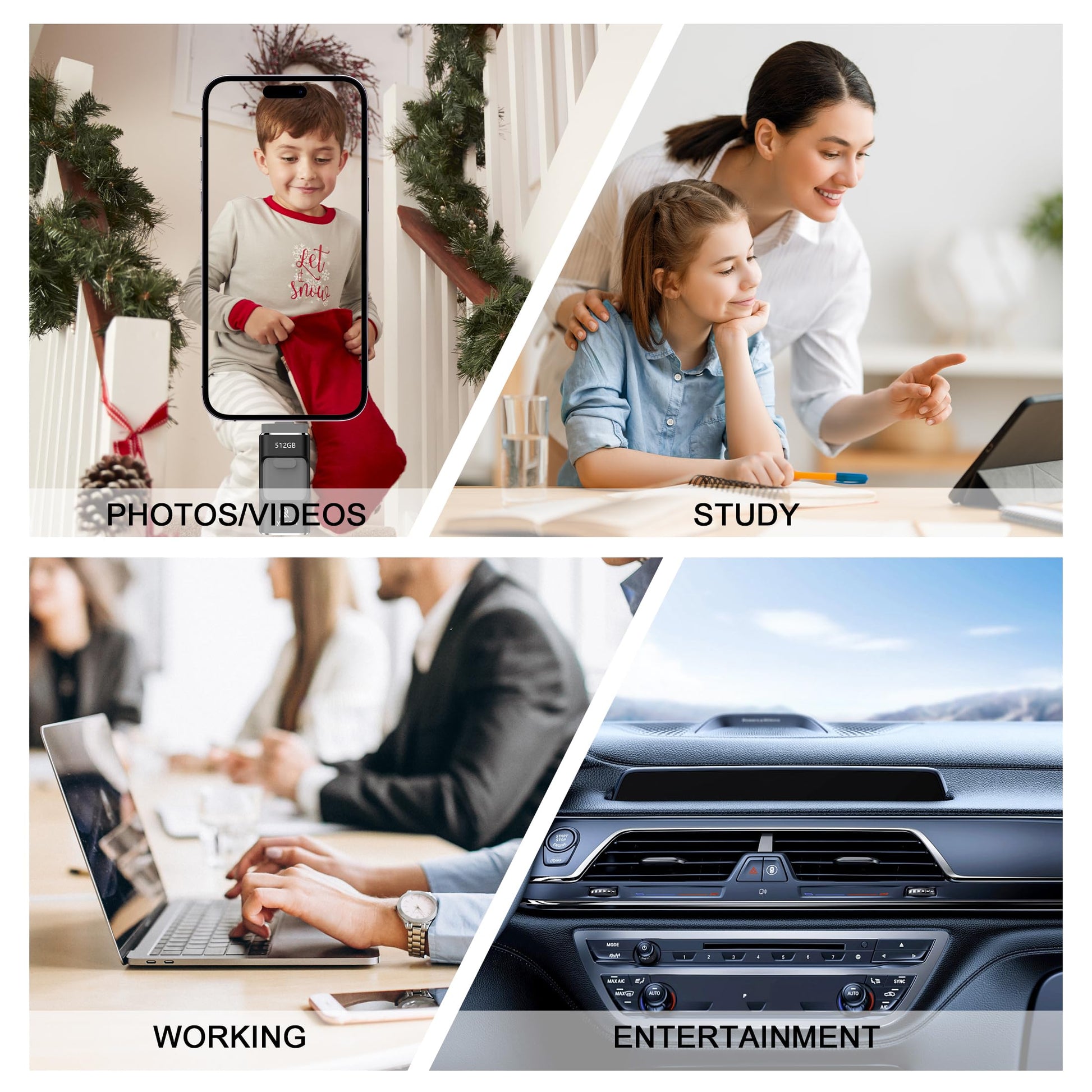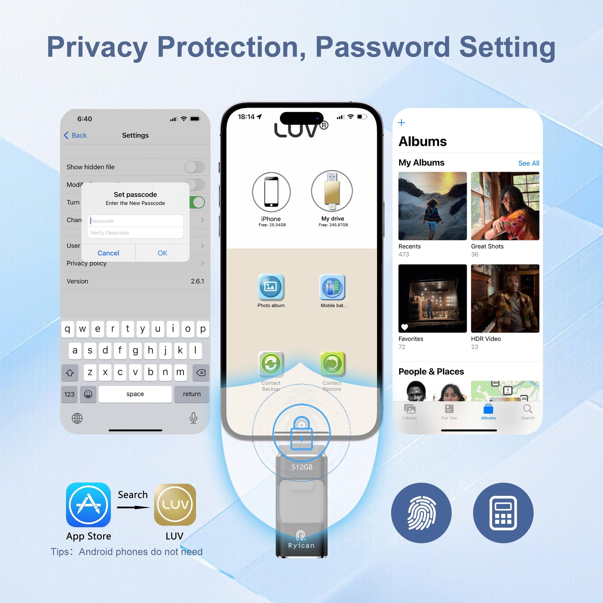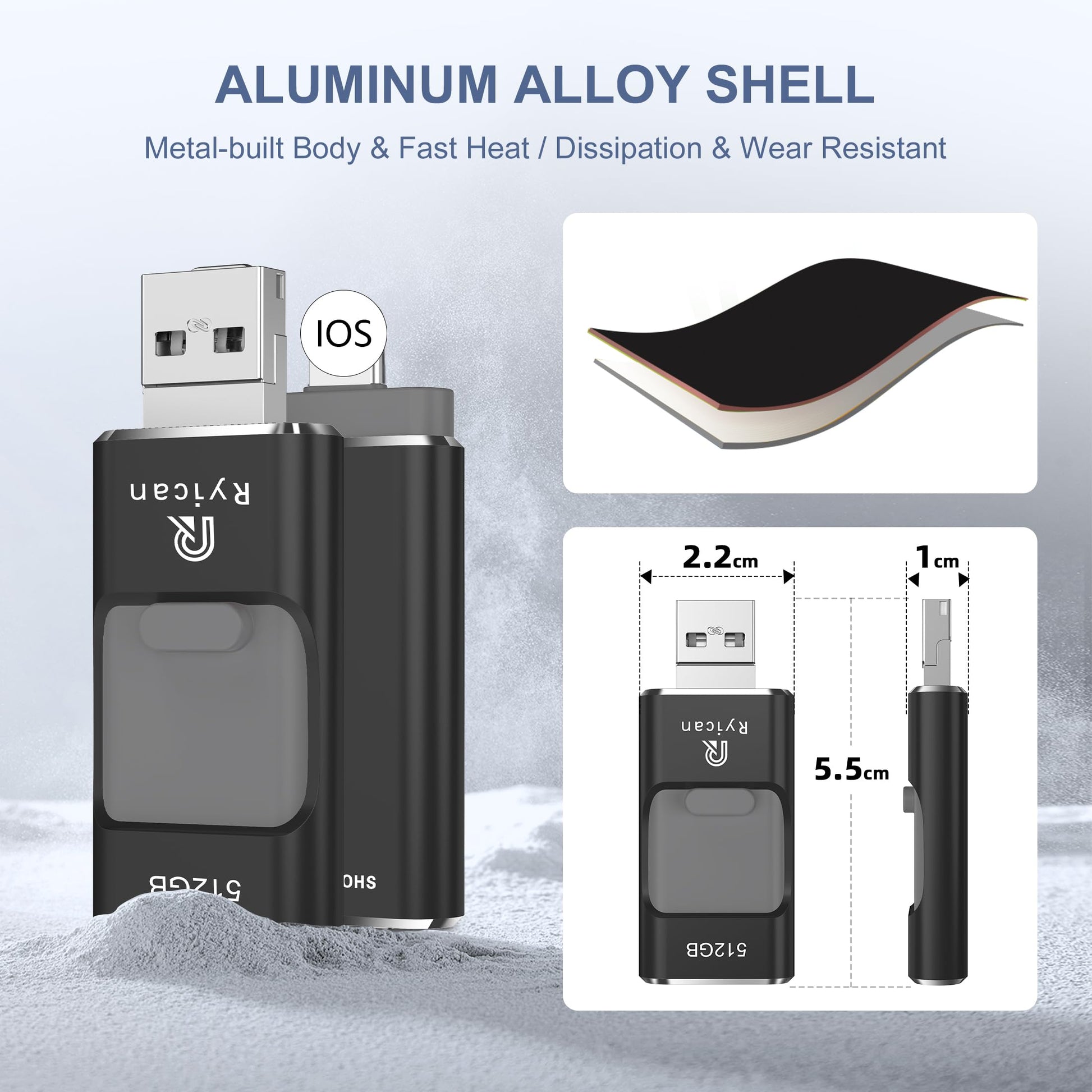 ["4-in-1 USB Stick - Compatible with almost all devices】 Ryican USB Stick Phone offers four connection options: iOS, USB, Type-C and Micro USB. Ideal for PCs, Android smartphones, tablets, and iOS devices. This external storage phone ensures seamless data transfer. Store photos, videos, documents, and more with just one device. A universal companion for all your digital needs.","Solution for storage problems - More space for your memories】 Do you suffer from lack of storage on your smartphone? The password-protected USB stick offers the perfect solution. Simply connect the stick to your phone or pad, and you can save or play photos, videos, and documents directly on it. No more expensive iCloud subscriptions - this USB stick iPhone gives you the freedom to manage your data safely and efficiently. Ideal for travel photos, work files, or study materials.","Powerful technical support password protection function】 The USB stick Phone 512gb storage expansion features powerful data security technology, the password and touch ID can encrypt file information in the app to protect your private files, you can choose whether to encrypt the entire USB flash drive or choose to encrypt a specific file. Don't worry about others stealing your files.","🚀[Fast transfer via USB 3.0, no Wi-Fi required] This USB Stick Phone uses a 3.0 processor and the latest technology, making it faster than traditional USB ports. You can access your data anytime and anywhere without a network connection. Share photos stored on the 512GB USB stick directly with your friends via Instagram, Facebook, etc.","【1 year warranty and reliable customer service】 The USB Stick Phone is made of high-quality materials. In addition, the storage stick Phone offers a 1-year warranty and has been optimized through numerous quality tests to ensure durability and reliability. With a detailed user manual and reliable customer service, the Ryican USB Stick is the ideal choice for those seeking security and convenience.","With the Ryican USB Stick, you not only get a powerful external storage iPhone, but also a versatile tool for your digital needs. Whether you're backing up data, sharing photos, or freeing up storage space - this storage stick iPhone is your perfect companion!"]