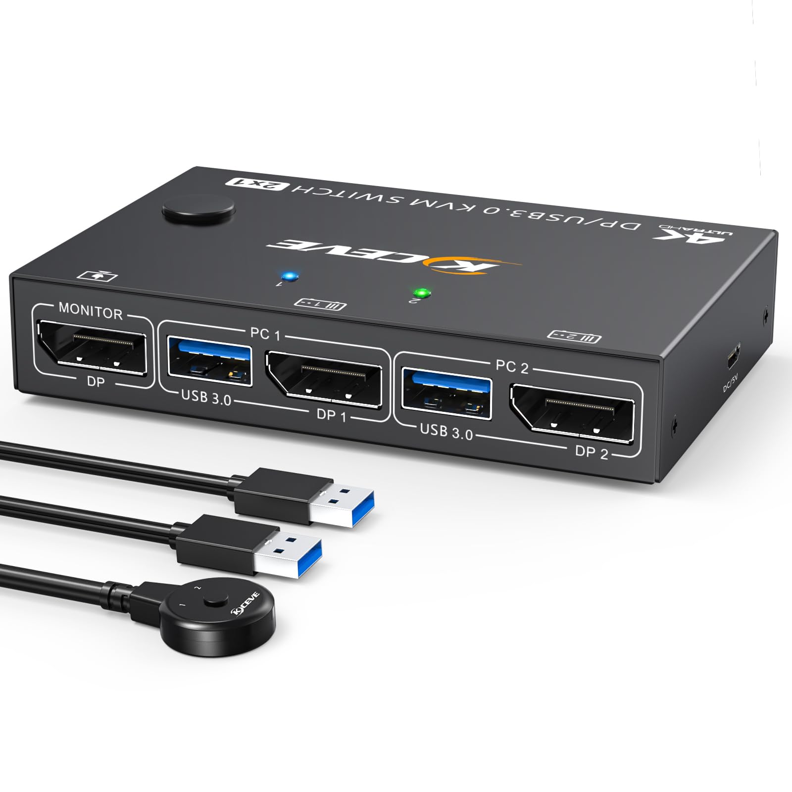USB3.0 KVM Switch Displayport 2 Ports 4K@144Hz, ESKEVE KVM Switch 2 PC 1 Monitor 8K@30Hz for sharing 1 monitor and 4 USB3.0 devices between 2 PCs. Includes USB cable and desktop controller.
