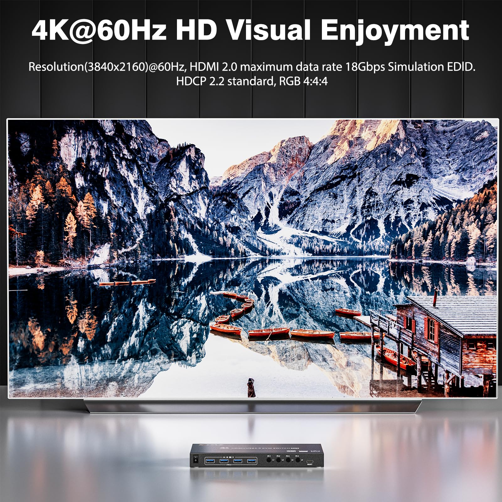 ["【KVM Switch 4 PC 1 Monitor】ESKEVE KVM Switch HDMI supports 4 PCs sharing one monitor and 4 USB 3.0 devices. You can easily switch keyboard, mouse, USB flash drive, printer, and HDMI input between the two devices, making your desk tidier and work more efficient. This HDMI KVM Switch has 4 HDMI2.0 ports, 4 USB3.0 ports, only one set of USB keyboard and mouse, allowing you to control 4 computers at the same time, share one monitor, switch between 4 computers easily, suitable for education, conference training, audiovisual entertainment, and other fields.","【4K@60Hz HDMI KVM Switch】This HDMI KVM Switch supports resolutions of 4K@60Hz, 2K@120Hz, and 1080P@240Hz. This switch is compatible with HDMI 2.0, HDCP1.4/2.2, 3D, CEC, RGB 4:4:4, and other functions. With HDR technology, the image quality is more detailed and lifelike, and the colors are more vivid, allowing you to enjoy visual pleasure seamlessly.","【USB3.0 KVM Switch】This KVM Switch has 4 USB ports and supports connection of 4 different USB devices. The data transfer rate can reach 5Gbps and is backward compatible with USB 2.0 and USB 1.1 devices.","【Simulation EDID & Stable Operation】The HDR EDID function of the KVM Switch 4 PC 1 Monitor is very useful as it can automatically adjust the monitor settings for better resolution and refresh rate. This ensures that you always receive the best image quality. Switch the screen without damaging the original window. HDMI KVM Switch comes with a DC12V power adapter. Please connect the power adapter first to ensure stable operation during use.","【Wide Compatibility & Easy to Switch】KVM switches are driverless, plug and play. All computers and other devices with HDMI ports are perfectly compatible. Supports PS4, Xbox, HDTV, and other popular devices, compatible with Windows 10.7.2000.XP.Vista, Linux, UNIX, Ubuntu, Fedora, and other mainstream operating systems. One-touch control of the switch is supported so you can turn it on or off. You can also switch the computers through the control panel switch and desktop controller (included). Switching only takes 3-5 seconds and is quick and easy.","【100% Quality Service】ESKEVE This HDMI KVM Switch with four inputs and one output includes 1 x KVM switch, 1 x DC12V power adapter, 4 x USB 3.0 cables, 1 x HDMI 2.0 cable, 1 x desktop controller, 1 x user manual. Note: When using the KVM switch, each computer must have 1 HDMI2.0 cable + 1 USB3.0 cable connected to the KVM switch. Offers 12 months warranty. If you have any questions about the KVM Switch 4 PC 1 Monitor, please contact us. ESKEVE provides full customer service (including technical support and replacement)."]