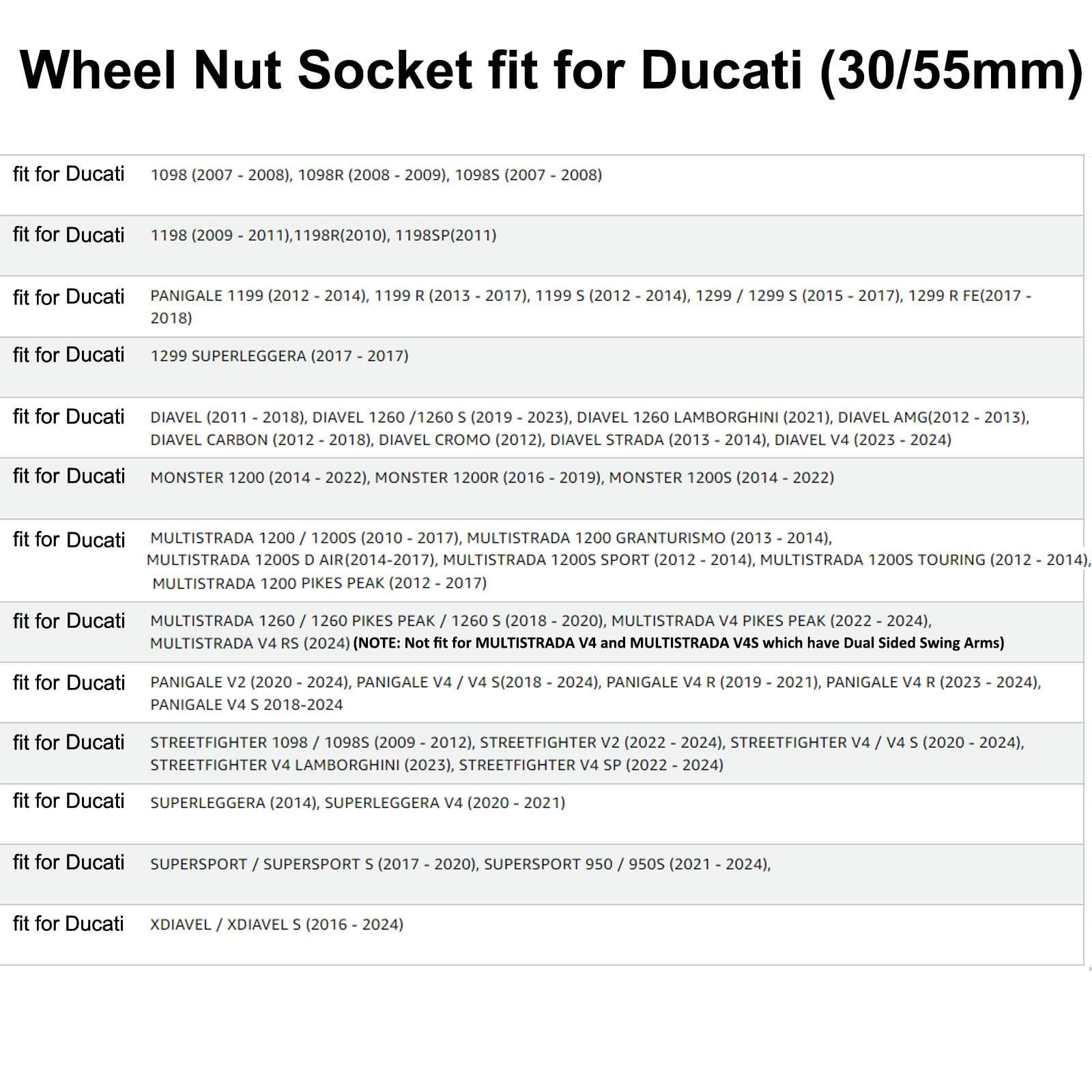 ["Fits Ducati Super Bike 1098, 1198, 1199, 1299, Panigale, Street Fighter 1098, Multistrada 1200/1260, Monster 1200 and Diavel.","Combination socket for wheel axle nuts: 12-point, 55mm for rear axle; 6-point, 30mm for front axle.","Made of quality steel, material indestructible, rust resistance, corrosion resistance, and durability.","This wheel impact socket is suitable for use with a 1/2-inch impact wrench to remove both rear and front fasteners that are over tightened or partially seized.","100% SATISFACTION GUARANTEE: If you have any problem, feel free to contact us, we will respond within 24 hours."]