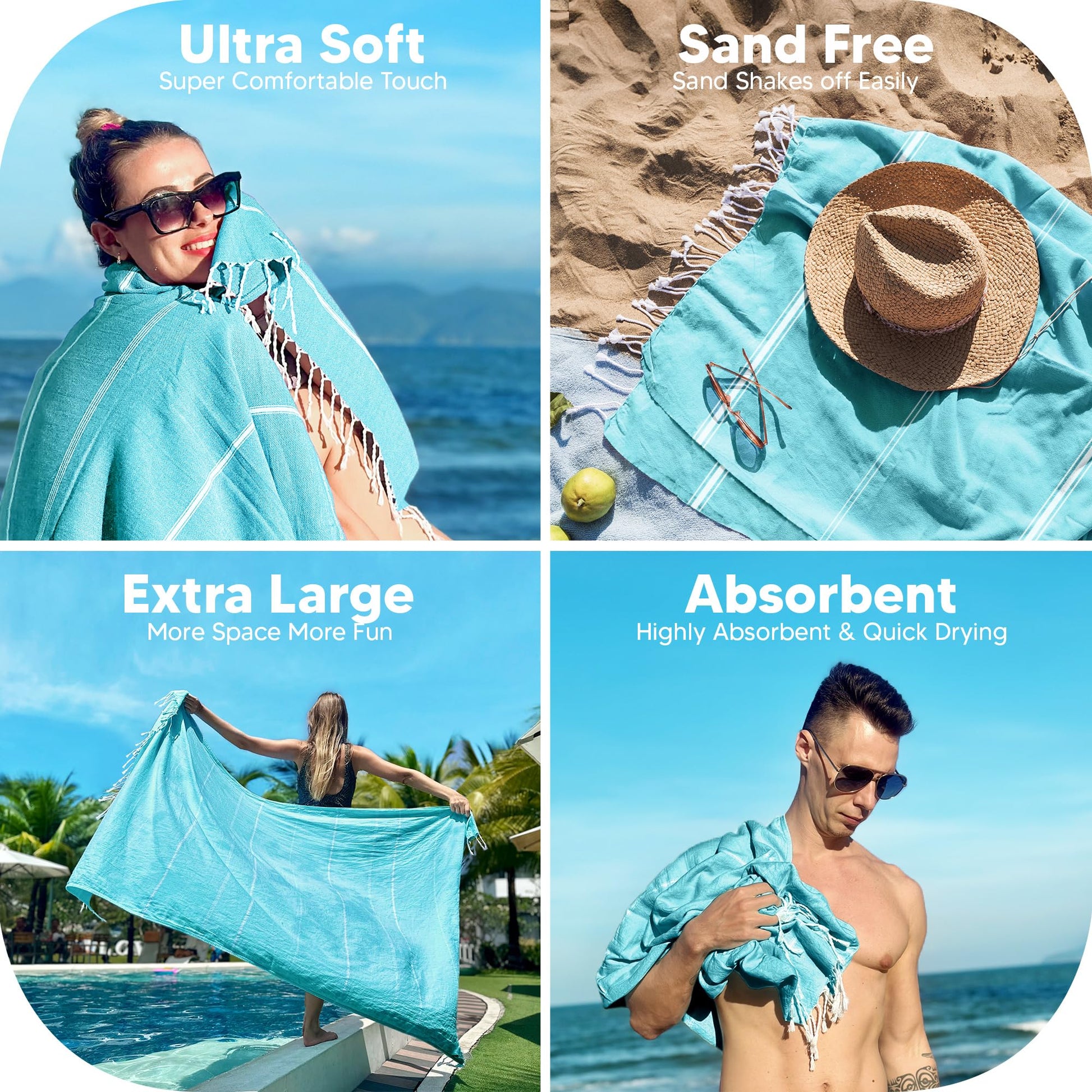 ["2 Pieces - The set of 2 Turkish beach towels measuring 100 x 180 cm. They are super comfortable to use and offer maximum absorbency.","Luxurious Quality - Made of 100% premium cotton fabric, the large beach towel is designed to absorb more water and dry quickly. Our plush towels will keep you feeling fresh all day long.","Stylish, soft and compact - elevate your summer with our quick-drying beach towels, as they are an elegant addition to any setting. The towels are very soft, super handy and portable.","Practical - the sand-free beach towel is very functional, can be neatly rolled up to fit in your bag or closet. Perfect for bathroom, beach, spa, pool, gym, yoga, travel, camping, and other versatile preferences.","Care Instructions: It is recommended to wash the towel in the machine before use and air dry."]